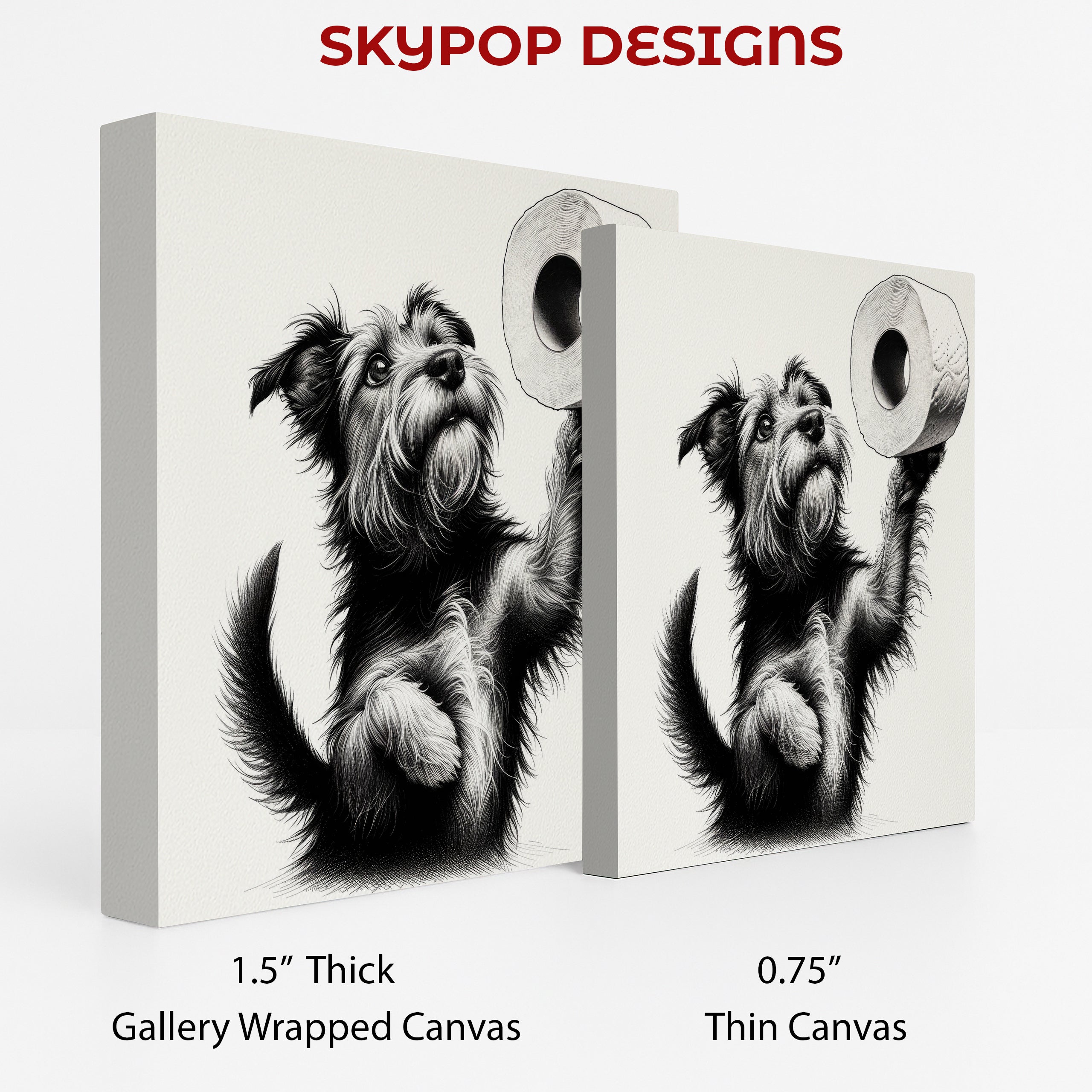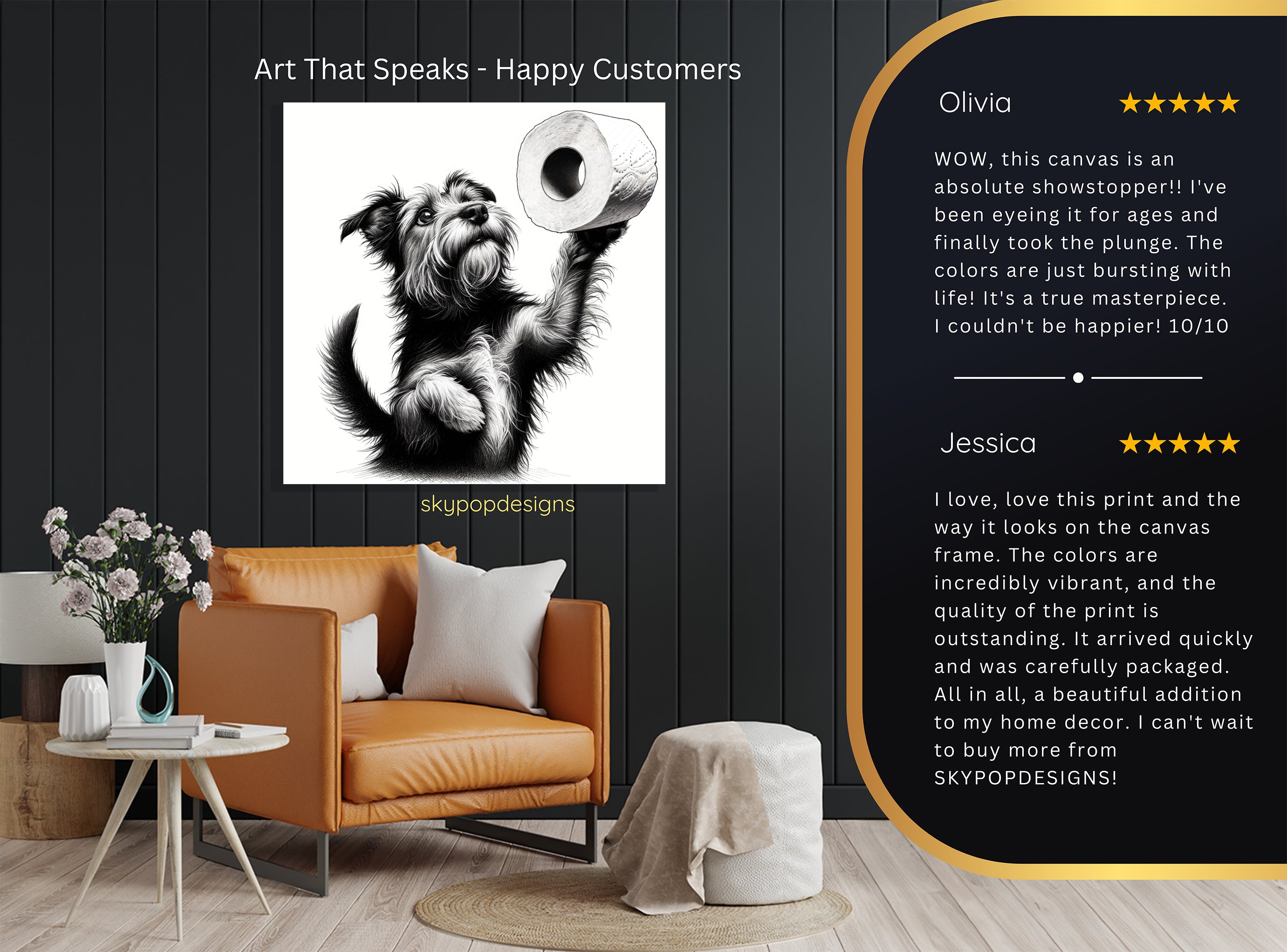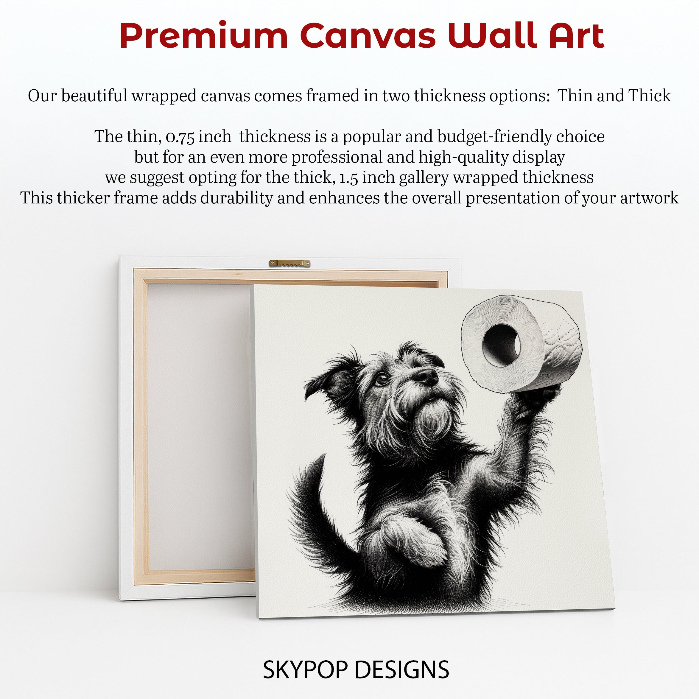 Elevate your home decor with this unique Miniature Schnauzer canvas wall art, featuring a charming dog holding a roll of toilet paper. This striking black and white poster showcases a detailed sketch that adds personality and humor to any space. The contemporary style of this wall art is perfect for transforming your living room or bedroom into a cozy and inviting area. It’s an ideal piece for modern and minimalist decor, bringing a touch of whimsy. The monochromatic palette enhances its versatility, making it a great addition to bohemian or even Scandinavian-inspired rooms. This captivating piece works wonderfully as a stand-alone statement or as part of a gallery wall, offering a conversation starter. It's the perfect gift for dog lovers, housewarmings, or birthdays, bringing smiles and warmth to the recipient's home. The high-quality print on canvas captures the intricate details of the dog's fur and the texture of the toilet paper, ensuring a premium look and feel. This versatile artwork is suited for various rooms, including bathrooms, entryways, or even a fun addition to a home office. Make a statement with this playful dog poster that effortlessly blends artistic texture with lighthearted subject matter. Brighten your walls and express your love for dogs with this delightful canvas print today.