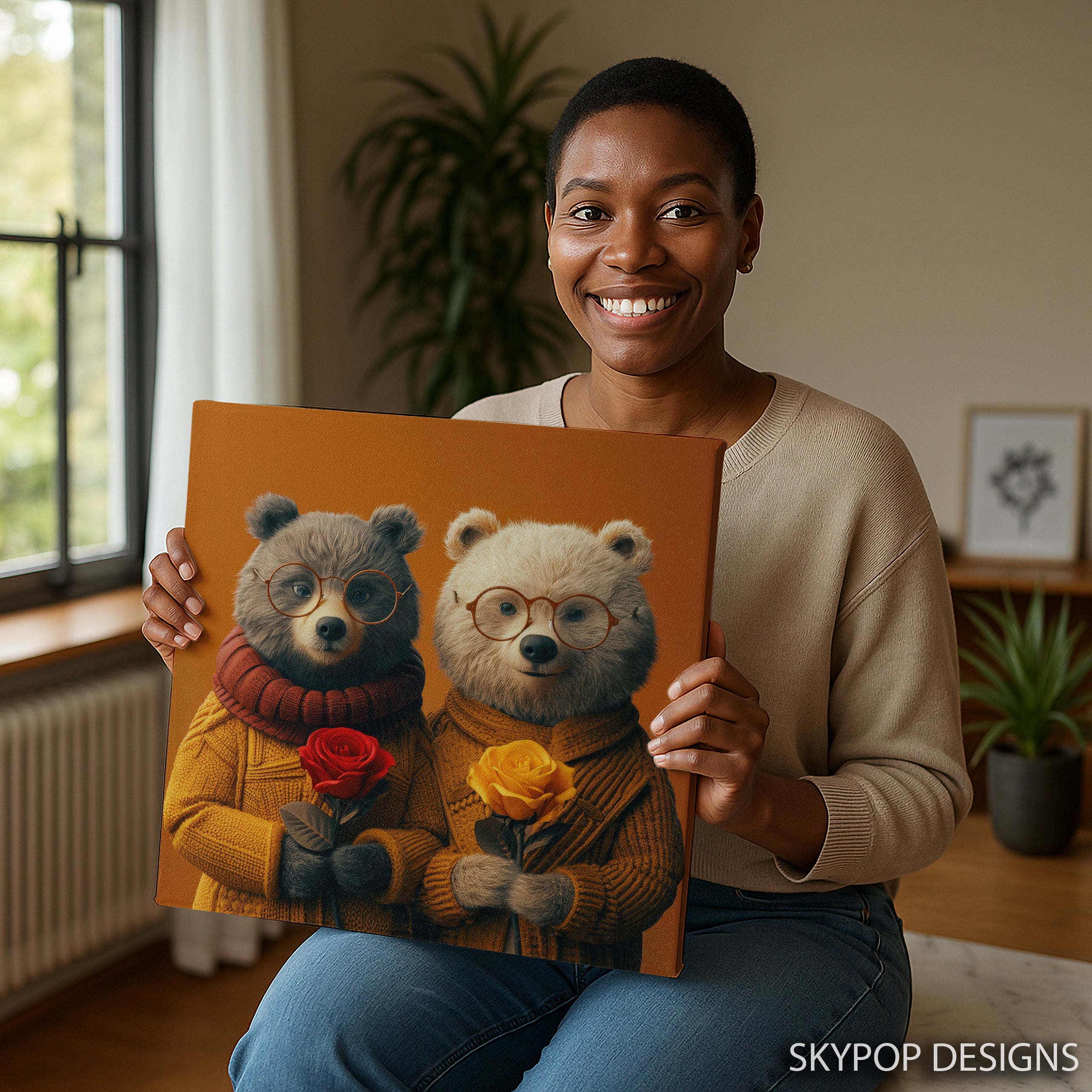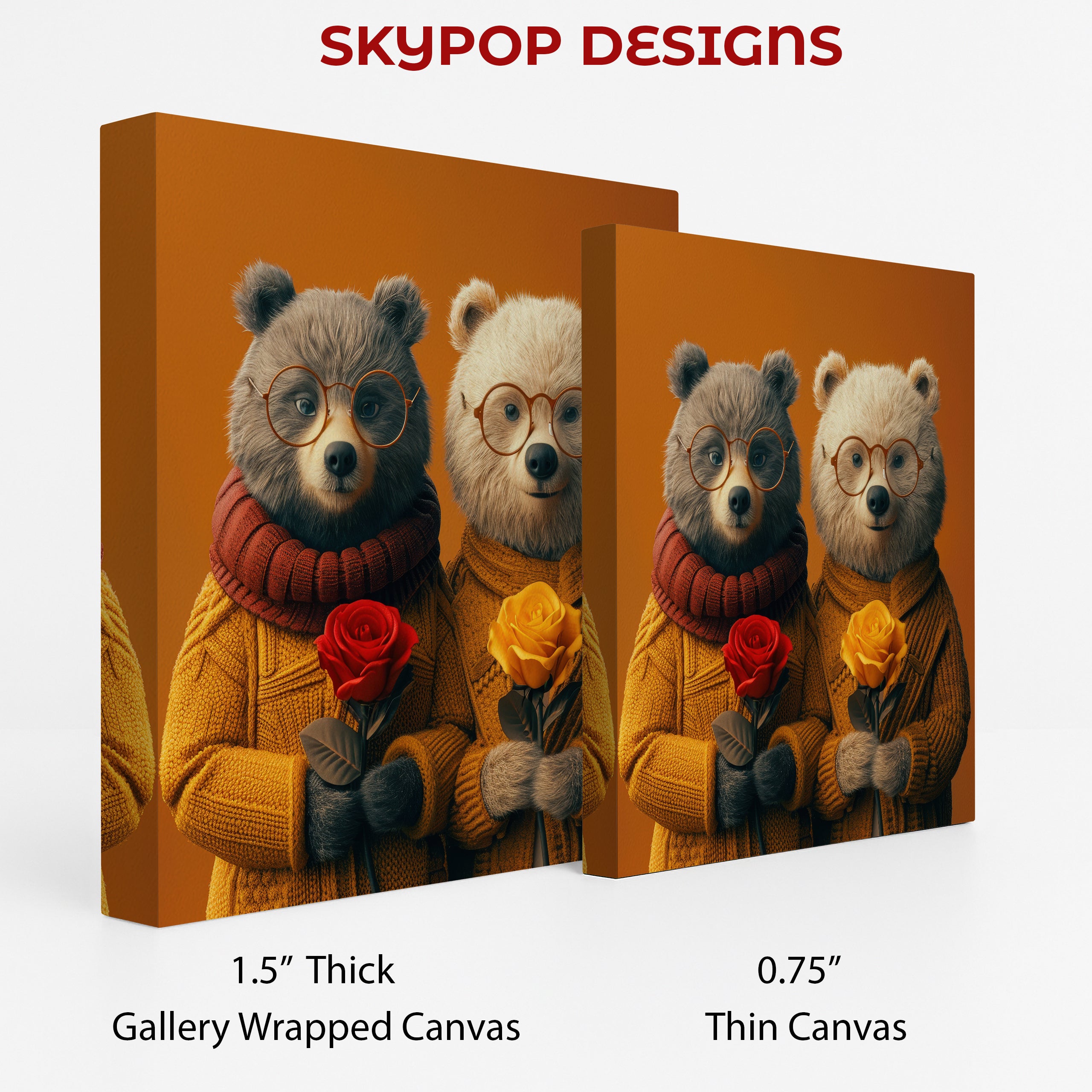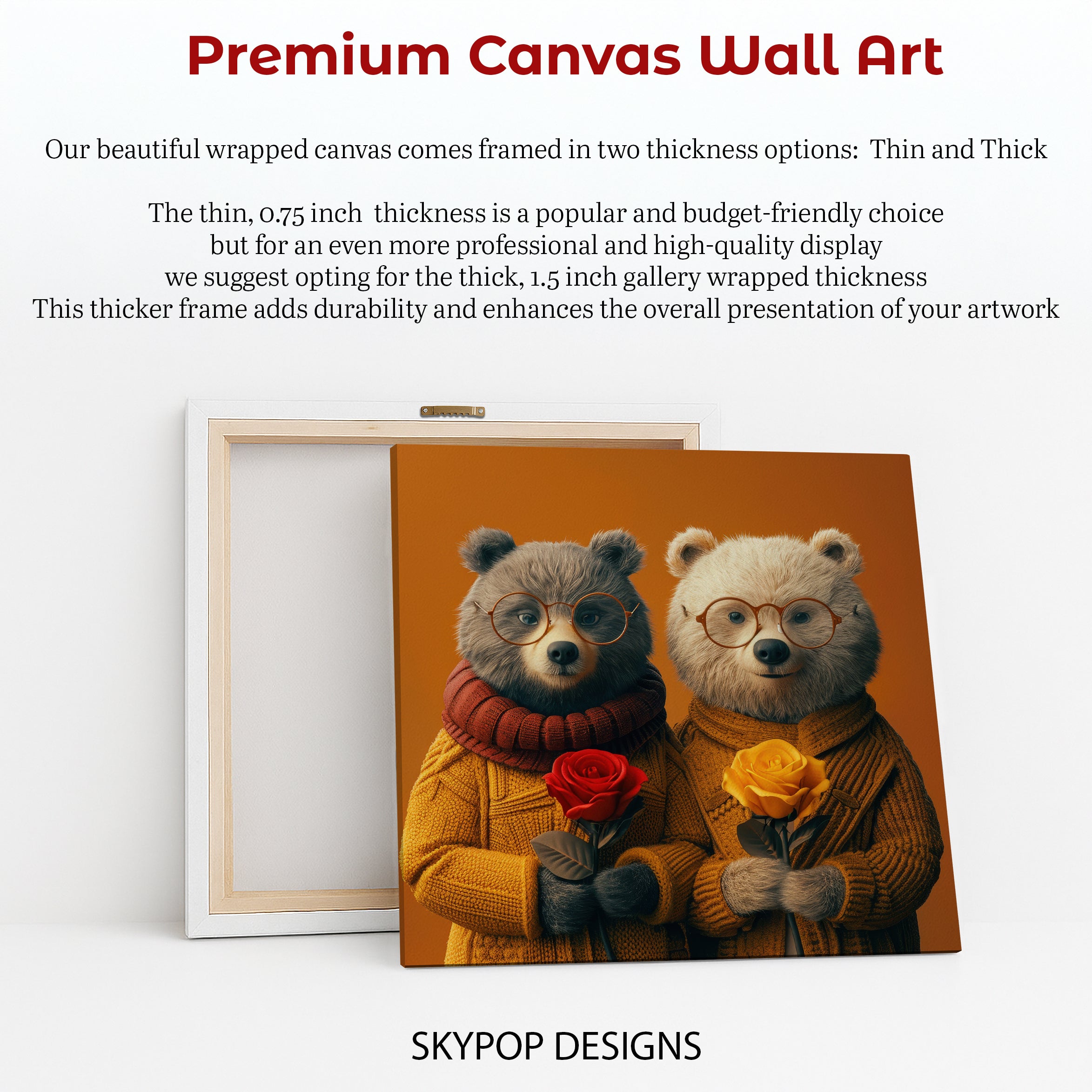 Brighten your home with this charming bear canvas wall art, a delightful piece that brings warmth and personality to any space. This unique poster showcases two adorable bears, one holding a vibrant red rose and the other a sunny yellow rose, each wearing cozy sweaters and glasses, creating a heartwarming and whimsical scene. The rich orange background and the textured detail of the bears' sweaters and fur make this canvas wall art a captivating addition to your decor. It's the perfect wall art for creating a cozy and inviting atmosphere in your living room, bedroom, or even a nursery. This animal art poster is ideal for those who love the farmhouse or bohemian decor styles, adding a touch of playful charm and sophisticated rusticity. The contrast between the classic shapes of the roses and the charming bear characters makes this canvas wall art a conversation starter. High-quality printing ensures vivid colors and intricate details, making this poster a stunning piece of art. This versatile artwork also makes a wonderful housewarming gift, birthday present, or holiday surprise for friends and family who appreciate unique and heartwarming decor. Elevate your home with this endearing bear artwork and add a touch of joy and affection to your wall art collection. This canvas wall art is designed to be a focal point, bringing smiles and comforting vibes to your home decor. Transform your space today with this delightful bear and rose poster.