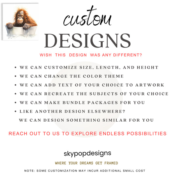 Keywords: Orangutan wall art, Canvas wall art, Animal art, Whimsical art, Contemporary art, Modern decor, Minimalist decor, Bohemian decor, Bathroom art, Children's room art, Living room art, Bedroom art, Multicolor art, Brown art, Beige art, White art, Orangutan painting, Watercolor art, Bubbly bath art, Playful art, Cute animal art, Home decor, Wall decor, Housewarming gift, Unique art, Art print, Poster art, Nature art, Wildlife art, Art for kids