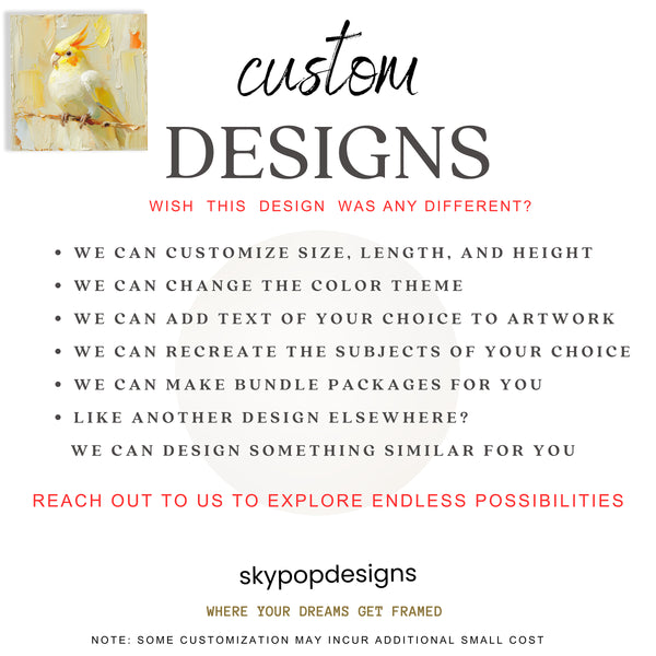 Keywords: Impressionism Art, Nature Art, Animal Art, Contemporary Decor, Modern Decor, Bohemian Decor, Living Room Art, Bedroom Art, Office Decor, Entryway Art, Yellow Art, White Art, Orange Art, Beige Art, Cockatiel Art, Bird Wall Art, Sunny Cockatiel, Pet Portrait, Textured Art, Thick Brushstrokes, Vibrant Colors, Cheerful Decor, Uplifting Art, Home Decor, Wall Art, Canvas Print, Bird Lover Gift, Birthday Gift, Housewarming Gift, Animal Lover