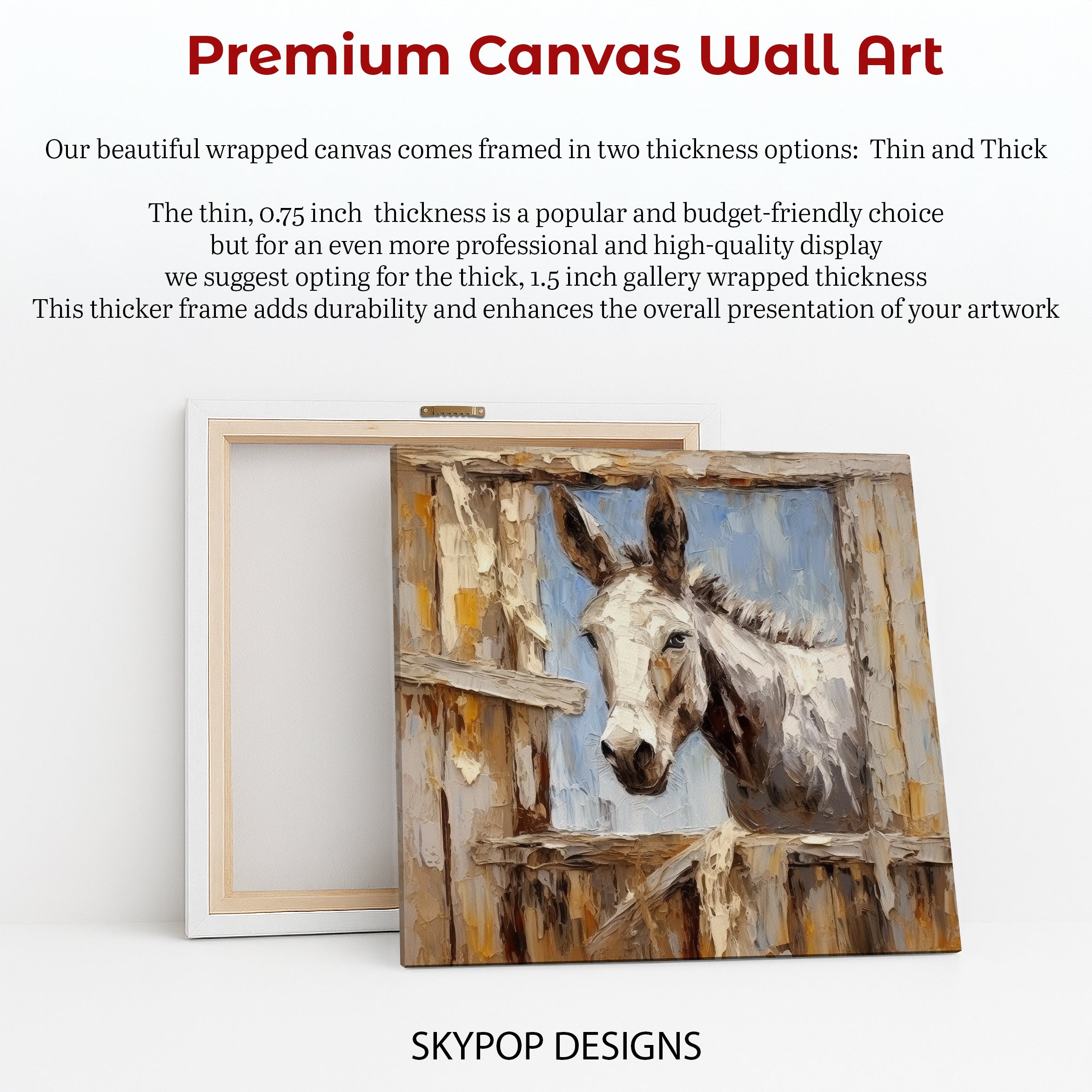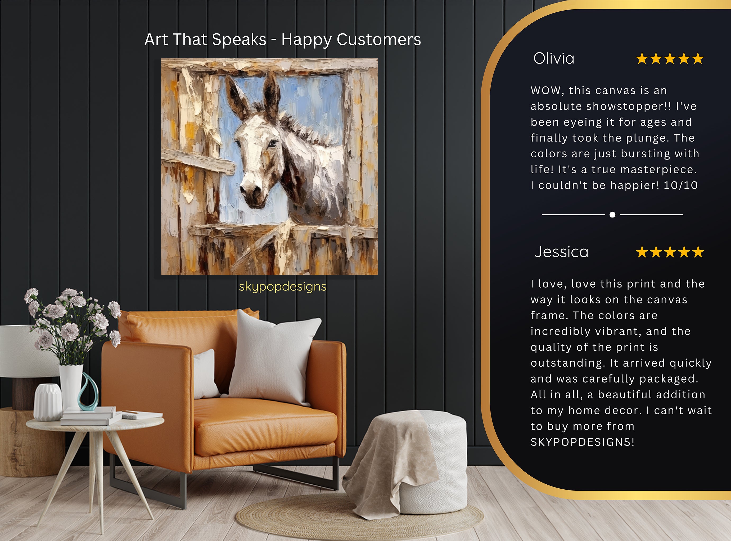 Keywords: Donkey Canvas Art, Animal Wall Art, Rustic Decor, Farmhouse Wall Art, Country Decor, Living Room Art, Bedroom Art, Kitchen Art, Entryway Art, Brown Beige Blue Art, Multicolor Art, Contemporary Art, Nature Art, Donkey Portrait, Farmhouse Donkey, Wall Decor, Canvas Print, Home Decor, Interior Design, Textured Art, Impasto Style, Animal Lover Gift, Housewarming Gift, Birthday Gift, Rustic Charm, Serene Atmosphere, Grounding Art, Statement Piece, Unique Wall Art, Countryside Art