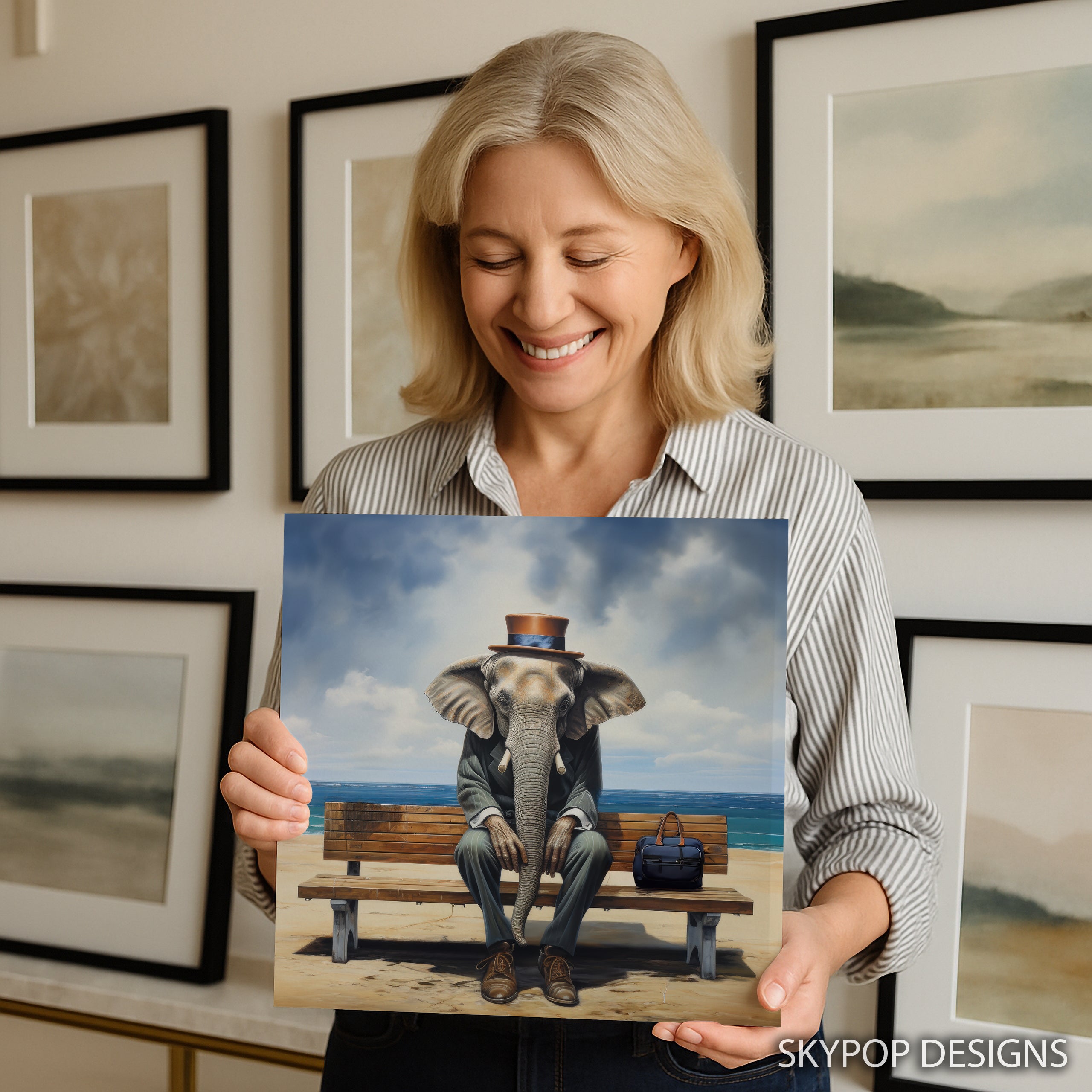 Keywords: Elephant Wall Art, Surrealism Art, Conceptual Art, Pop Art, Contemporary Decor, Bohemian Decor, Modern Decor, Living Room Art, Office Art, Bedroom Art, Entryway Decor, Beige Art, Blue Art, Brown Art, Multicolor Art, Animal Art, Business Elephant, Art Print, Canvas Art, Wall Decor, Home Decor, Art Collector Gift, Animal Lover Gift, Whimsical Art, Escape Art, Relaxing Art, Inspirational Art, Textured Art, Statement Piece, Conversation Starter