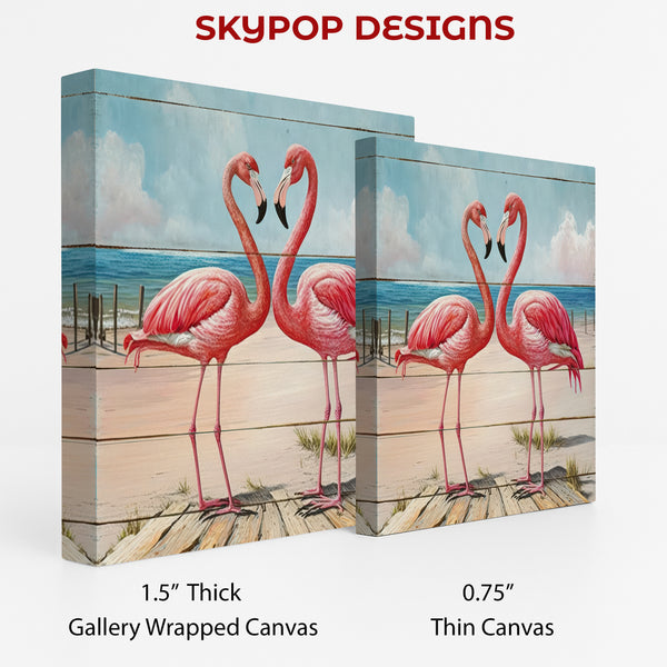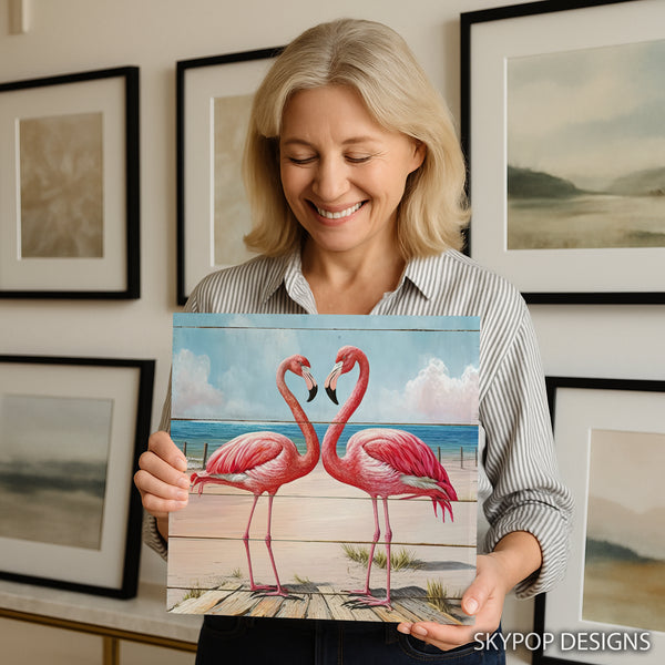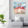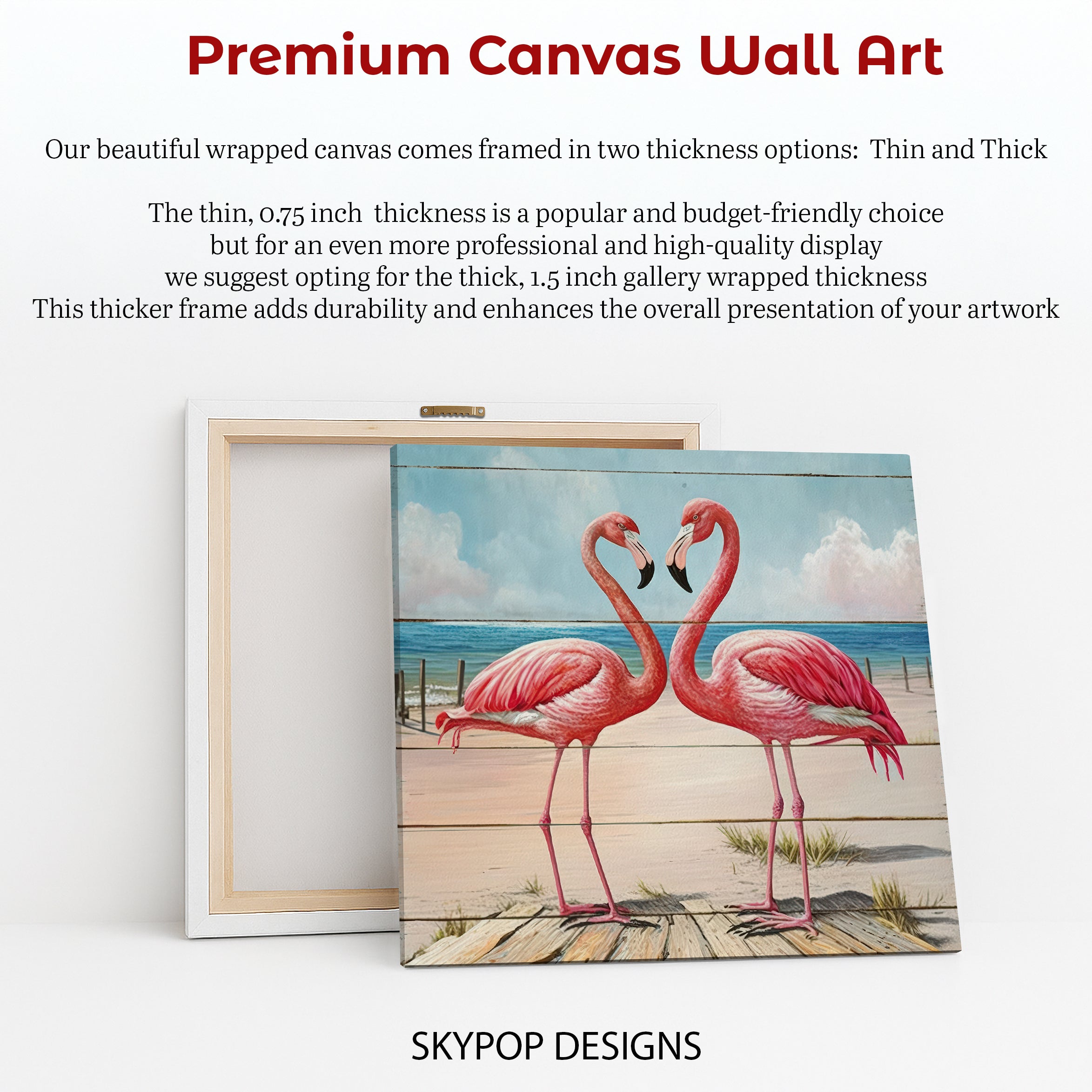 Bring the tropics into your home with this stunning flamingo canvas wall art, capturing the essence of a serene beach sunset. This captivating poster features two elegant flamingos with their necks forming a heart shape, symbolizing love and tranquility. The vibrant pink hues of the flamingos pop against the calming blues of the ocean and sky, creating a striking visual that will transform any room. Perfect for coastal or bohemian decor, this canvas wall art elevates your living room, bedroom, or dining room with its natural beauty. The detailed brushwork and realistic portrayal of the flamingos, set against a backdrop of sandy shores and gentle waves, make this artwork a true statement piece. This high-quality canvas art is ideal for adding a splash of color and a touch of nature-inspired elegance to your home. It's a perfect gift for birthdays, housewarmings, or holidays, bringing a sense of warmth and joy to any recipient's space. The vibrant yet soothing color palette enhances the mood of your home, creating a peaceful and inviting atmosphere. Showcase your love for nature and vibrant color with this unique flamingo painting, a beautiful addition to any wall decor collection. This versatile piece of wall art is sure to be a conversation starter and a cherished addition to your home decor. Experience the beauty of nature and elevate your space today with this breathtaking flamingo canvas.