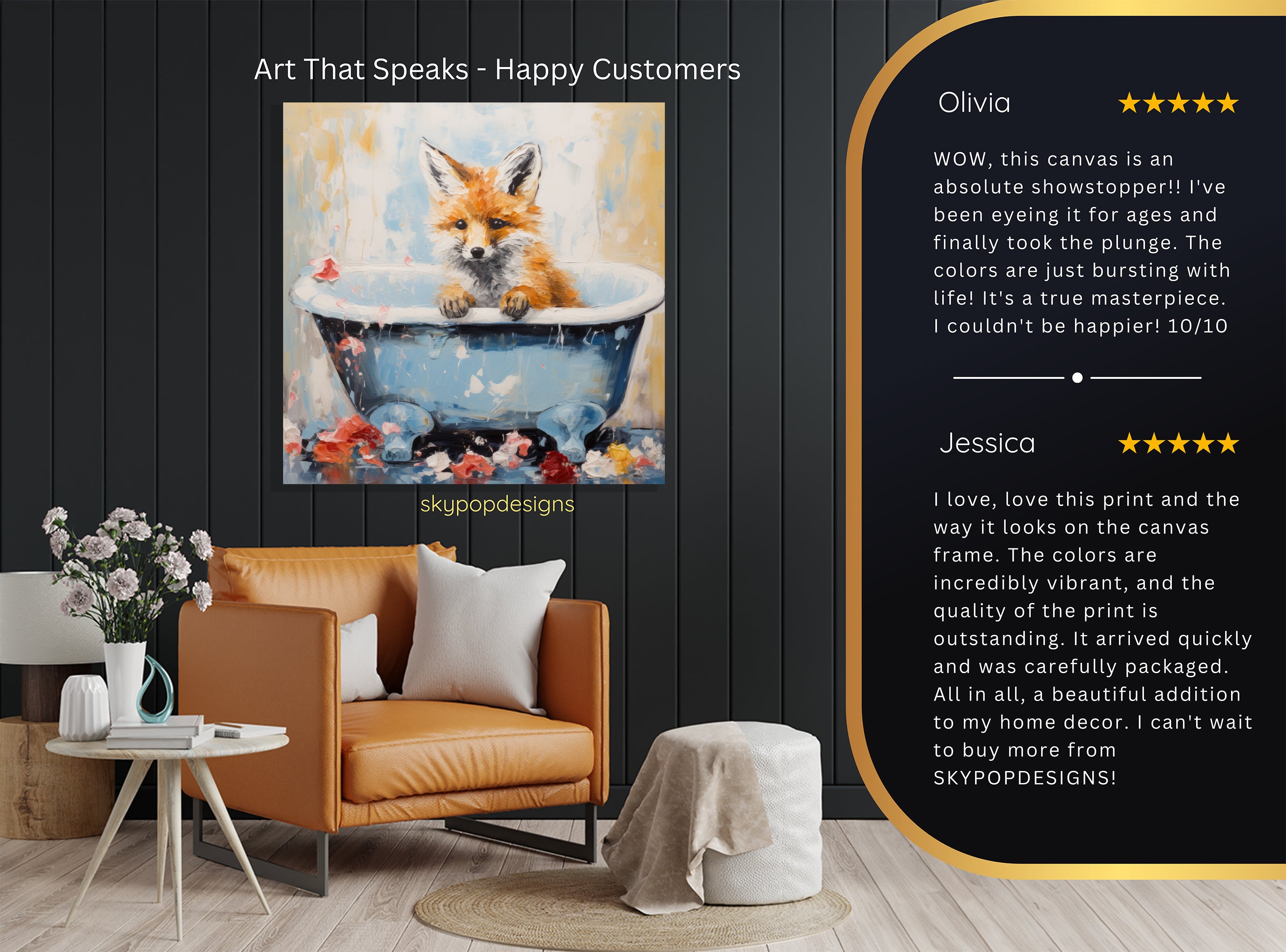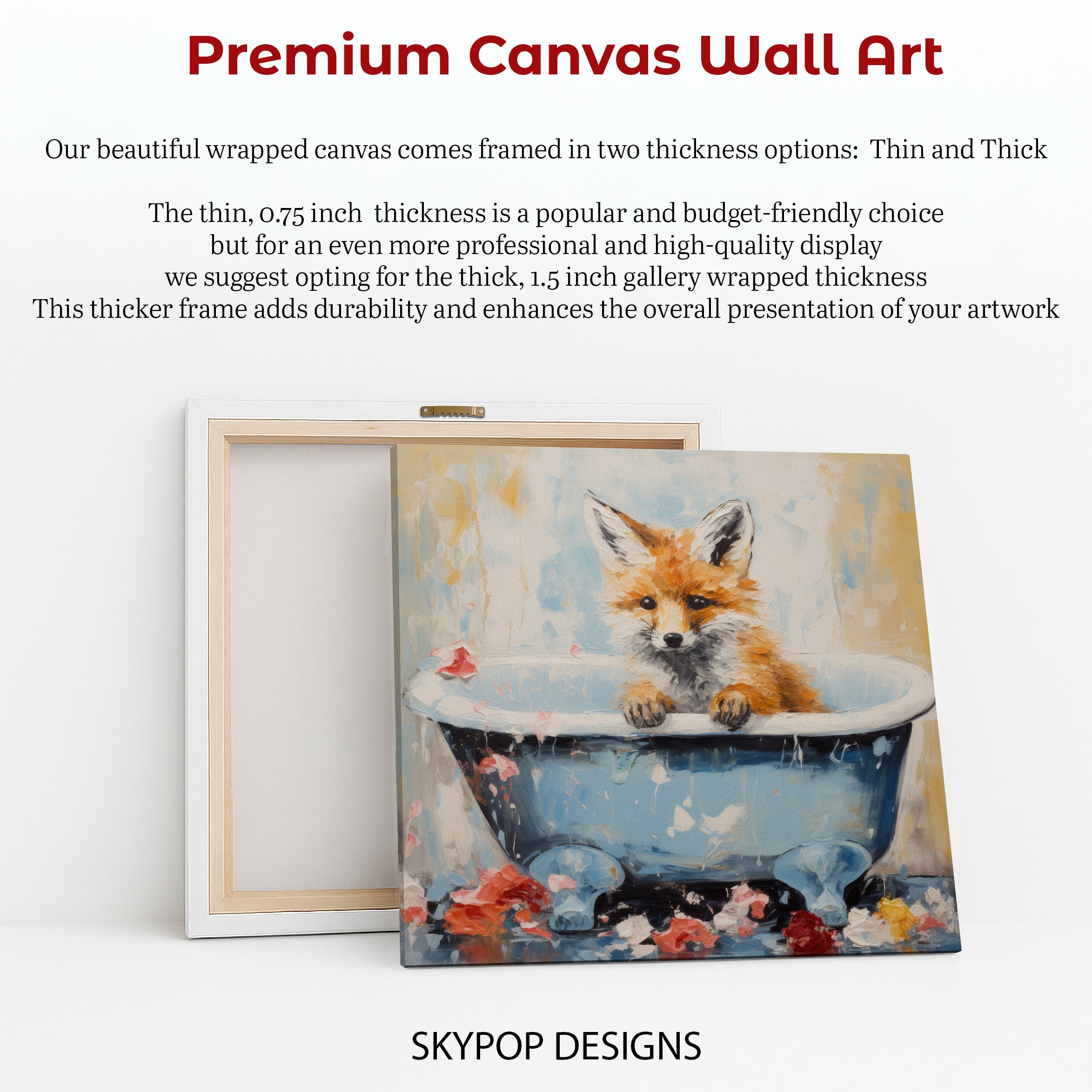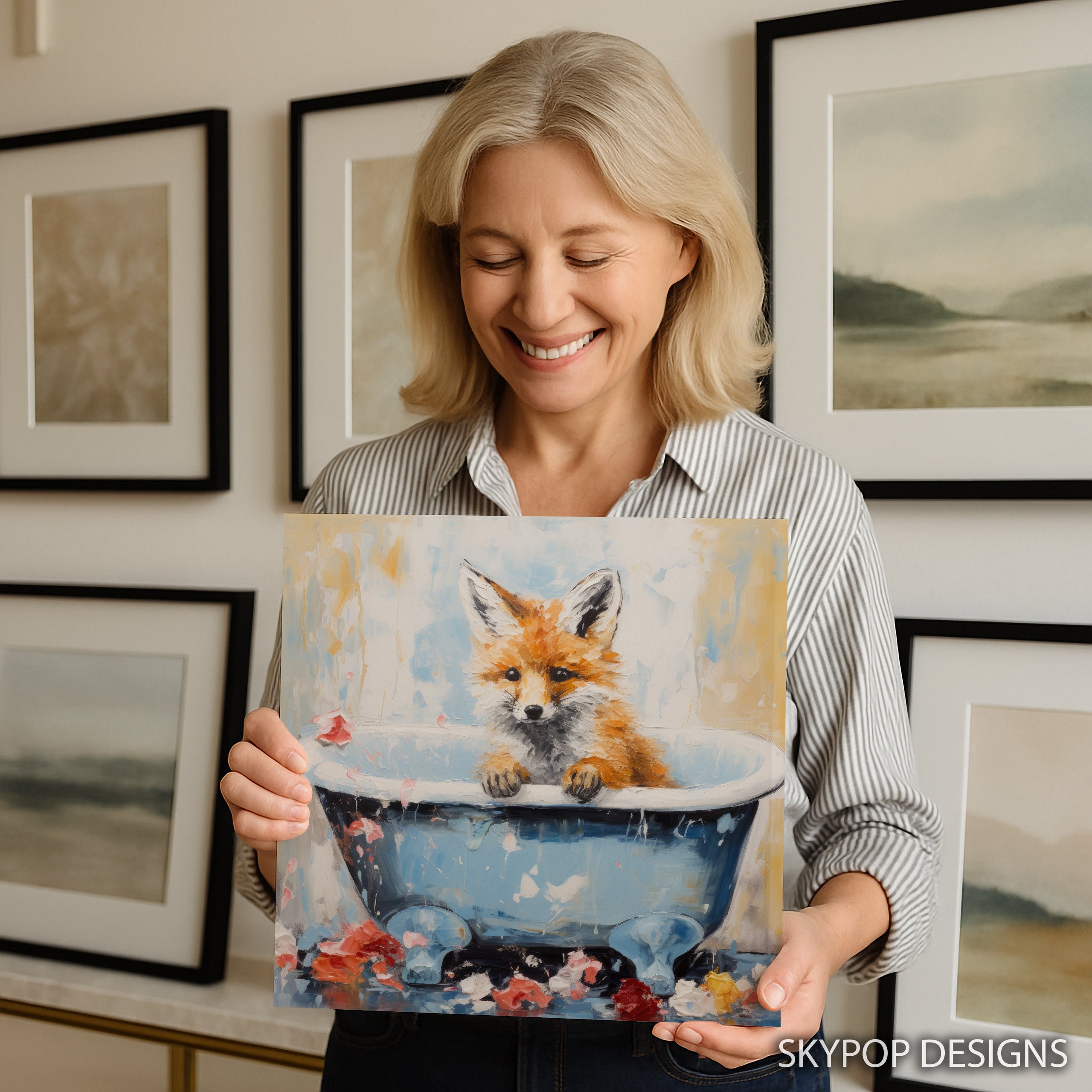 Keywords: Whimsical Art, Animal Art, Contemporary Art, Modern Decor, Bohemian Decor, Minimalist Decor, Living Room Art, Bedroom Art, Children's Room Art, Bathroom Art, Multicolor Art, Blue Art, Beige Art, White Art, Fox Art, Fox Bath Time, Canvas Wall Art, Animal Scene, Playful Charm, Vibrant Artwork, Textured Brushstrokes, Unique Focal Point, Modern Living Room, Cozy Bedroom, Blue Beige Art, Scattered Petals Art, Calm Joy Art, Fox Print, Cheerful Atmosphere, Housewarming Gift, Birthday Gift, Animal Lovers Gift, Nature Art, Whimsy Decor, Playful Elegance