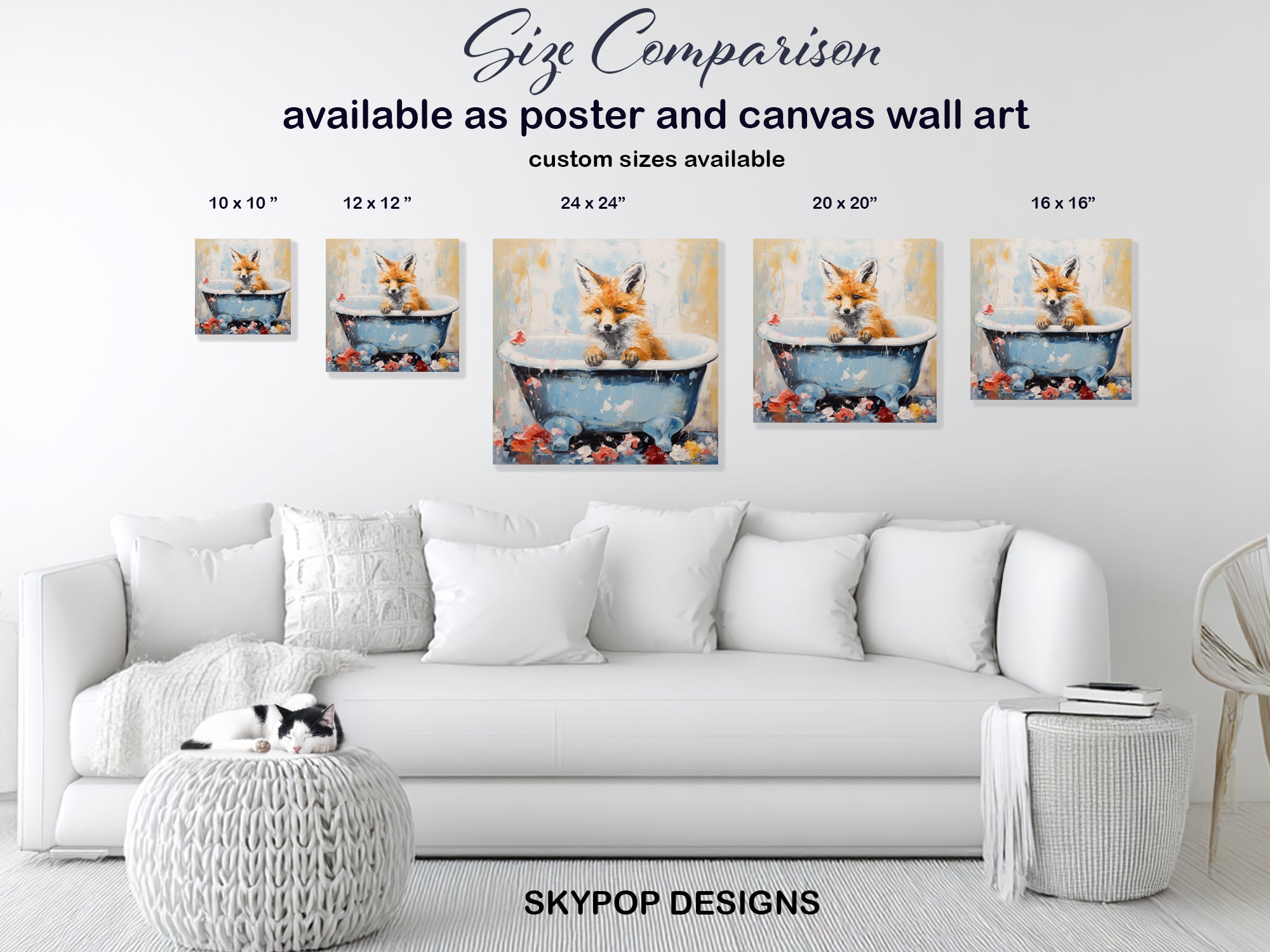 Fox Bath Time Art, Canvas or Poster, Whimsical Modern Bohemian Decor, Living Room Bedroom Bathroom Wall Art, Multicolor Blue Beige