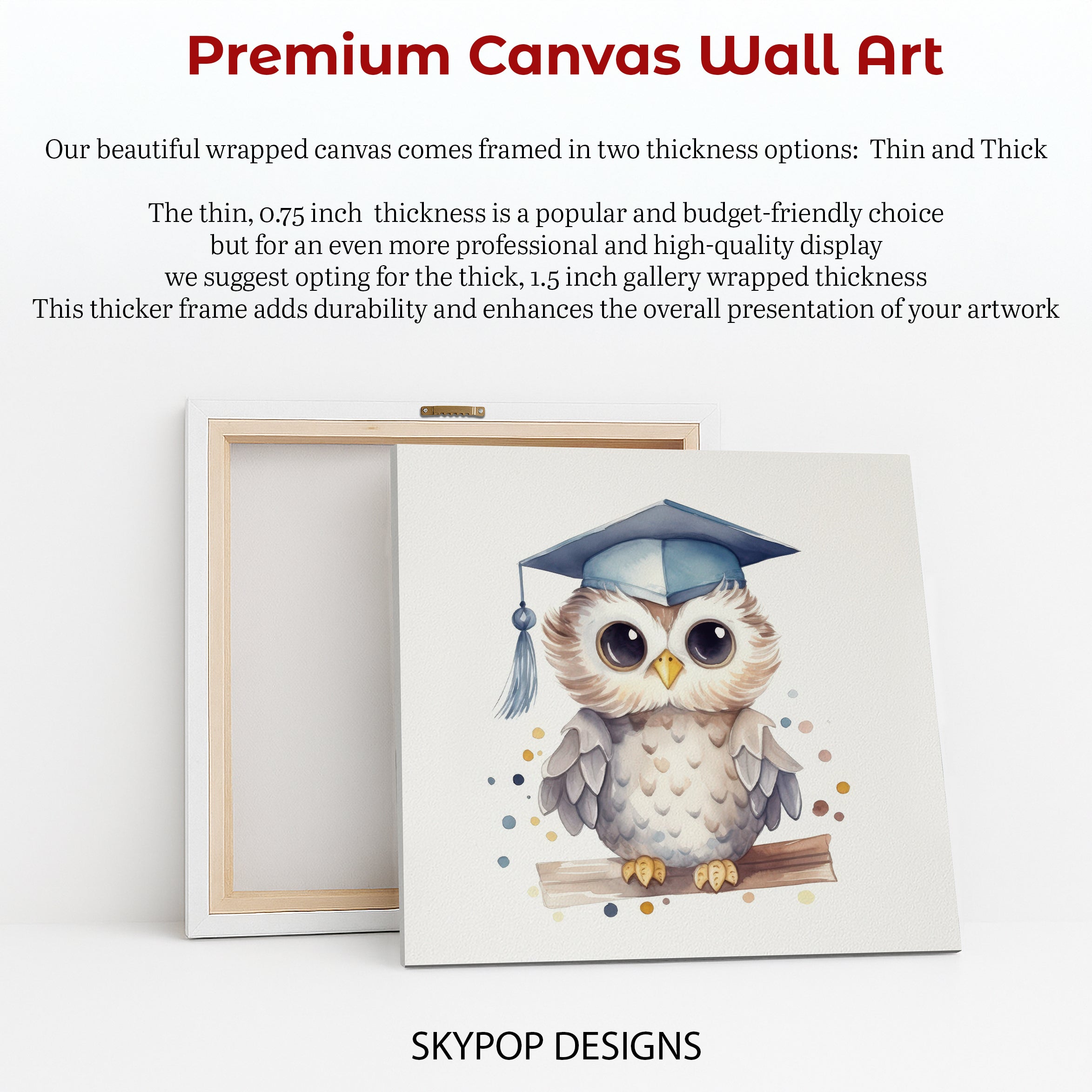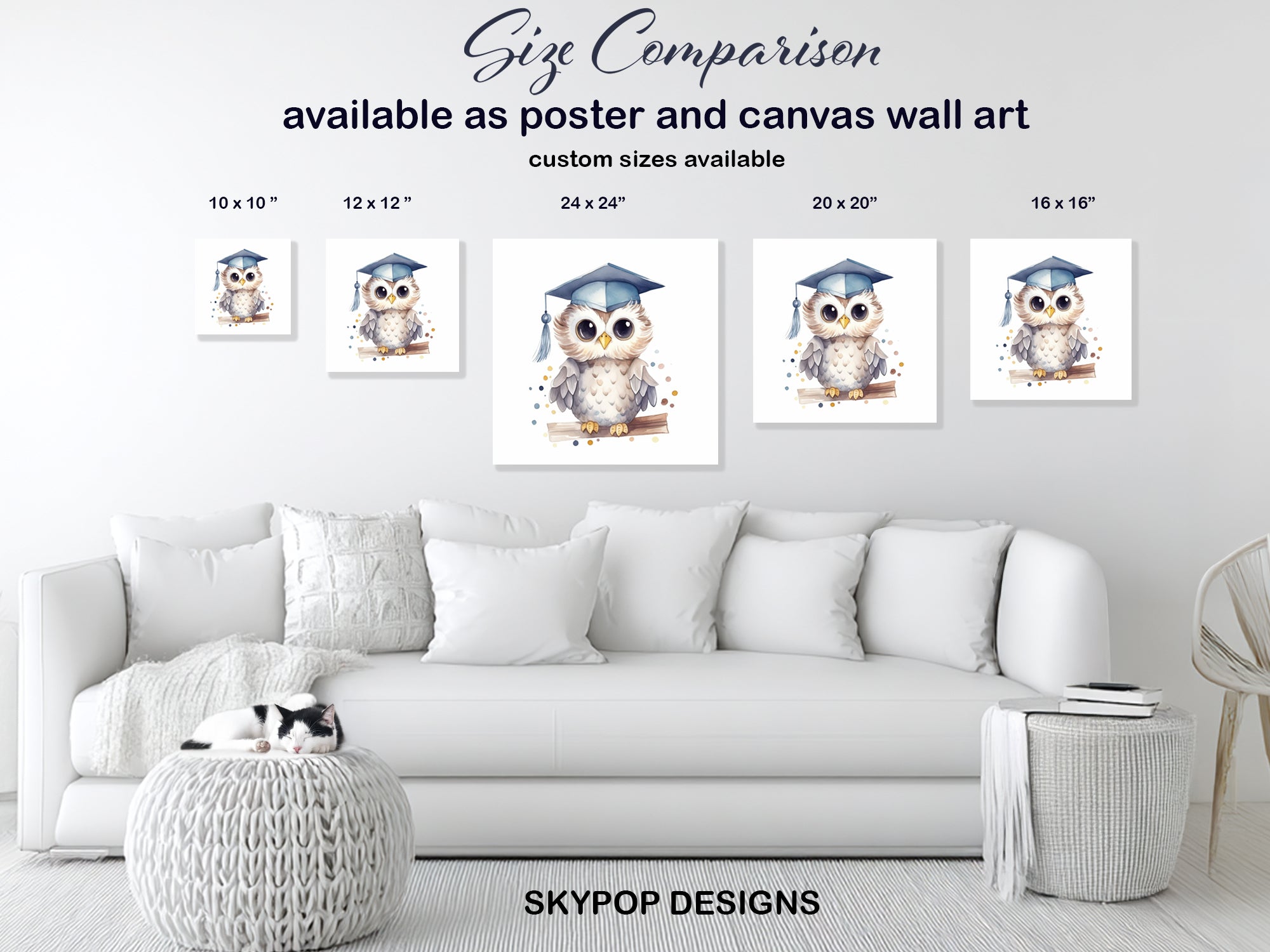 Transform your space with this adorable owl canvas wall art featuring a charming owl wearing a graduation cap. This delightful piece is perfect for celebrating academic achievements and adds a whimsical touch to any room. This owl poster or canvas wall art is a fantastic gift for graduation, birthdays, or any book lover, bringing a sense of accomplishment and joy. The soft blues and natural browns create a calming yet vibrant atmosphere, ideal for a child's bedroom, nursery, or playroom. Its contemporary style blends seamlessly with bohemian or modern decor, making it a versatile addition to your home. The watercolor effect gives this owl print a unique, artistic feel that will capture attention. Showcase your love for learning and nature with this heartwarming wall art. It's a perfect statement piece to elevate your living room or office space. This high-quality canvas wall art ensures lasting beauty, transforming your walls into a source of inspiration. Brighten up your home with this captivating owl artwork that symbolizes wisdom and new beginnings. Make this inspiring owl poster the focal point of your decor collection today and celebrate every milestone.