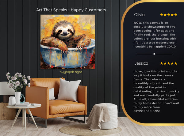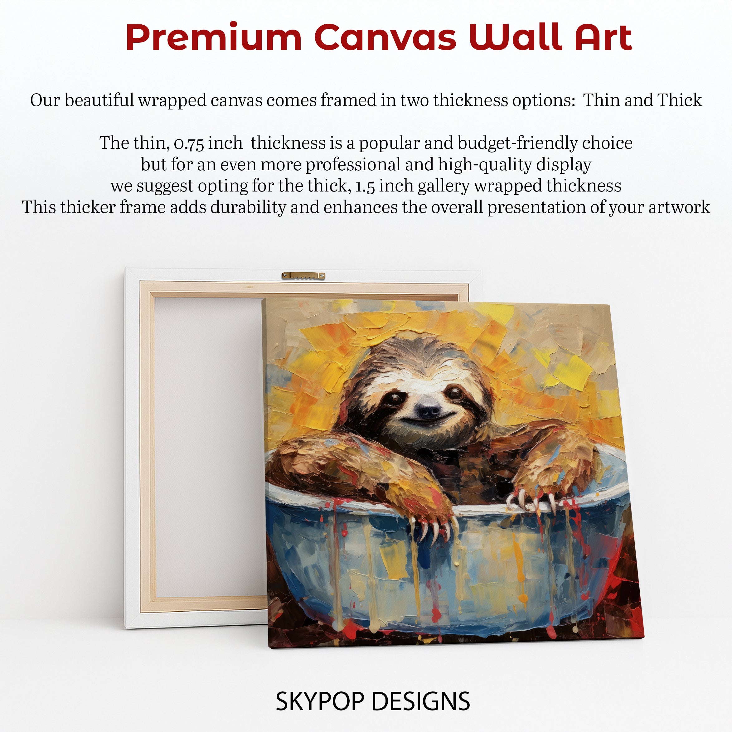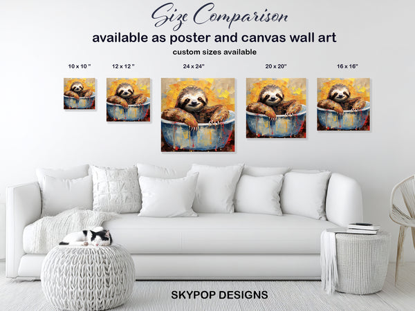 Transform your space with this unique sloth enjoying a bath canvas wall art. The playful depiction of a sloth in a tub instantly brings a smile and a sense of calm to any room. This eye-catching poster showcases vibrant, textured brushstrokes in a contemporary style, featuring a heartwarming sloth that adds personality to your home decor. The mix of warm yellows, blues, and multifaceted colors creates a striking visual that complements modern and bohemian aesthetics. It’s the perfect wall art for a living room, a cozy bedroom, a whimsical nursery, or even a relaxing bathroom. This sloth canvas makes a wonderful gift for animal lovers, housewarmings, or birthdays, adding a touch of joy and whimsy to their space. The bold, impasto technique used in this artwork gives it a unique dimensionality, making each glance a new discovery. Enhance your decor with this captivating piece that celebrates slow living and simple pleasures, bringing a unique character to your wall art collection. This versatile poster or canvas wall art serves as a fantastic focal point, inspiring a relaxed atmosphere and cheerful vibes throughout your home. Elevate your surroundings with this delightful and charming sloth artwork, a perfect addition to any art enthusiast's collection seeking a touch of fun and personality. Its high-quality print ensures the vibrant colors and rich textures are preserved, making this sloth canvas a lasting piece of art.