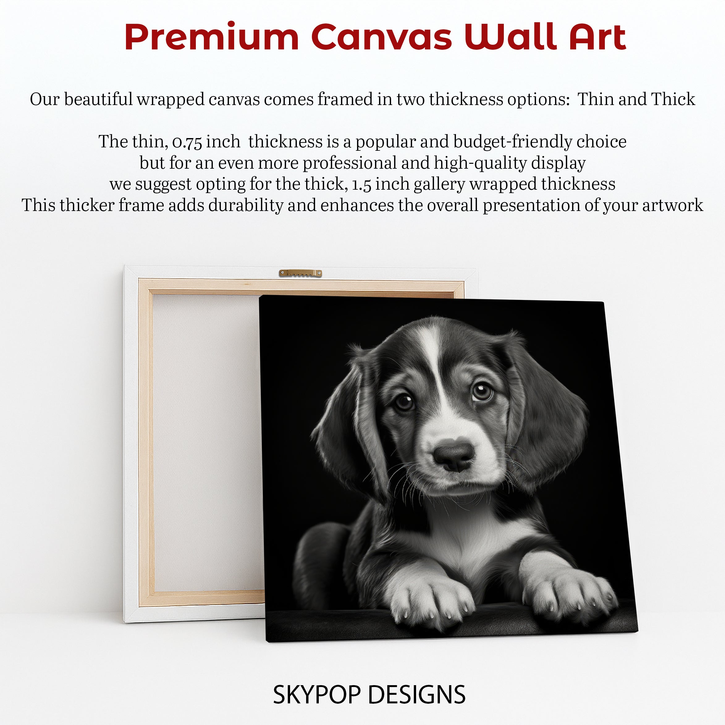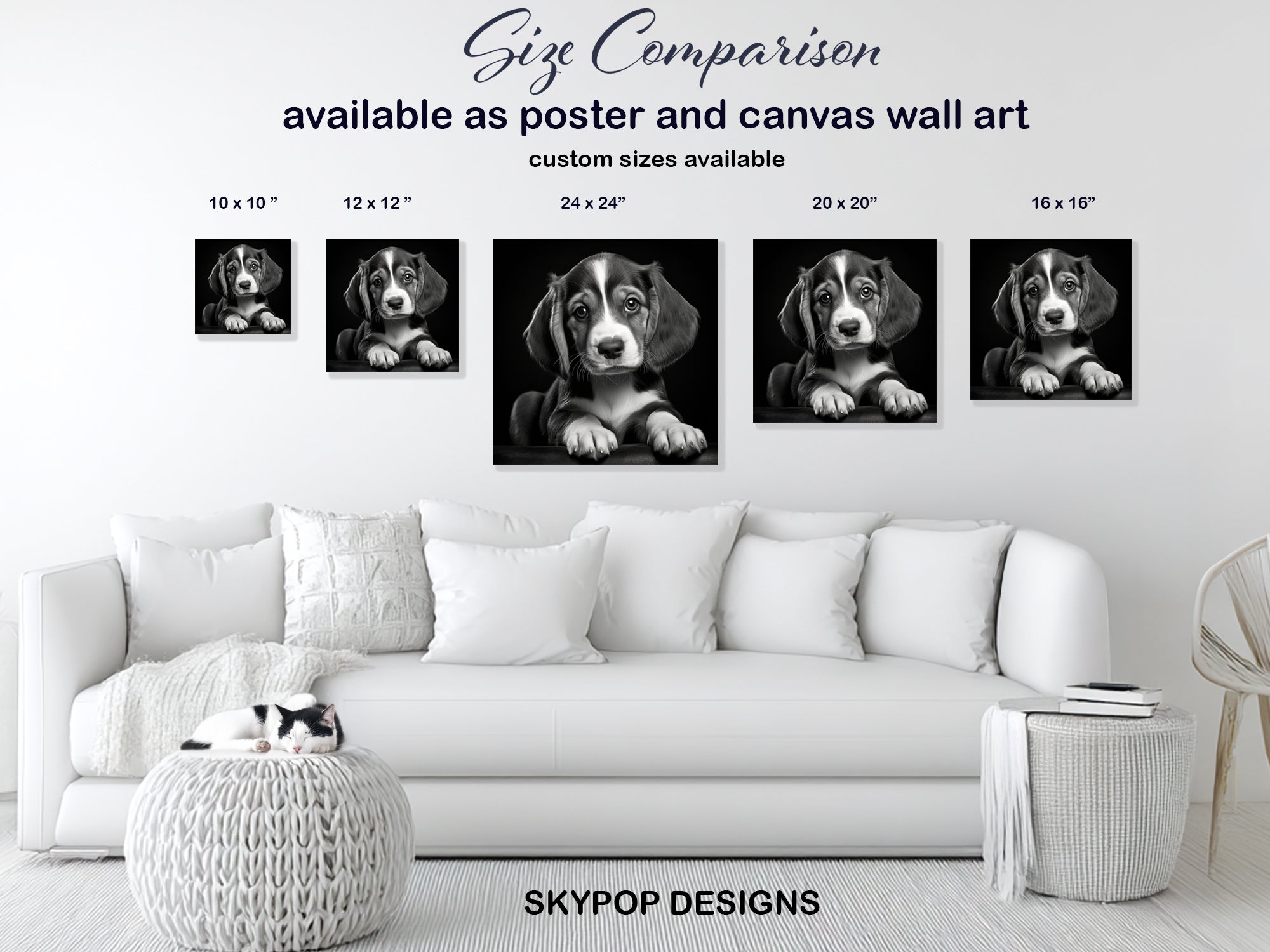 Transform your space with this stunning Border Collie canvas wall art featuring a captivating close-up of an adorable puppy. The black and white photography style elevates this animal art, creating a timeless and sophisticated piece that adds character to any room. This striking poster captures the soulful eyes and gentle expression of the Border Collie, making it a perfect focal point for your living room or bedroom. The minimalist aesthetic and monochromatic palette make this canvas wall art an ideal addition to contemporary and modern decor styles, subtly enhancing any interior design. Showcase your love for dogs with this high-quality artwork, a beautiful representation of canine companionship. This piece offers a gentle and calming mood, perfect for creating a serene atmosphere in your office or entryway. Celebrate the joy of pets with this versatile poster, ideal for dog lovers of all kinds. It serves as a wonderful gift for birthdays, holidays, or housewarmings for anyone who appreciates dog art. The detailed rendering of the fur and the puppies expressive gaze make this canvas wall art a truly heartwarming addition to your home decor. Elevate your walls with this charming and elegant canine portrait. Add this beautiful Border Collie wall art to your collection and bring a touch of timeless elegance to your home today.