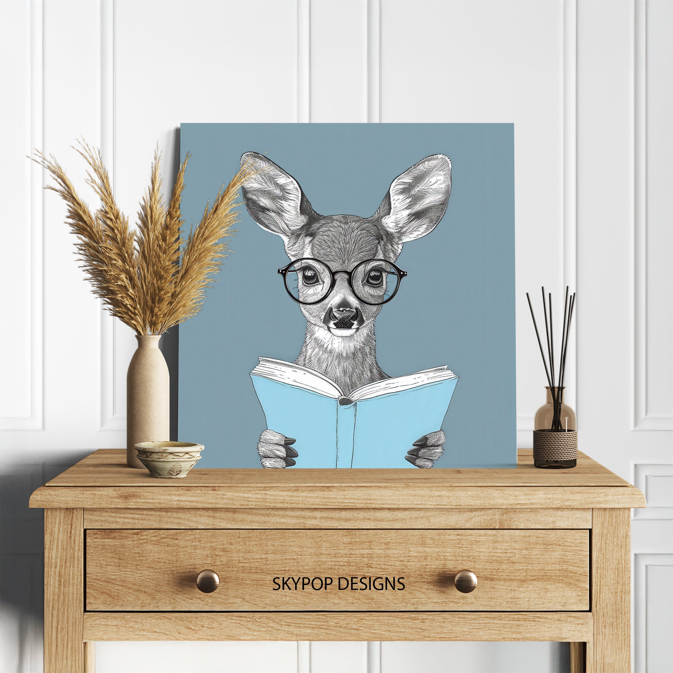 Keywords: deer wall art, animal art, nature art, whimsical art, bohemian decor, modern decor, minimalist decor, living room art, office decor, bedroom art, library decor, blue and white art, black and white art, deer reading art, studious deer, book lover gift, animal poster, canvas wall art, framed art, home decor, interior design, unique wall art, sophisticated art, playful art, art collection, intellectual art, heartwarming art, inspirational art, gift for book lovers, reading nook decor