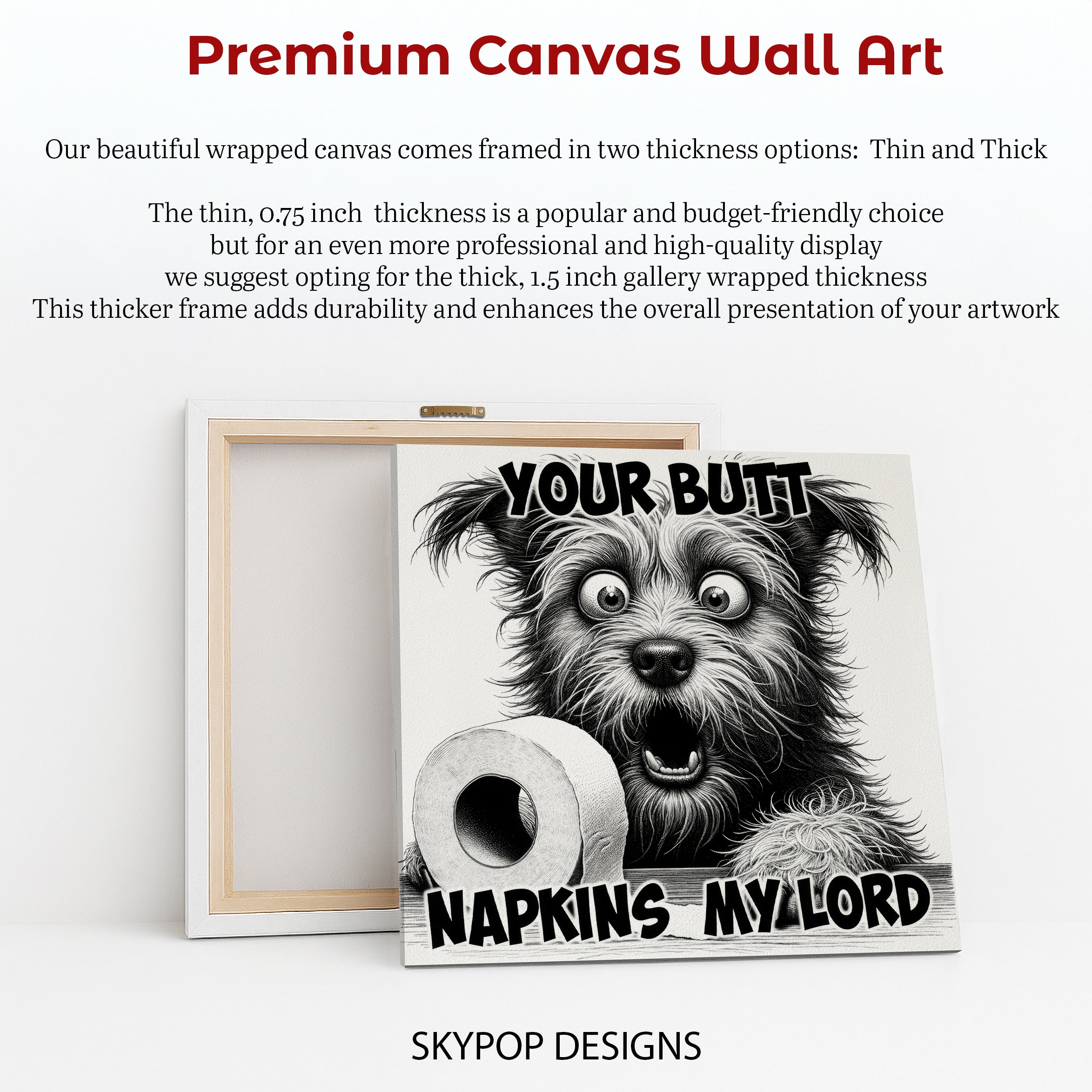Add a touch of humor and personality to your space with this eye-catching canvas wall art featuring a comedic dog with exaggerated expressions. This striking black and white poster or canvas wall art is perfect for adding a unique statement piece to your living room, game room, or even a quirky office. The bold typography combined with the detailed illustration of the textured dog fur creates a captivating visual that's sure to spark conversation. This modern and contemporary wall decor is ideal for those who appreciate a playful and unconventional sense of art. The stark black and white palette makes this canvas wall art versatile, fitting seamlessly into various decor styles while providing a humorous focal point. Elevate your space with this humorous dog art, celebrating the lighter side of life. It serves as a perfect gift for dog lovers, housewarmings, or birthdays, bringing laughter and joy to any recipient. This poster or canvas wall art is not just decor; it's a conversation starter that brings an instant smile. The impeccable print quality ensures the intricate details of the dog's fur and expressive eyes are vividly displayed. Transform your walls with this fun and memorable piece of wall art that adds character and charm. Showcase your unique sense of humor with this delightful dog canvas art today.