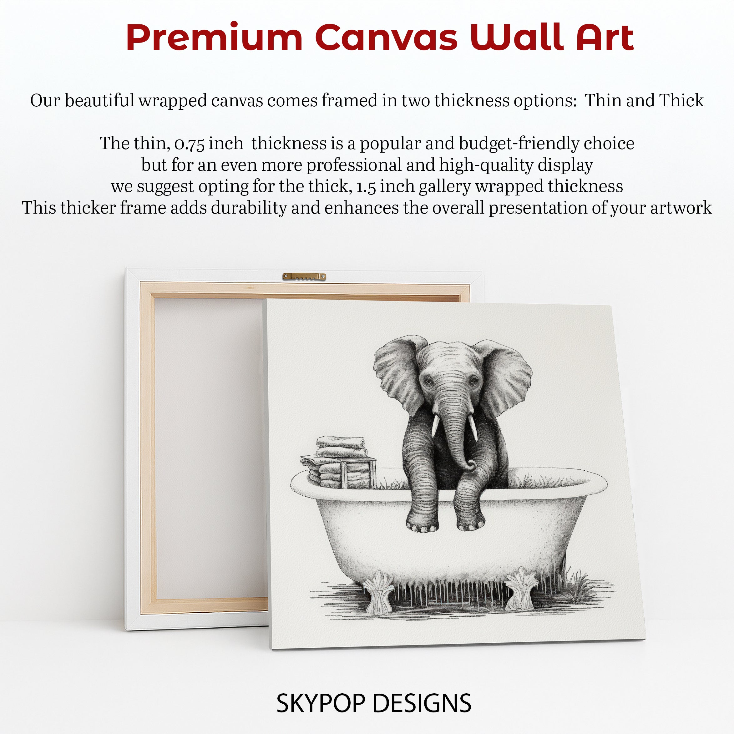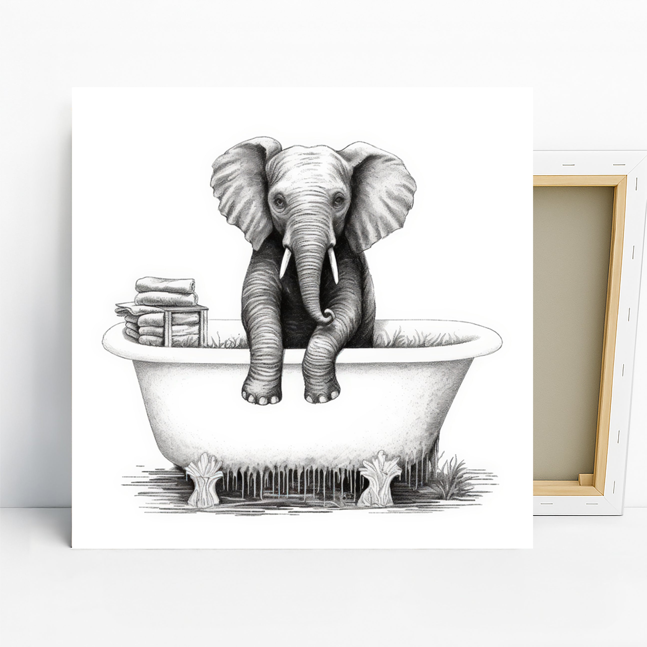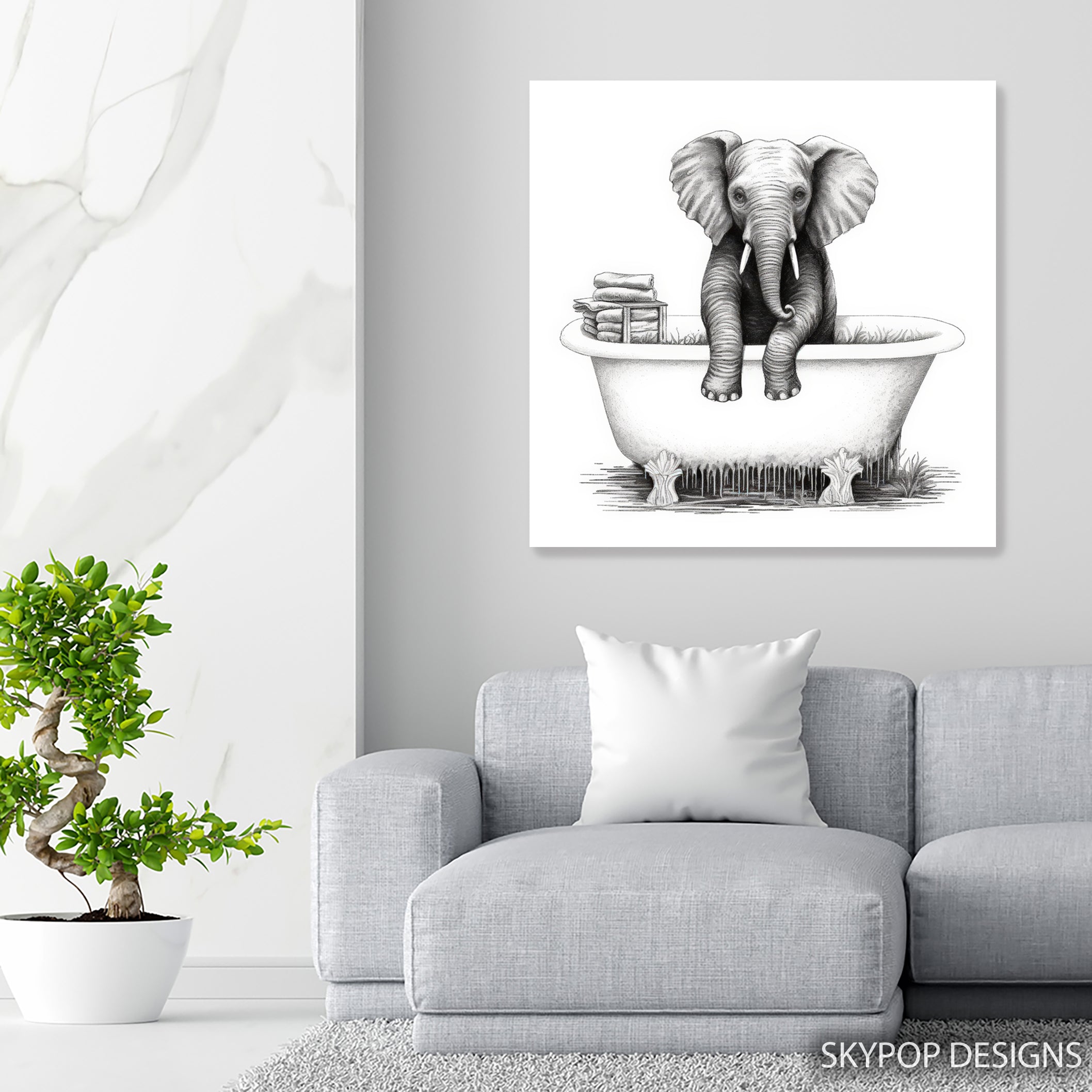 Keywords: Elephant Art, Canvas Wall Art, Animal Poster, Whimsical Art, Nature Art, Modern Decor, Minimalist Decor, Contemporary Art, Bathroom Art, Bedroom Decor, Living Room Art, Children's Room Decor, Black and White Art, Grey Art, White Art, Elephant Bathing, Bathtime Art, Cute Elephant Art, Wildlife Art, Animal Lover Gift, Housewarming Gift, Birthday Gift, Holiday Gift, Home Decor, Wall Decor, Interior Design, Serene Art, Playful Art, Tranquil Decor, Unique Artwork