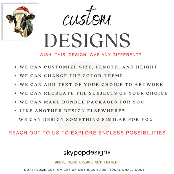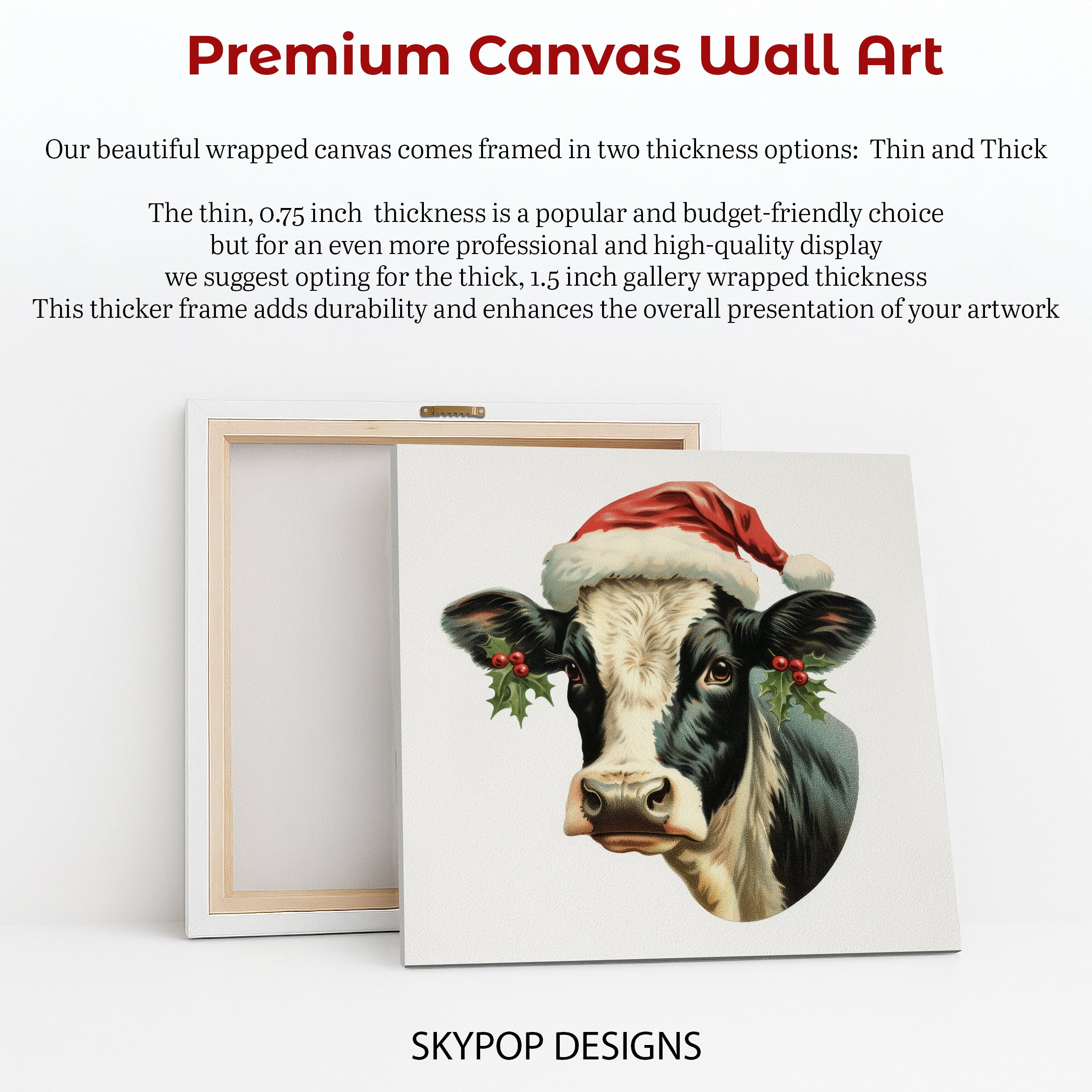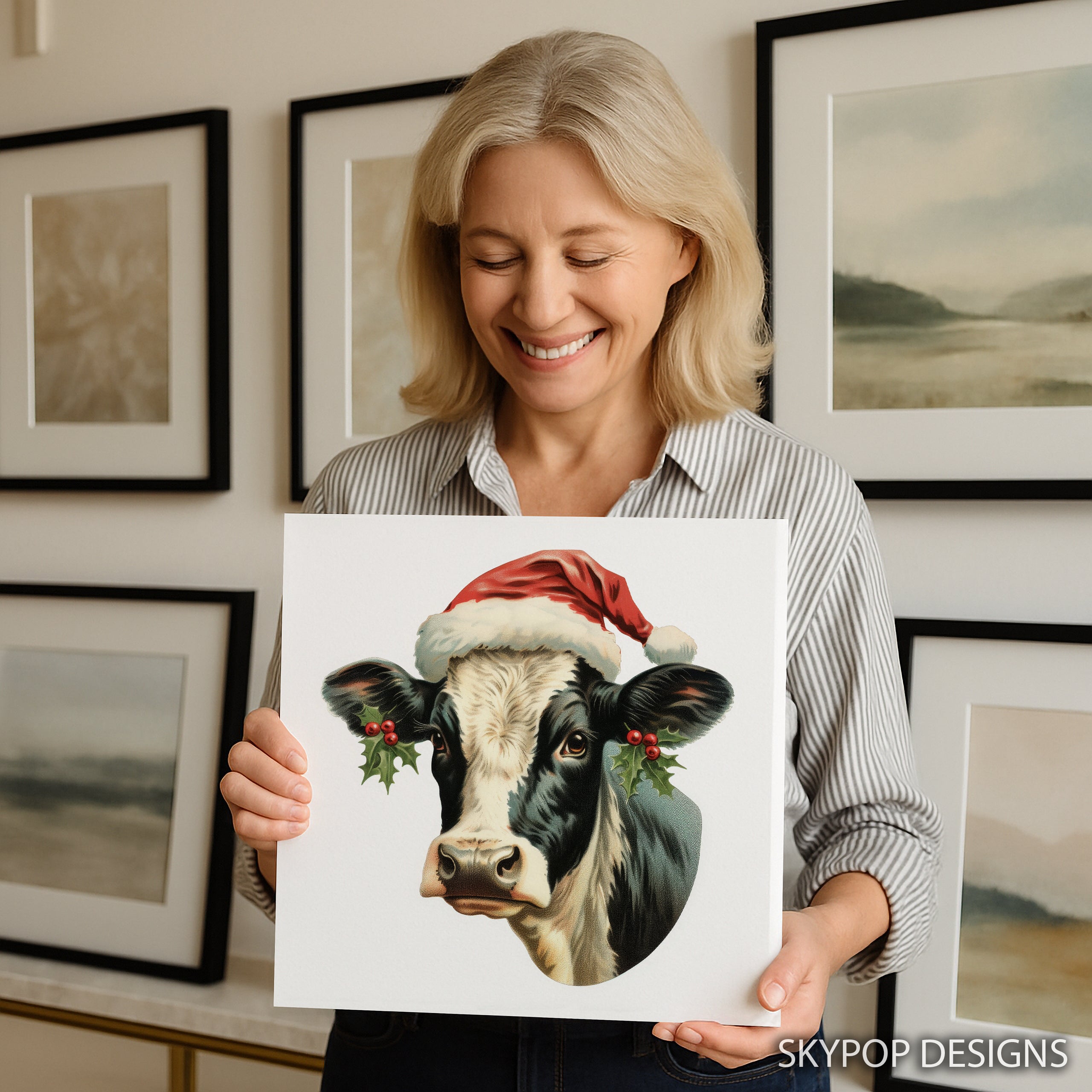 Celebrate the holidays with this charming Highland Cow canvas wall art, featuring a festive cow adorned with a Santa hat and holly. This endearing poster brings a touch of rustic charm and whimsical holiday spirit to any space, perfect for your farmhouse kitchen decor or as a cozy addition to your living room. The striking black and white of the cow, complemented by the vibrant red of the hat and holly, creates a visually engaging piece that instantly evokes a warm, festive mood. Ideal for those who love cozy country decor or a playful take on seasonal themes, this canvas wall art adds personality and cheer. Use this delightful print to enhance your entryway or dining room, bringing a smile to guests and family alike. The vintage-inspired aesthetic of this artwork lends a timeless quality, making it a wonderful focal point throughout the holiday season and beyond. It's a perfect gift for cow lovers, farmhouse enthusiasts, or anyone looking to add a unique holiday touch to their home. This versatile poster is available in various sizes to suit your specific decor needs, ensuring a perfect fit for your chosen wall. High-quality printing showcases the intricate details and rich textures of the original artwork. Transform your home into a festive wonderland with this heartwarming Highland Cow art. Elevate your seasonal decor with this charming and unforgettable piece of wall art today.