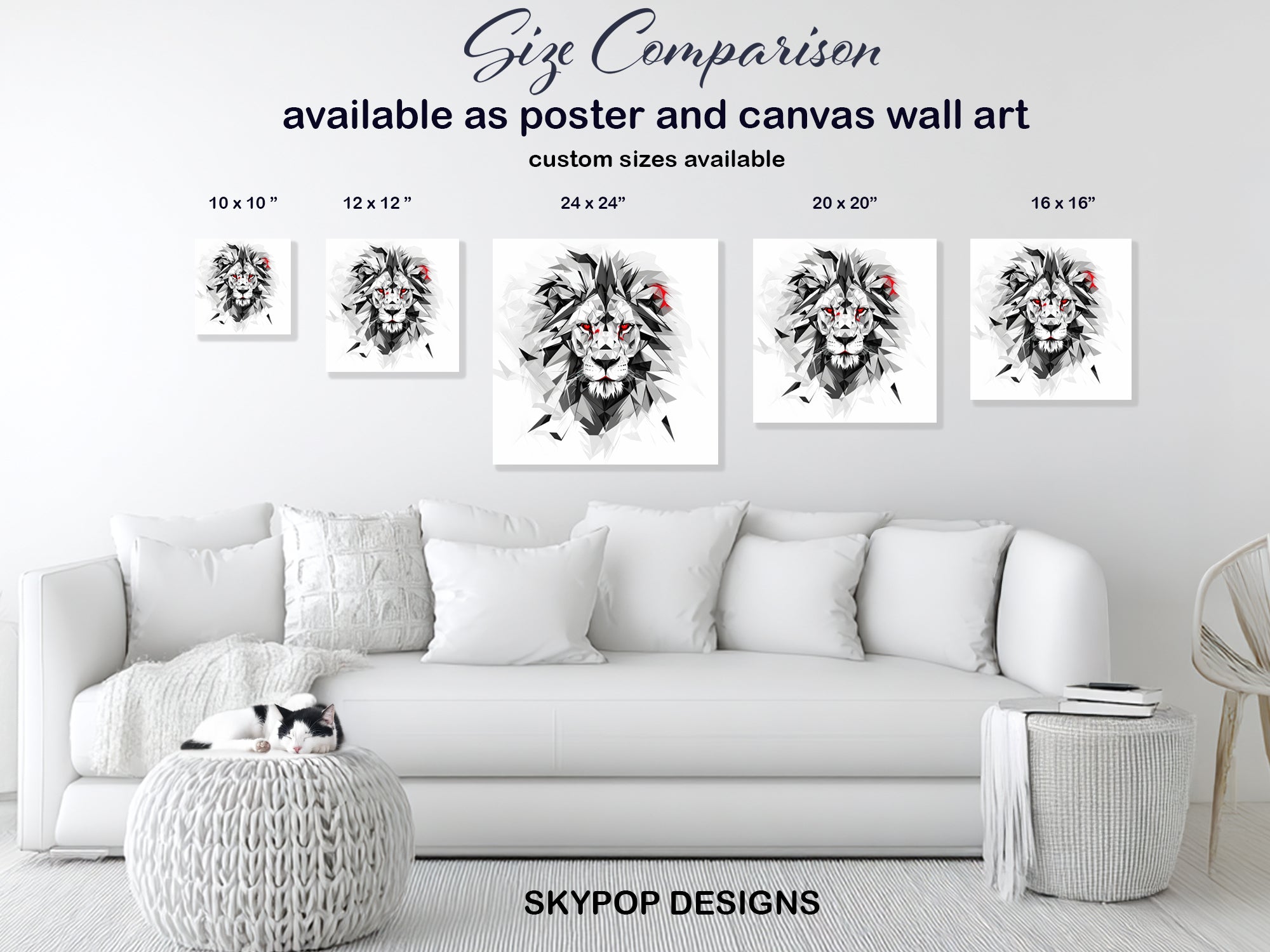 Keywords: Abstract Lion Art, Canvas Wall Art, Modern Decor, Minimalist Art, Contemporary Art, Animal Wall Art, Living Room Art, Office Decor, Bedroom Art, Entryway Art, Black and White Art, Red Accent Art, Grey Abstract, Lion Head Art, Geometric Lion, Statement Wall Art, Bold Artwork, Striking Lion's Gaze, Powerful Art, Interior Design, Home Decor, Wall Decor, Wall Poster, Gift for Him, Birthday Gift, Housewarming Gift, Animal Lover Gift, Sophisticated Art, Expressive Art, Majestic Lion Print