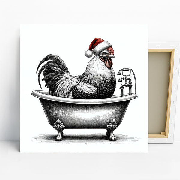 Keywords: Rooster Wall Art, Bathtime Rooster Art, Holiday Wall Art, Farmhouse Decor, Rustic Decor, Bohemian Decor, Animal Art, Whimsical Art, Country Art, Bathroom Art, Kitchen Art, Living Room Art, Laundry Room Art, Black and White Art, Red Accent Art, Santa Hat Art, Rooster Canvas, Holiday Cheer, Festive Decor, Humorous Art, Funny Rooster Art, Seasonal Artwork, Vintage Bathtub Art, Animal Poster, Country Kitchen Decor, Farmhouse Bathroom Decor, Bohemian Living Room Art, Holiday Gift Idea, Housewarming Gift, Unique Wall Art
