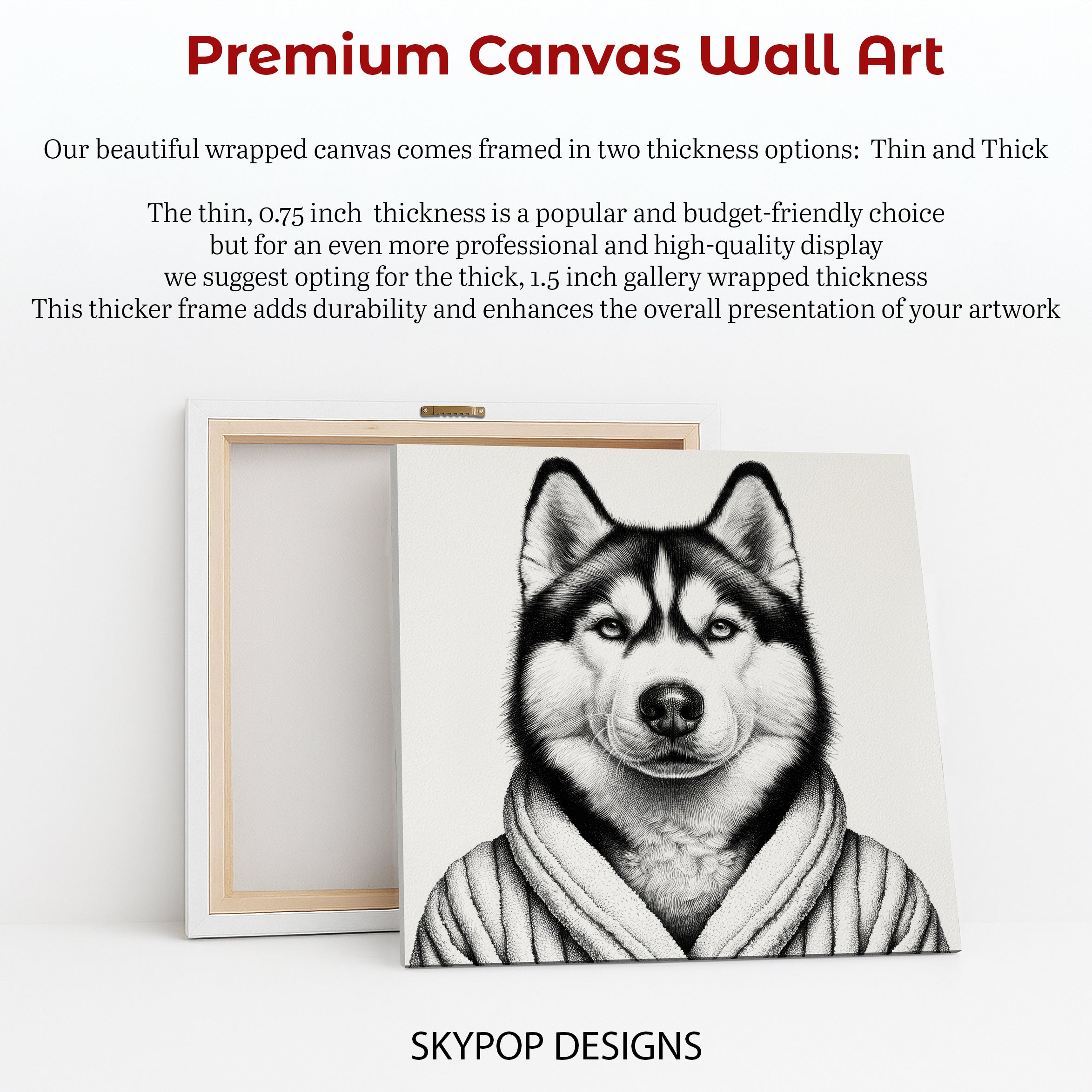 Keywords: Siberian Husky art, husky wall art, black and white art, canvas wall art, modern decor, minimalist art, animal art, dog lover gift, sophisticated husky, robe art, home decor, living room art, bedroom art, office decor, entryway decor, contemporary art, dog portrait, monochrome art, grey decor, Siberian husky poster, unique wall art, art print, pet art, animal portrait, upscale decor, stylish home, gift for dog lover, high contrast art, quality canvas print, wall decor statement