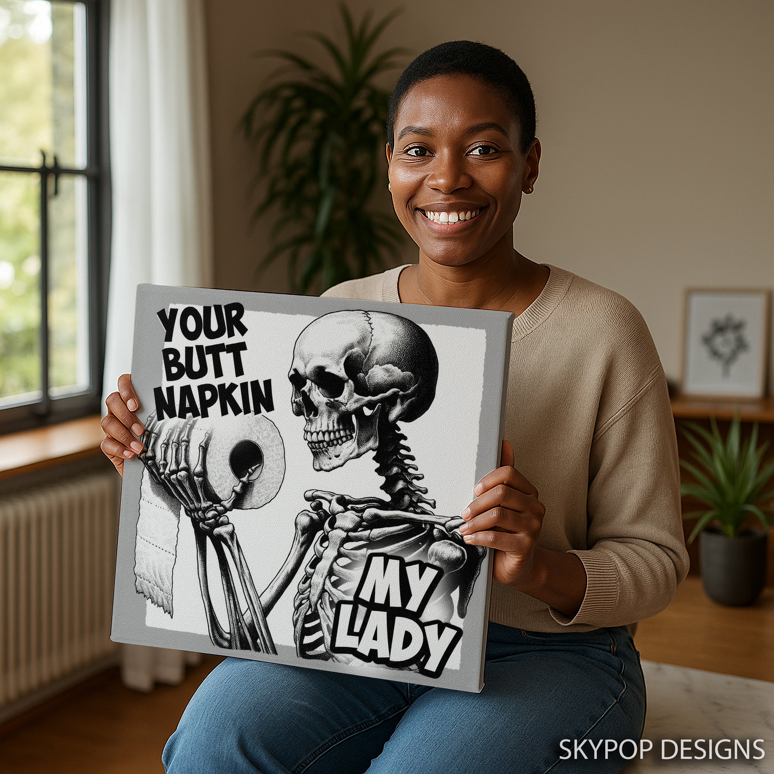 Add a touch of dark humor and edgy style to your space with this striking skeleton canvas wall art. This unique poster captures a skeleton holding toilet paper with the bold statement Your Butt Napkin My Lady, perfect for injecting personality into any room. The high-contrast black and white design, reminiscent of street art and vintage prints, makes this canvas wall art a conversation starter. It’s an ideal piece for modern living rooms, game rooms, or even a quirky bathroom decor. This artwork is a fantastic way to showcase your sense of humor and appreciation for unconventional art, making it stand out as a focal point. The detailed linework of the skeleton combined with the graphic typography creates a visually captivating effect across this poster. Looking for a unique gift? This skeleton print is perfect for birthdays, housewarmings, or as a fun present for someone who appreciates a bit of edgy decor. Elevate your wall decor with this memorable and eye-catching canvas art that is sure to bring a smile. Transform your office or any space needing a bold statement with this distinctive piece. This versatile wall art enhances any modern or bohemian themed interior. Celebrate your unique style with this impactful and humorous skeleton artwork today.