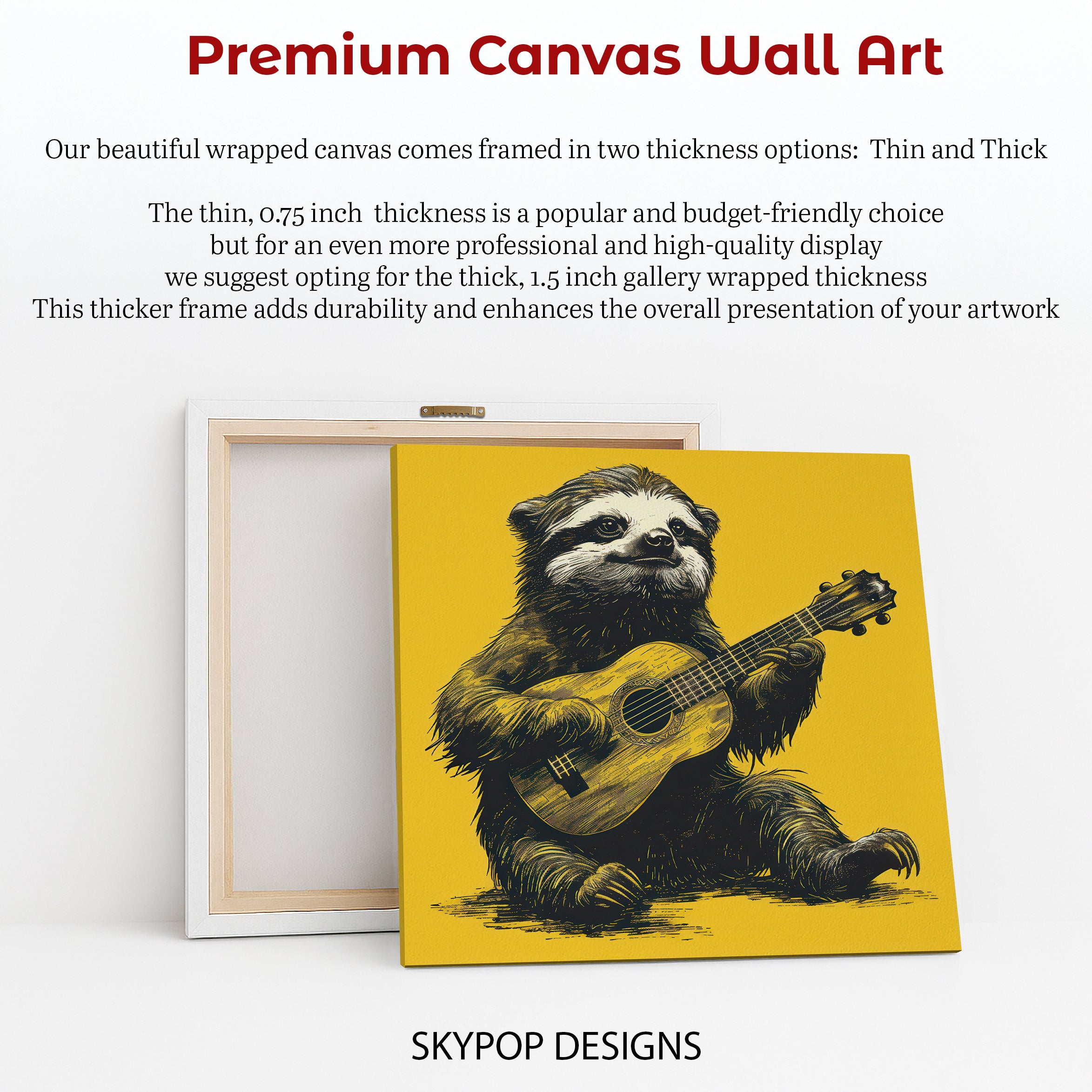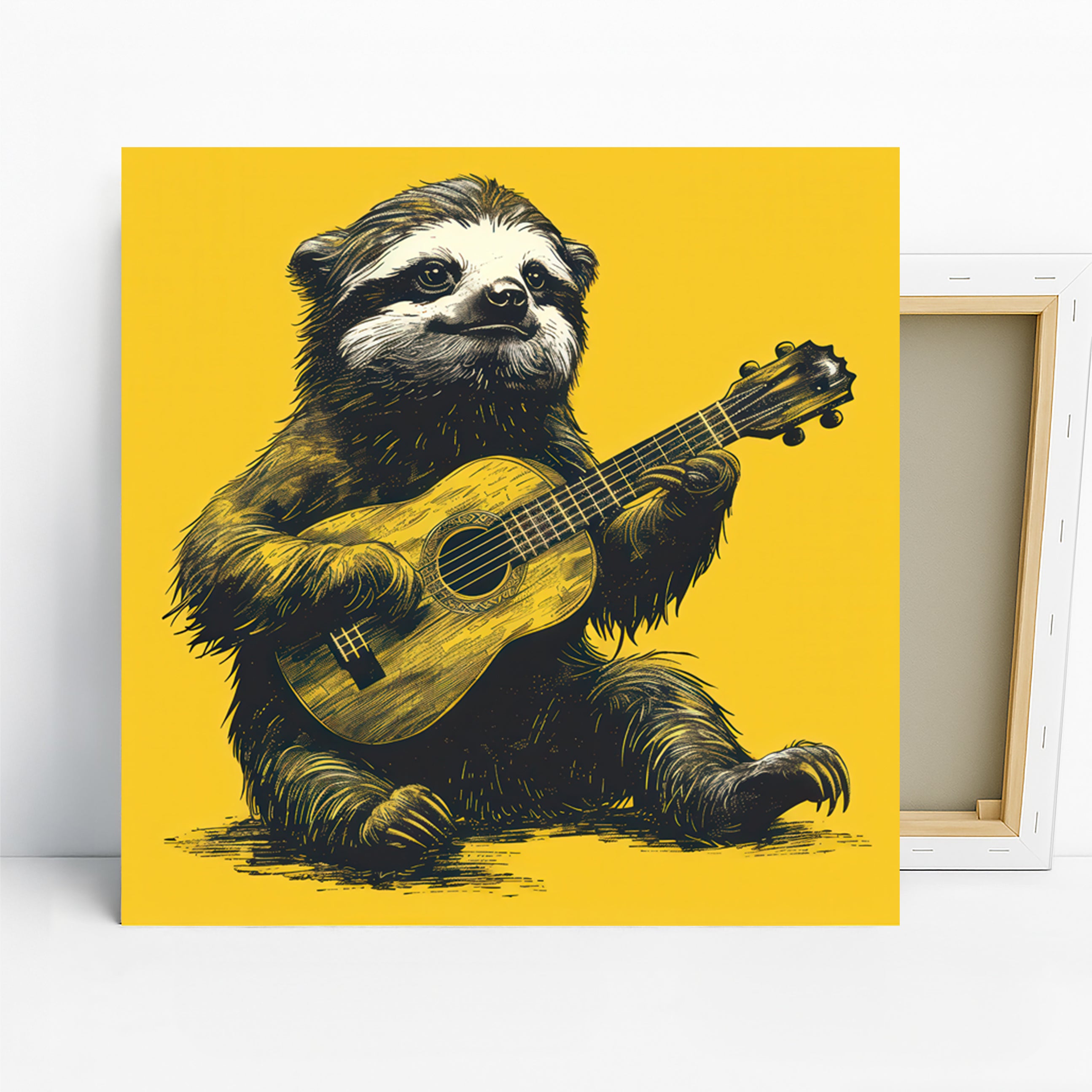 Keywords: sloth art, sloth canvas, guitar art, animal art, whimsical art, nature art, contemporary decor, modern decor, bohemian decor, living room art, bedroom art, kids room decor, office wall art, yellow art, black and white art, unique wall art, wall decor, home decor, poster art, canvas print, music lover gift, birthday gift, housewarming gift, holiday gift, charming art, joyful art, colorful art, animal poster, sloth illustration, wall art decor