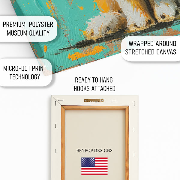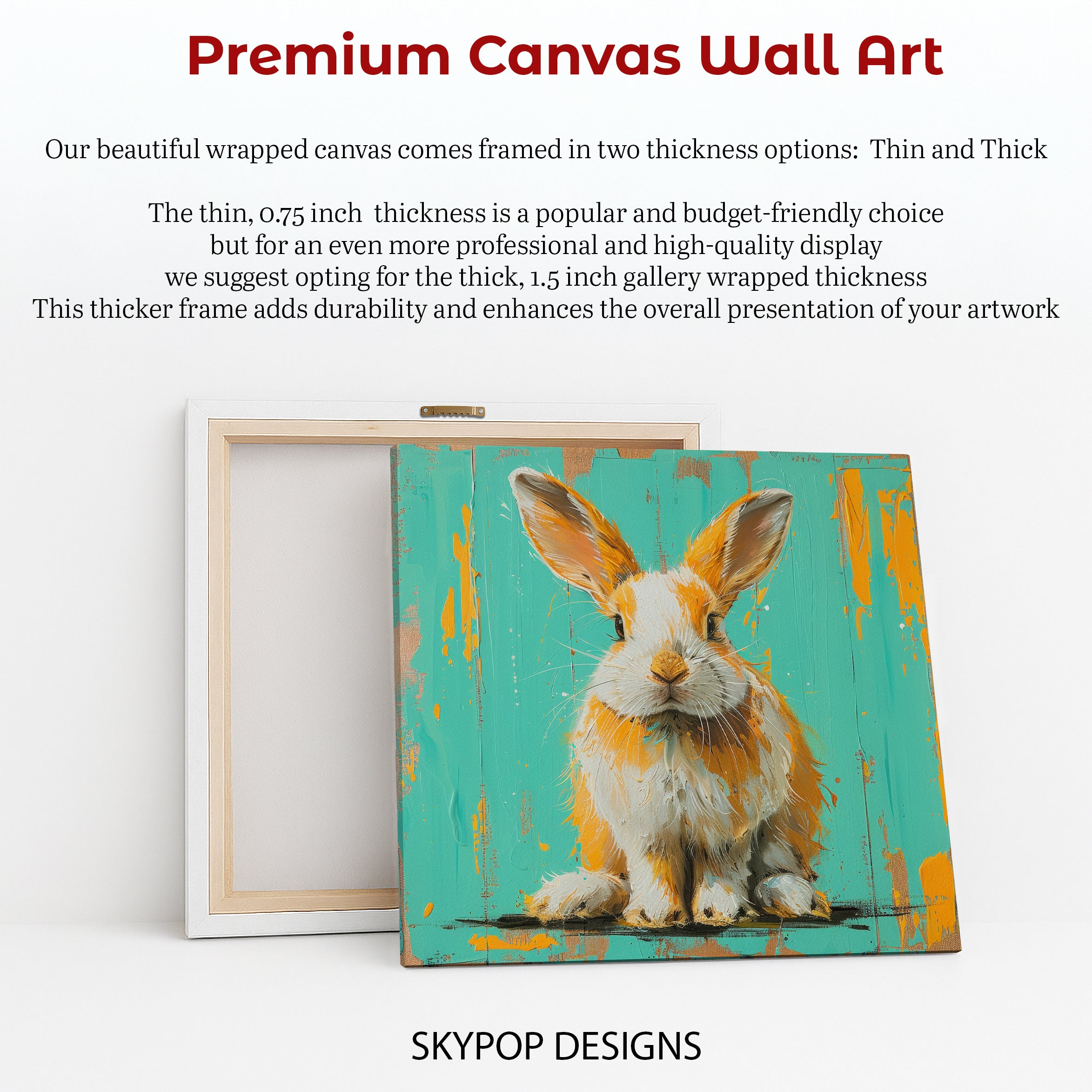 Transform your living space with this captivating bunny canvas wall art, featuring a vibrant pop art interpretation of a cute bunny. The striking turquoise backdrop accented with bold orange brushstrokes instantly elevates any room, creating a focal point that is both modern and playful. This unique poster or canvas wall art is perfect for contemporary living rooms, cozy bedrooms, or a child's cheerful space, adding a splash of personality and color. The textured impasto technique gives this artwork a dynamic feel, making it a standout piece in any collection. Its vibrant color palette of turquoise, orange, and white evokes feelings of joy and creativity, enhancing the mood of your home. This versatile wall art is ideal for those seeking to incorporate modern or Scandinavian decor with a touch of bohemian flair. It’s a fantastic gift for housewarmings, birthdays, or holidays, bringing smiles and warmth to loved ones. High-quality printing ensures that every detail of this stunning bunny poster is brought to life. Whether you want to update your entryway or create a whimsical nursery, this canvas wall art offers immense visual appeal. Elevate your home decor with this eye-catching animal art that celebrates charm and contemporary design. Brighten your walls and make a statement with this unforgettable bunny artwork today.