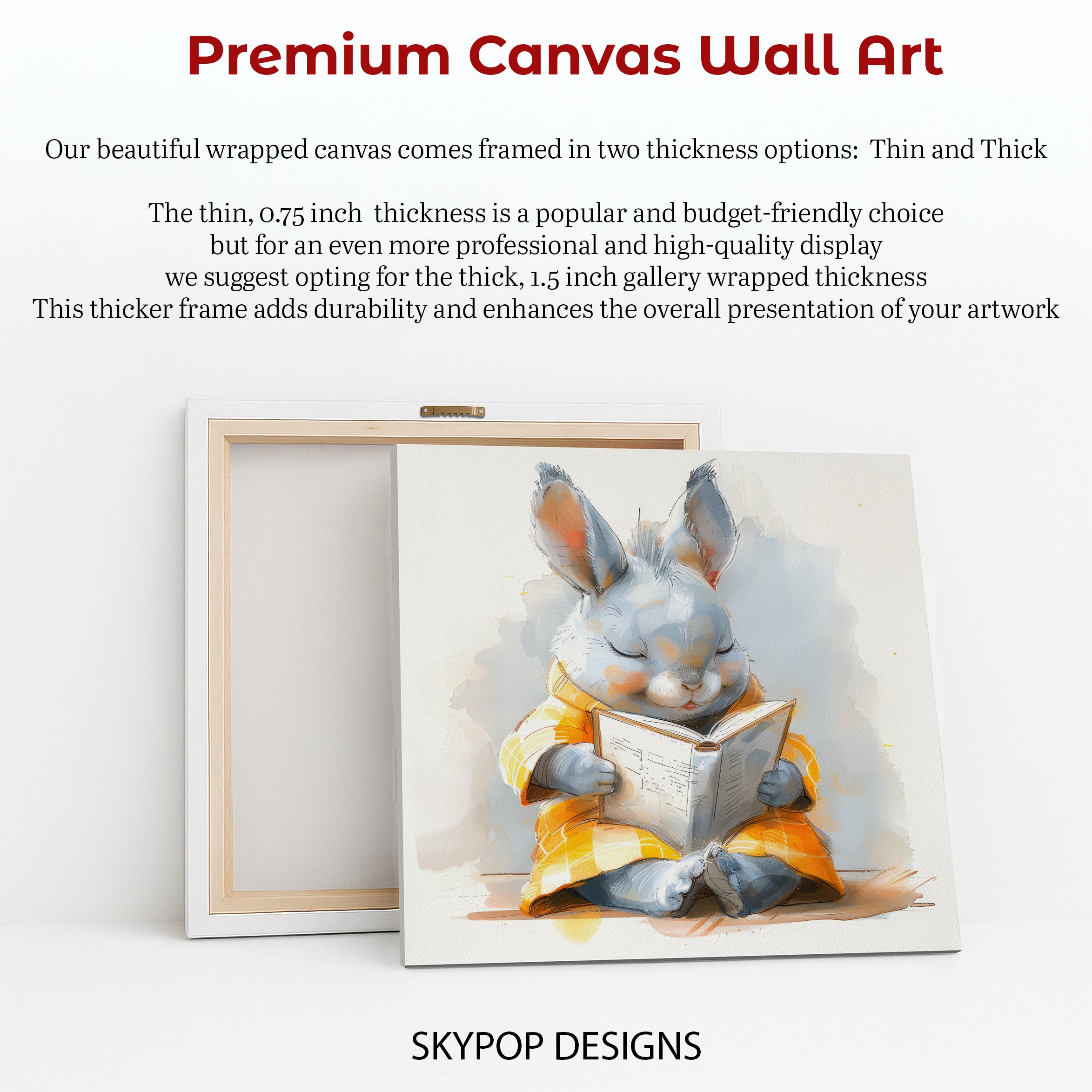 Transform your space with this charming bunny canvas wall art featuring a cute bunny engrossed in a book. The playful watercolor style and warm yellow and grey tones create a captivating focal point that brings a sense of calm and joy to any room. This unique poster or canvas wall art is perfect for adding a touch of whimsy to children's rooms, cozy bedrooms, or even a modern living room. The soft color palette enhances the peaceful atmosphere, making this a delightful piece of animal art for your modern decor. Ideal for enhancing bohemian or contemporary spaces, this canvas wall art adds personality and charm. The expressive brushstrokes give this artwork a handmade feel, ensuring it complements various interior design styles. It’s a great gift idea for birthdays, housewarmings, or any occasion to bring a smile to someone's face. High-quality printing ensures the vibrant watercolor effects are beautifully preserved on this canvas. Whether you're looking to elevate your kid's room decor or add a heartwarming touch to your living room, this bunny art is a wonderful choice. Bring this delightful piece of wall art into your home and create a cozy, inspiring ambiance today.