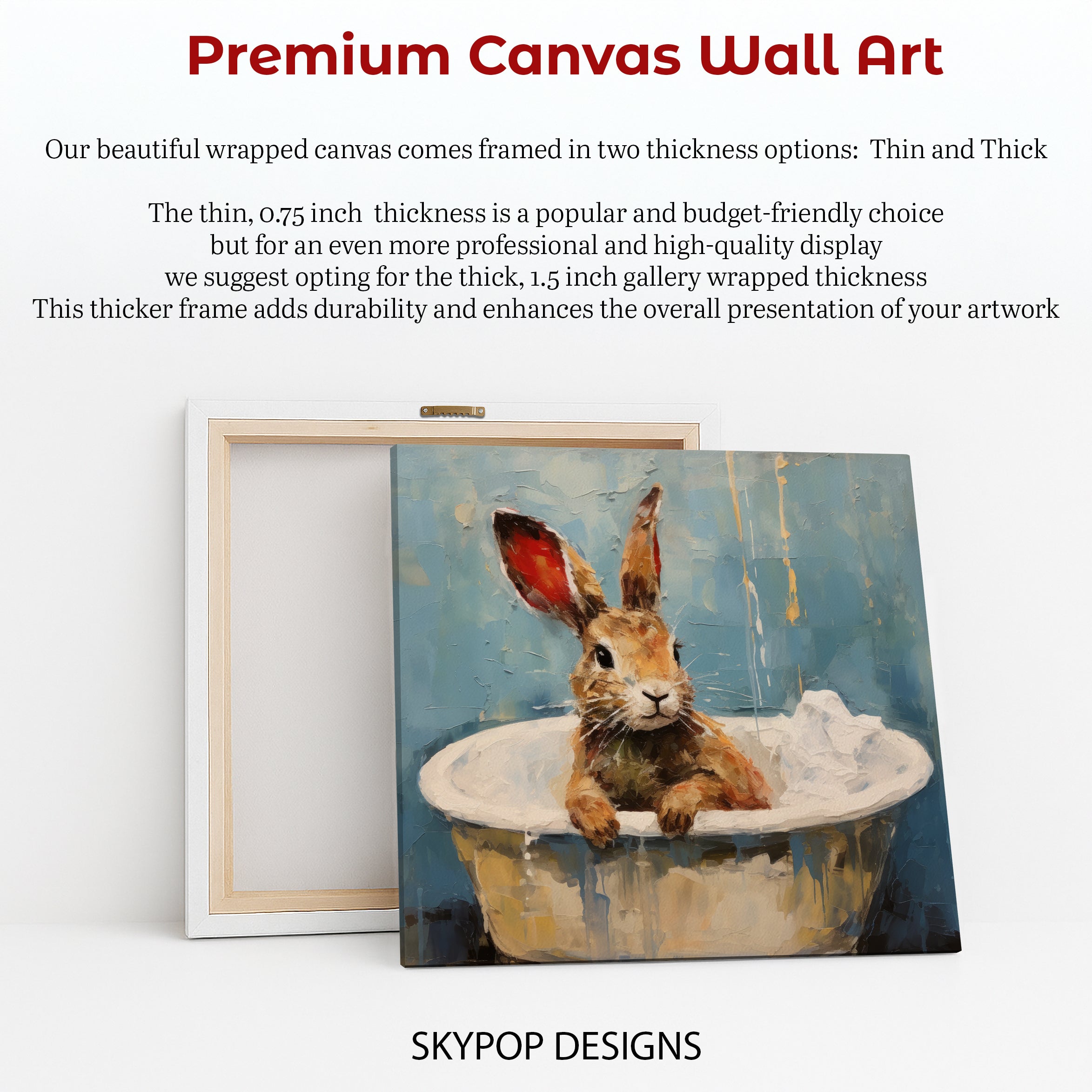 Transform your space with this adorable bunny in a bathtub canvas wall art, a delightful piece that brings a touch of whimsy and charm to any room. The vibrant, textured strokes of this poster create a captivating visual that celebrates the simple joy of a bubble bath, making it perfect for modern living rooms or cozy children's bedrooms. This animal art piece showcases a brown bunny surrounded by fluffy white bubbles, set against captivating blue and gold abstract backgrounds, evoking a sense of calm and playful relaxation. The striking color palette of blues, browns, and whites makes this canvas wall art incredibly versatile, fitting seamlessly into bohemian or Scandinavian decor styles. This eye-catching bunnt poster is ideal for anyone looking to add character to their bathroom or create a cheerful focal point in their nursery, radiating warmth and happiness. The tactile quality of the brushwork elevates this artwork, ensuring the canvas wall art is a conversation starter and a source of daily delight. Looking for a unique gift? This charming bunny artwork is a perfect housewarming present or a thoughtful birthday surprise for animal lovers of all ages. Its expressive style and endearing subject matter inspire smiles and create a welcoming atmosphere in any home. Elevate your walls with this high-quality canvas print, showcasing the playful spirit of this beloved woodland creature. Discover the joy of unique wall decor and bring this heartwarming bunny scene into your home today.