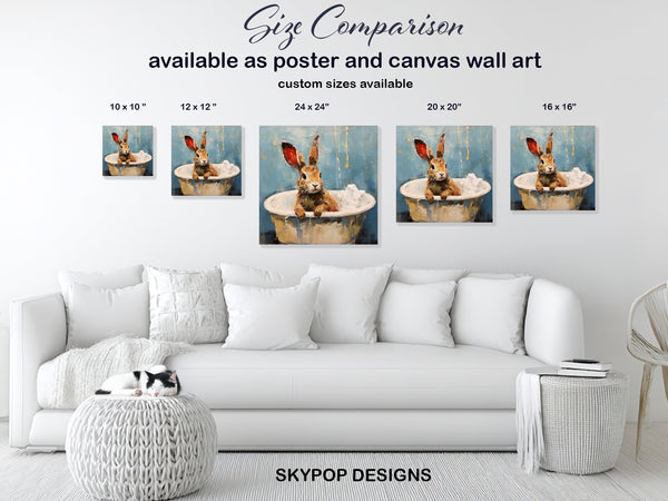 Bunny Bath Art, Canvas or Poster, Whimsical Modern Decor, Bathroom Childrens Room Bedroom Living Room Wall Art, Blue Brown White Multicolor