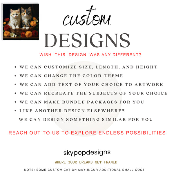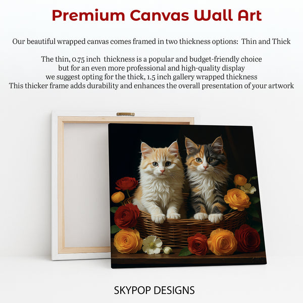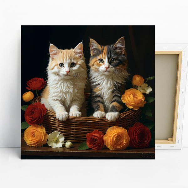 Bring charm and warmth into your home with this delightful cat canvas wall art. Featuring two adorable kittens nestled in a rustic basket surrounded by vibrant roses, this poster is sure to capture hearts. The rich tapestry of colors, from the warm oranges and reds of the flowers to the soft fur of the cats, creates a striking visual appeal, making it perfect for a cozy living room or a whimsical nursery. This stunning canvas wall art blends animal art with a touch of traditional charm and bohemian flair, making it a versatile addition to any decor style. It’s an ideal piece to transform your bedroom into a serene sanctuary or to add a playful touch to a children's room. The intricate details within this artwork, from the kittens' expressive eyes to the delicate petals of the roses, are beautifully rendered, offering a captivating focal point. This piece not only enhances your wall decor but also brings a sense of joy and comfort, embodying the simple pleasures of home. Whether you are looking for unique wall art for your home or a thoughtful gift for a cat lover for a birthday or holiday, this canvas print is a wonderful choice. Its high-quality printing ensures lasting vibrancy and detail, making it a cherished addition to your art collection. Elevate your space with this heartwarming cat poster that celebrates the beauty of nature and companionship. This captivating artwork promises to inspire smiles and create a welcoming atmosphere in any room it graces. Add this eye-catching canvas wall art to your decor and let its adorable charm brighten your life.