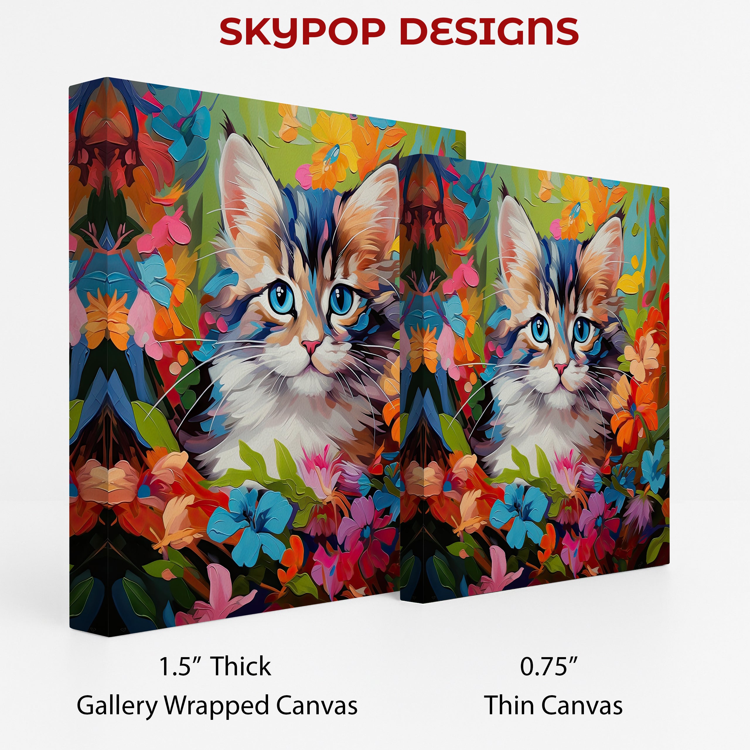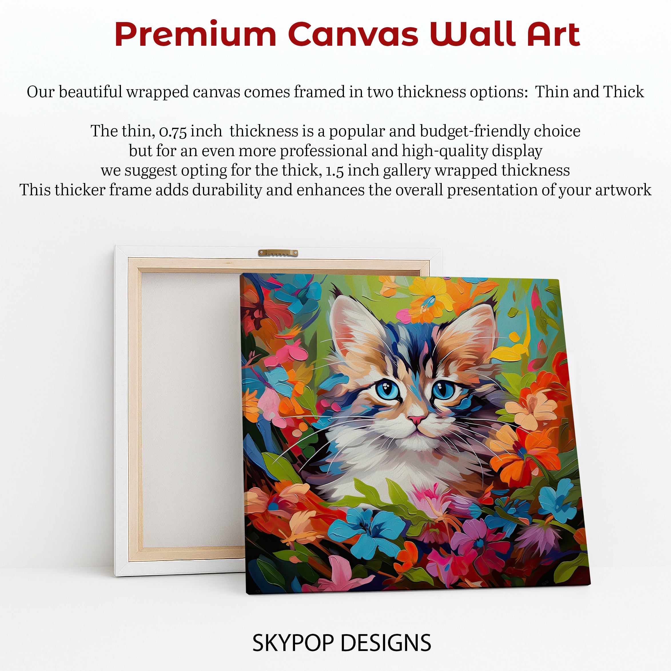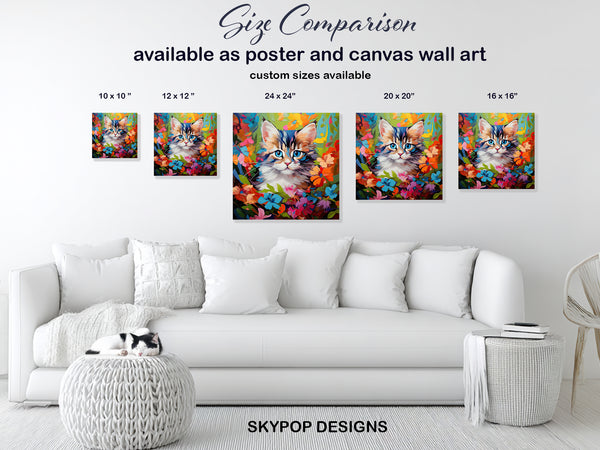 Keywords: cat canvas art, animal wall art, pop art cat, contemporary art for home, bohemian decor, modern living room art, vibrant floral art, multicolor cat poster, blue eyed cat art, pink and orange art, cat lover gift, housewarming gift, birthday gift for her, children's room decor, entryway art, animal art print, colorful home decor, statement wall art, unique wall art, framed cat art, unframed cat print, pet themed decor, joyful art, energetic atmosphere art, new home gift, art for bedroom, modern cat art, pop art wall decor, vibrant animal art, contemporary cat poster