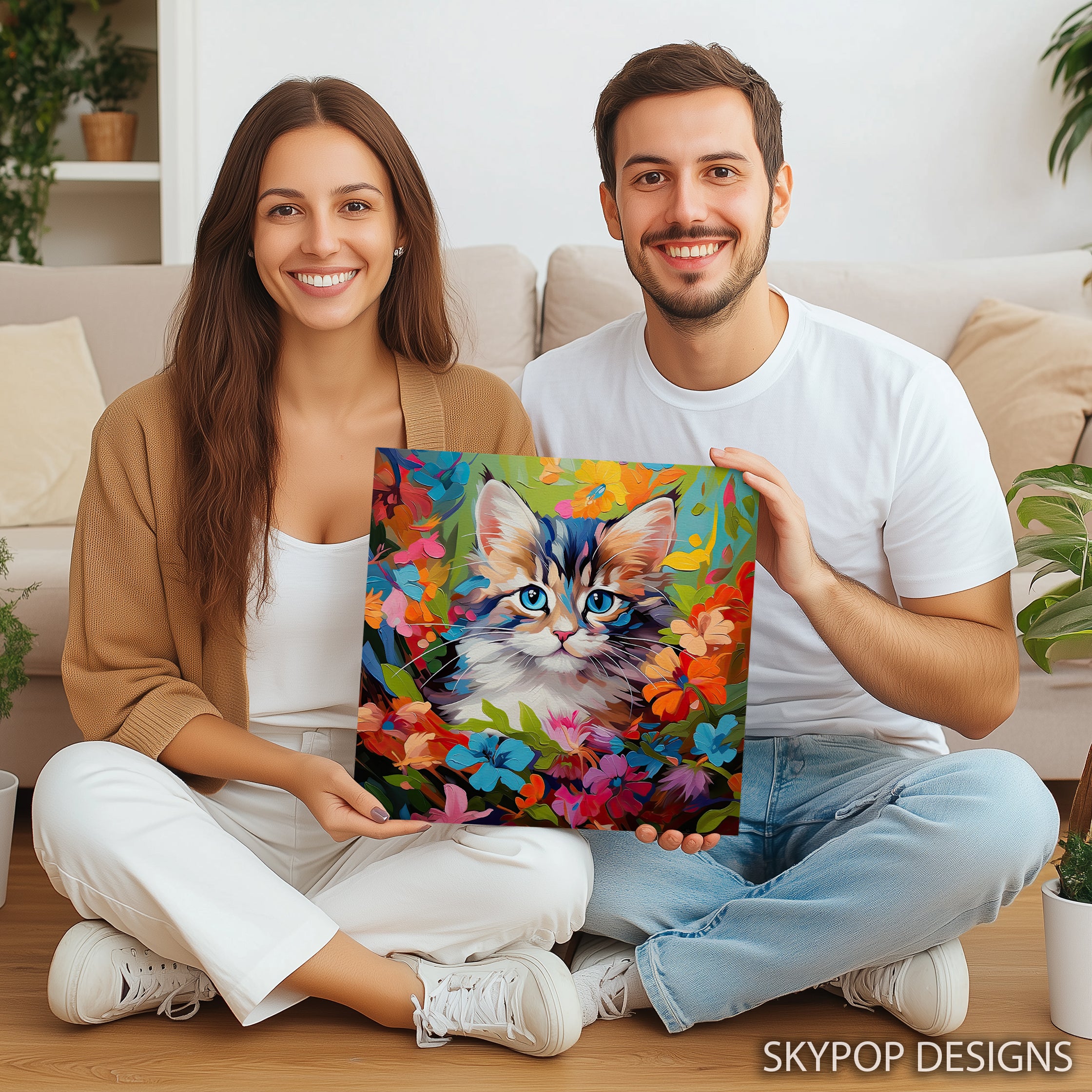 Bring life and color into your home with this stunning cat canvas wall art, featuring a captivating feline surrounded by a symphony of vibrant flowers. This eye-catching poster showcases a cat's mesmerizing blue eyes and intricate fur patterns, rendered in a bold, contemporary pop art style. The rich, multicolor palette of reds, oranges, blues, and pinks instantly transforms any space, creating a cheerful and energetic atmosphere. This artwork is perfect for modern living rooms, accenting bohemian decor, or adding a playful touch to a bedroom or children's room. The dynamic brushstrokes and vivid colors make this canvas wall art a true statement piece, ideal for cat lovers and art enthusiasts alike. Elevate your walls with this unique animal art, designed to inspire joy and add a splash of personality. It's a fantastic gift for housewarmings, birthdays, or any occasion to celebrate someone special. The high-quality print captures every detail, ensuring this poster will be a cherished part of your decor for years to come. Showcase your love for pets and art with this striking piece. Transform your home into a vibrant sanctuary that reflects your unique style. This cat poster is more than just decor; it's a conversation starter that brings positive energy. Add this beautiful canvas art to your collection today and let its charm brighten your everyday.