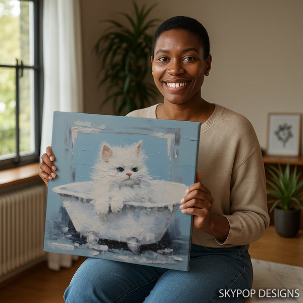 Transform your living space with this captivating cat canvas wall art, showcasing a fluffy white cat enjoying a bubbly bath. This striking poster features a modern, impressionistic style that adds a touch of whimsy and charm to any home. The vibrant blues and whites create a serene yet playful atmosphere, perfect for enhancing your bedroom, bathroom, or children's room decor. This canvas wall art is ideal for modern and minimalist interiors, bringing a pop of personality and warmth. The textured brushstrokes give this artwork a unique depth, making it an eye-catching conversation starter. Showcase your love for pets with this delightful cat poster, a perfect addition to a contemporary living room or a cozy nursery. It's a wonderful gift for cat lovers, housewarmings, or birthdays, celebrating the joy pets bring. The unique blend of abstract elements and figurative subject matter makes this wall art versatile and trendy. Elevate your home's aesthetic with this high-quality canvas print that captures the essence of a playful feline friend. Bring a calming and joyful vibe to your walls with this stunning piece of animal art today.