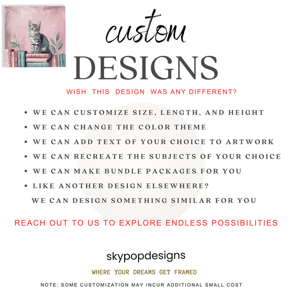 Transform your home with this adorable kitten canvas wall art, a captivating piece that enchants with its whimsical charm. This eye-catching poster showcases a cute tabby kitten perched gracefully among vintage books and delicate flowers, creating a cozy and inviting atmosphere. The soft pink backdrop and muted teal and brown tones of the books offer a soothing color palette, perfect for enhancing the ambiance of any room. This unique artwork, a beautiful blend of animal art and nature-inspired elements, is ideal for adding personality to bohemian or shabby chic interiors, and it complements Scandinavian decor beautifully. Whether you are decorating a living room, a tranquil bedroom, a playful children's room, or a quiet office space, this versatile canvas wall art brings warmth and character. The detailed rendering of the kitten’s fur and the gentle floral arrangements create a stunning visual appeal that makes this poster a perfect focal point. It’s an ideal gift for cat lovers, bookworms, or anyone looking to add a touch of charm and comfort to their living space, making it a thoughtful housewarming or birthday present. Elevate your wall decor with this sentimental and artistic creation, celebrating the simple joys of life and the beauty of nature. Invest in high-quality canvas art that will inspire for years to come, making any space feel more welcoming and cherished. Discover the joy of bringing this sweet kitten’s story into your home today.