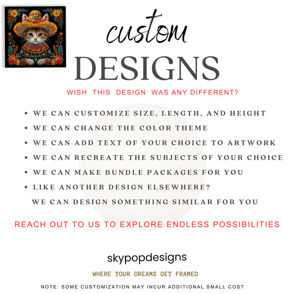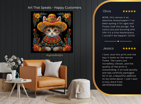 Transform your home with this vibrant cat canvas wall art, showcasing a charming feline adorned in a festive sombrero and colorful outfit, surrounded by a floral border. This striking piece of animal art is perfect for adding a playful and eclectic touch to any living room, bedroom, or kitchen. The multicolor palette, featuring warm yellows, oranges, and striking teal accents, creates a captivating and joyful atmosphere in your space. Elevate your walls with this eye-catching poster that seamlessly blends pop art aesthetics with bohemian decor influences. It's an ideal centerpiece for a contemporary entryway or a quirky addition to a gallery wall, guaranteed to spark conversation and smiles. The intricate details of the floral elements and the cat's expressive eyes make this canvas wall art a truly unique find. Use this poster to infuse your home with personality and warmth, creating a visually engaging environment that reflects your unique style. This versatile artwork is perfect for cat lovers, art enthusiasts, or as a memorable housewarming gift for birthdays or holidays. High-quality printing ensures the rich colors and detailed textures pop, making it a stunning focal point in any room. Celebrate art and everyday joy with this delightful feline-themed wall art. Elevate your decor today.