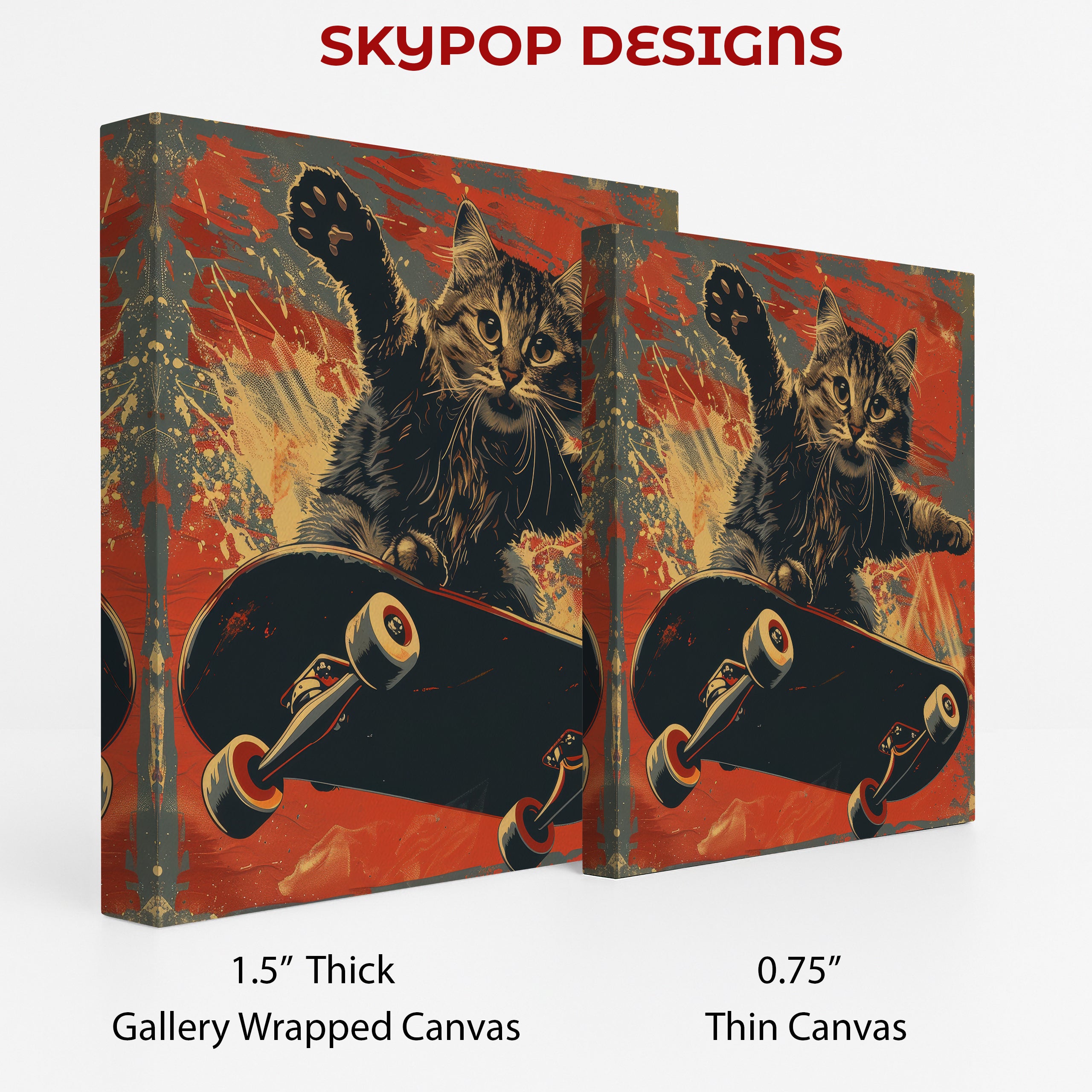 Skater Cat Art, Canvas or Poster, Pop Art Bohemian Urban Decor, Living Room Game Room Office Wall Art, Multicolor Red Black Grey Print