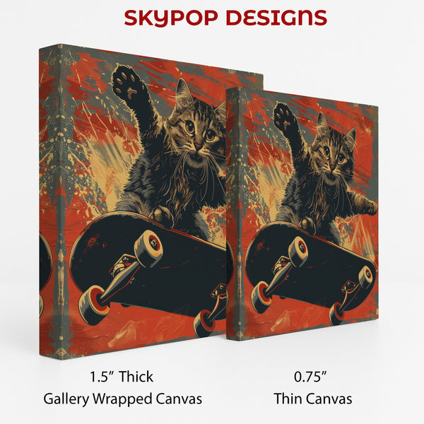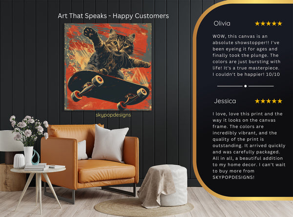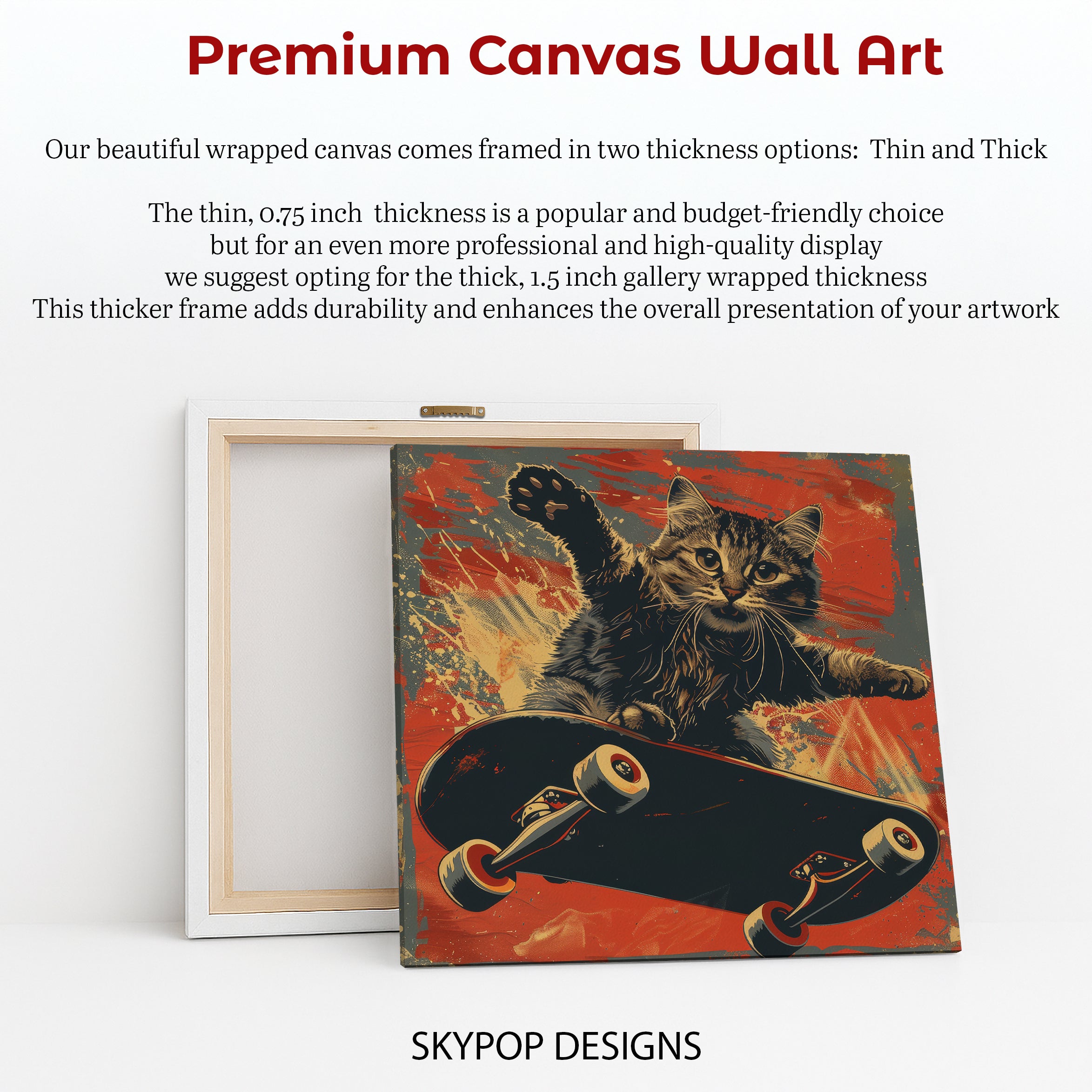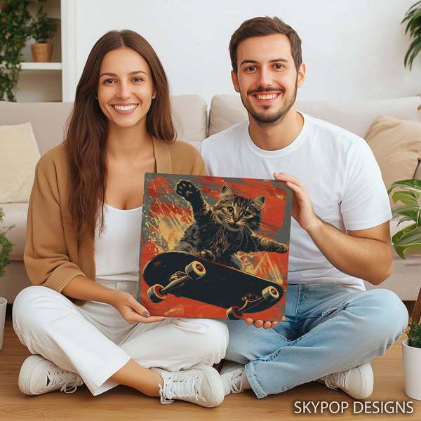 Unleash your inner rebel with this dynamic skater cat canvas wall art. This eye-catching poster features a cool cat confidently riding a skateboard, perfect for adding a touch of urban flair to any space. The striking blend of multicolor, red, black, and grey creates a vibrant and energetic atmosphere, making this canvas print a real statement piece. Our cat wall art is ideal for transforming your living room, game room, or office into a more exciting and personalized area. This poster embodies modern and bohemian decor styles, bringing a playful yet edgy vibe to your home. It’s perfect for casual spaces, skate shops, or anyone who loves unique animal art. The bold graphics and abstract background elements enhance the striking visual appeal of this cat skateboarding artwork. This canvas wall art is a fantastic gift for birthdays, housewarmings, or holidays for anyone who appreciates quirky and cool decor. Elevate your walls with this high-quality print that showcases a cat's adventurous spirit. Use this vibrant piece of street art to add personality and a pop of color to your interior design. Transform your room and capture attention with this unique cat canvas poster today.