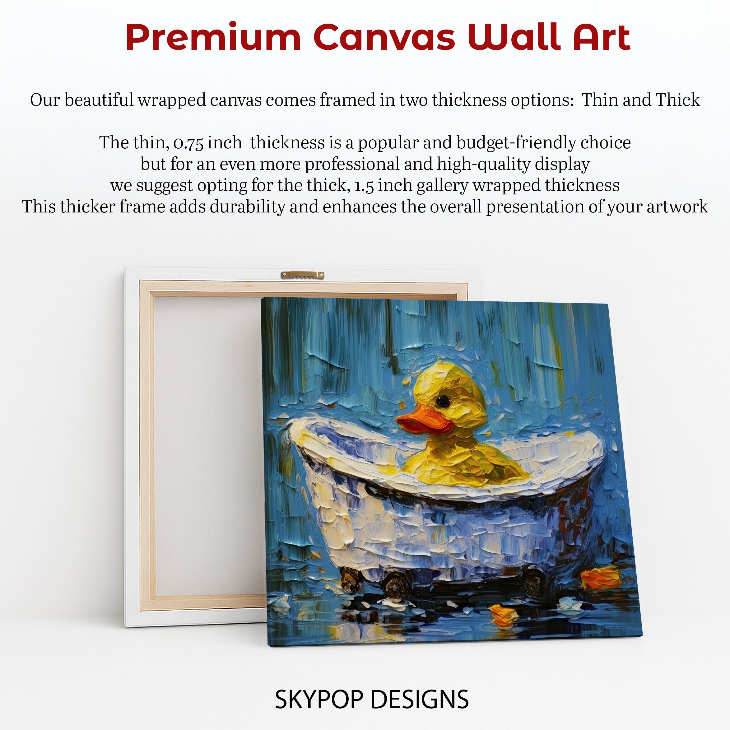 Keywords: Canvas Wall Art, Rubber Duck Art, Bath Time Decor, Yellow Duck Painting, Blue Bath Art, Children's Room Decor, Nursery Wall Art, Bathroom Art, Whimsical Animal Art, Impressionism Style, Bohemian Decor, Modern Bathroom Decor, Kids Room Art, Playful Wall Art, Bright Yellow Art, Cheerful Decor, Bubble Bath Art, Ducks in Bathtub, Animal Themed Art, Entryway Art, Housewarming Gift, Birthday Gift Art, Holiday Gift Decor, Textured Canvas Print, Quality Wall Print, Vibrant Home Decor, Happiness Art, Childlike Wonder Decor, Relaxing Bath Art, Unique Wall Art