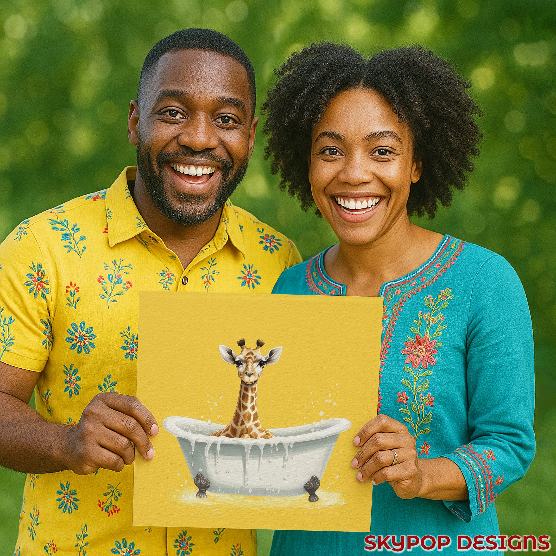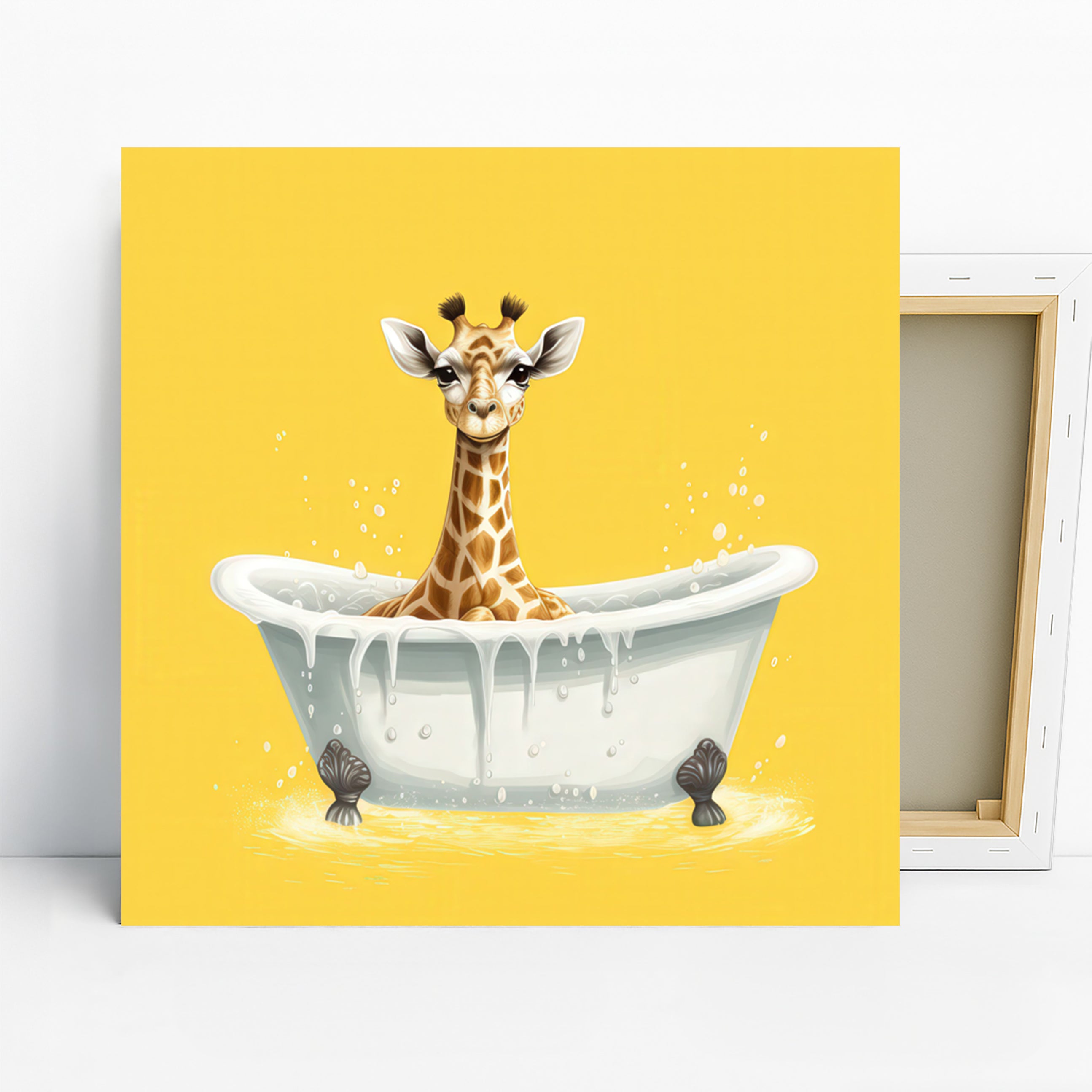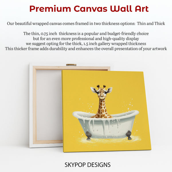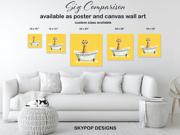 Brighten your home with this adorable giraffe canvas wall art, featuring a cute giraffe enjoying a bubbly bath. The striking yellow background and playful scene create a cheerful focal point perfect for any room. This charming poster or canvas wall art is ideal for modern bathrooms, whimsical children's rooms, or as a delightful addition to your living room decor. The joyful yellow hues and the endearing giraffe subject evoke feelings of happiness and relaxation. This unique artwork elevates your space with its contemporary art style and whimsical animal theme. It's a perfect gift for birthdays, housewarmings, or any occasion - bringing smiles and warmth into any home. The detailed illustration captures the playful spirit of the giraffe, making this canvas wall art a conversation starter. Available in various sizes, this high-quality print adds personality and charm to your wall decor. Transform your bathroom or nursery into a cozy, fun-filled space with this captivating giraffe print. Celebrate the simple joys of life with artwork that inspires happiness. Add this delightful piece to your collection and enjoy its uplifting presence every day. Elevate your home with this eye-catching and heartwarming giraffe-themed wall art today.