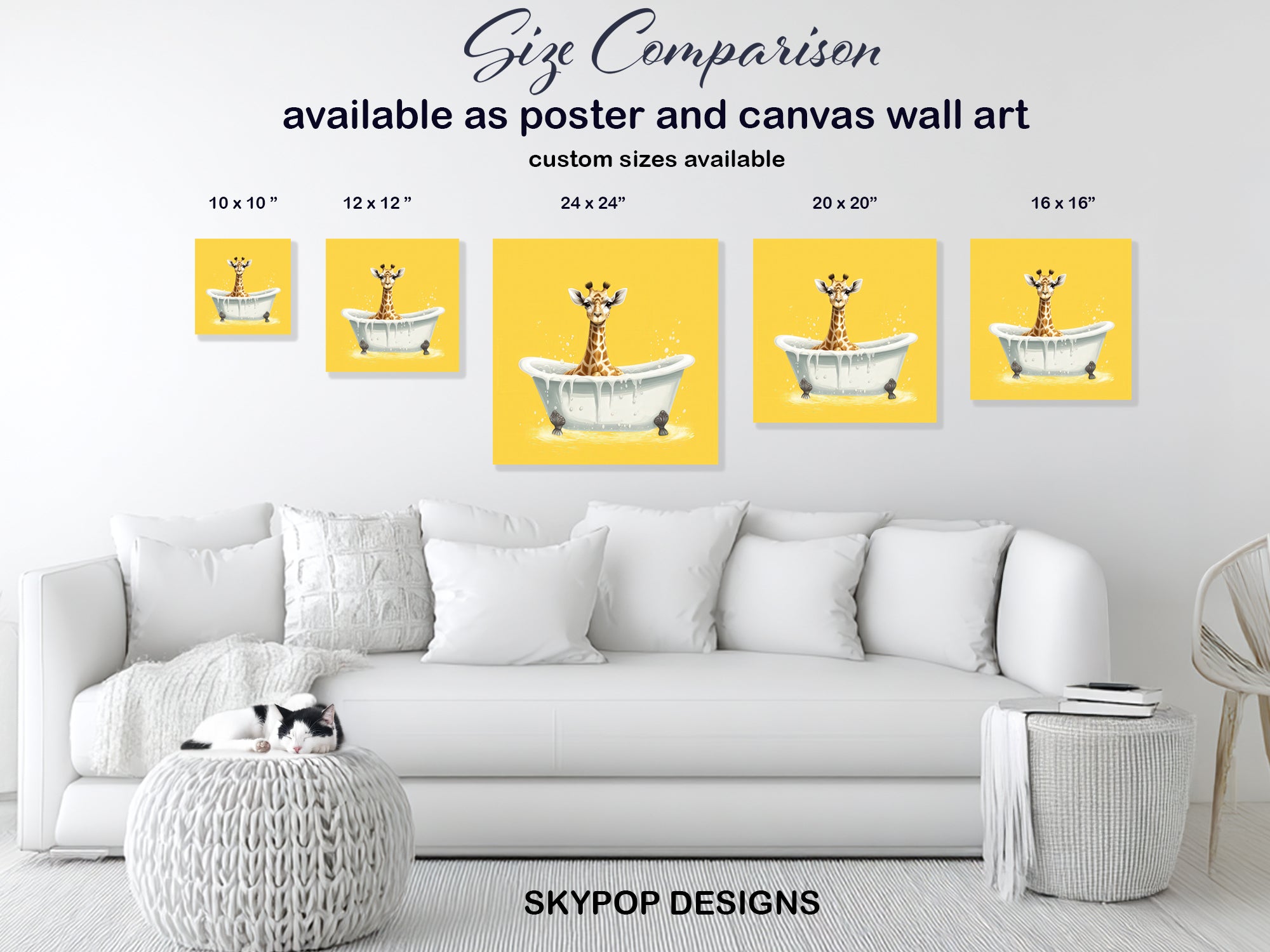 Giraffe Bath Time Art, Canvas or Poster, Whimsical Modern Bohemian Decor, Bathroom Nursery Living Room Art, Yellow White Brown Multicolor