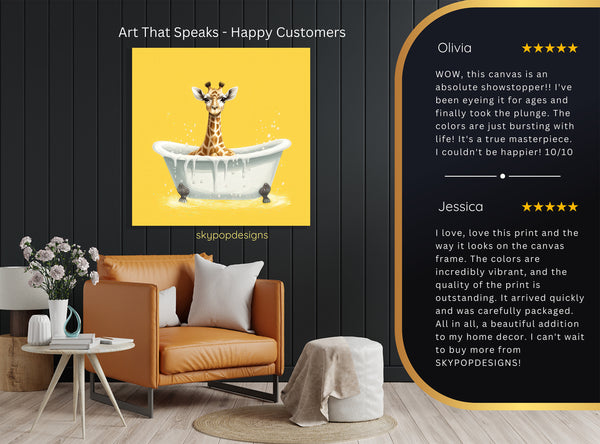 Keywords: Giraffe Wall Art, Yellow Canvas Art, Bubbly Bath Art, Whimsical Animal Art, Modern Decor, Bohemian Style, Contemporary Art, Bathroom Art, Children's Room Decor, Living Room Art, Nursery Wall Art, Yellow Decor, White Accents, Brown Details, Multicolor Artwork, Giraffe Print, Animal Theme, Cute Giraffe Art, Playful Scene, Cheerful Home Decor, Happy Art, Relaxing Artwork, Unique Wall Art, Birthday Gift, Housewarming Gift, Home Decor, Wall Decor, Canvas Print, Art Poster, Giraffe Bath Time