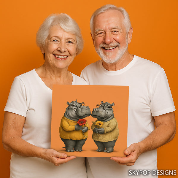 Elevate your home decor with this charming hippopotamus canvas wall art, a perfect piece to add joy and character to any room. This whimsical poster showcases two endearing hippos, each holding a vibrant flower, creating a heartwarming scene that is both playful and stylish. The striking combination of grey hippos, warm yellow sweaters, and colorful Gerber daisies adds a touch of personality to your walls. This wall art is ideal for transforming your living room into a cozy retreat, or it can bring a smile to your face in the bedroom or kitchen. Its contemporary style makes it a versatile addition to Bohemian, Modern, or Minimalist decor schemes. This canvas print is a wonderful gift for animal lovers, housewarmings, or birthdays, celebrating the simple beauty of nature and friendship. The detailed artwork and bold colors make this poster a captivating focal point, designed to enhance your space with its cheerful mood. High-quality canvas printing ensures lasting vibrancy and detail for this unique piece of animal art. Add a touch of playful sophistication to your home today with this delightful hippo canvas wall art. This striking piece perfectly balances artistic detail with a clean, modern aesthetic, making it a must-have for your wall art collection. Inspire smiles and happy conversations with this unique artwork.