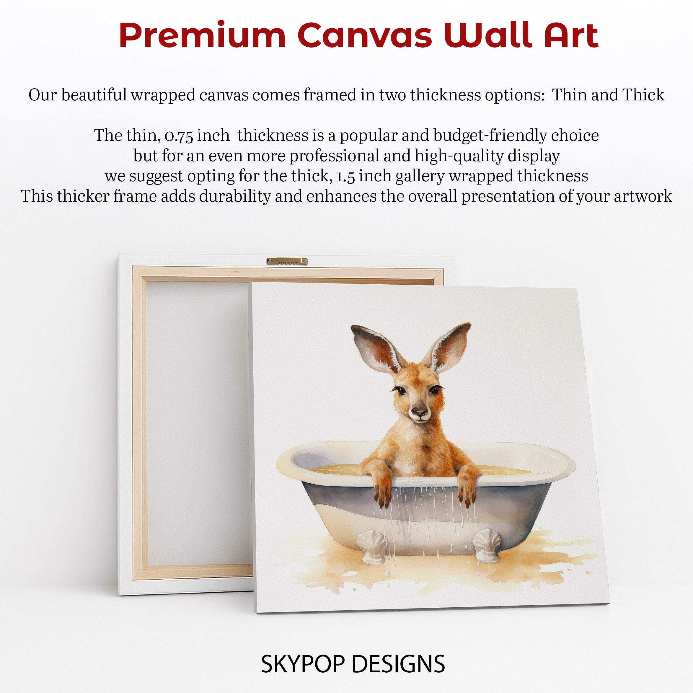 Keywords: Kangaroo Wall Art, Canvas Print, Animal Art, Whimsical Art, Contemporary Art, Minimalist Decor, Bohemian Decor, Modern Decor, Bathroom Art, Bedroom Art, Nursery Art, Living Room Art, Kangaroo Bath Time, Watercolor Art, Cute Animal Art, Unique Home Decor, Playful Art, Animal Lover Gift, Housewarming Gift, New Home Gift, Children's Room Decor, Wall Decor, Home Art, Artistic Flair, Earthen Tones, Brown Art, Beige Art, Multicolor Art, White Art, Kangaroo Poster