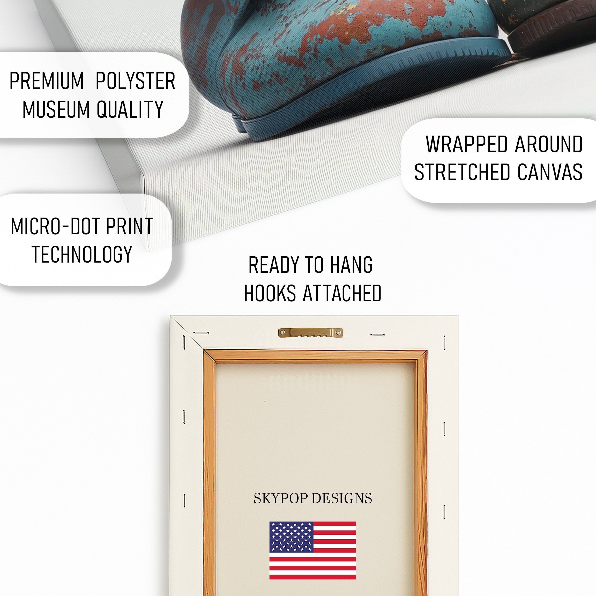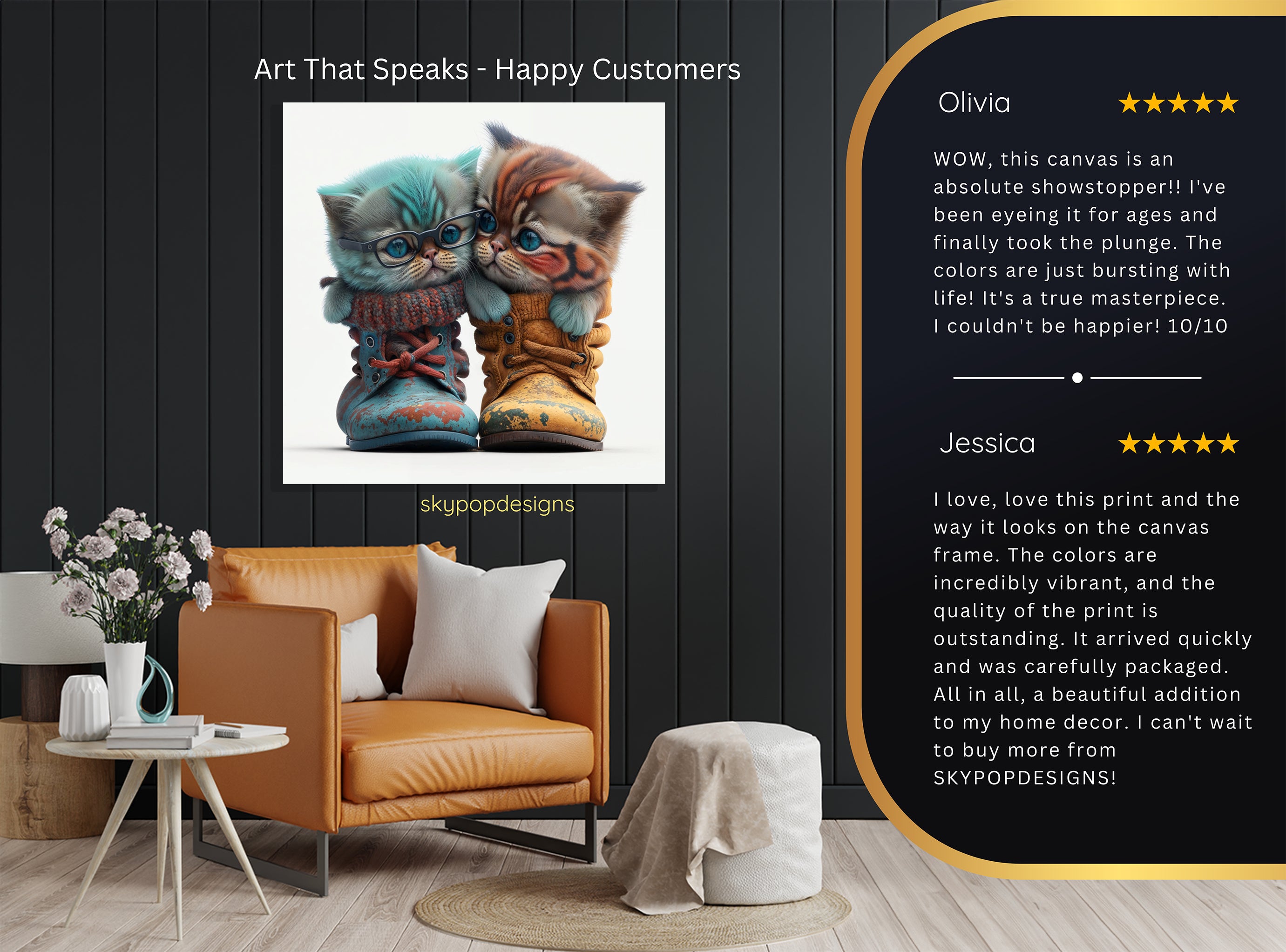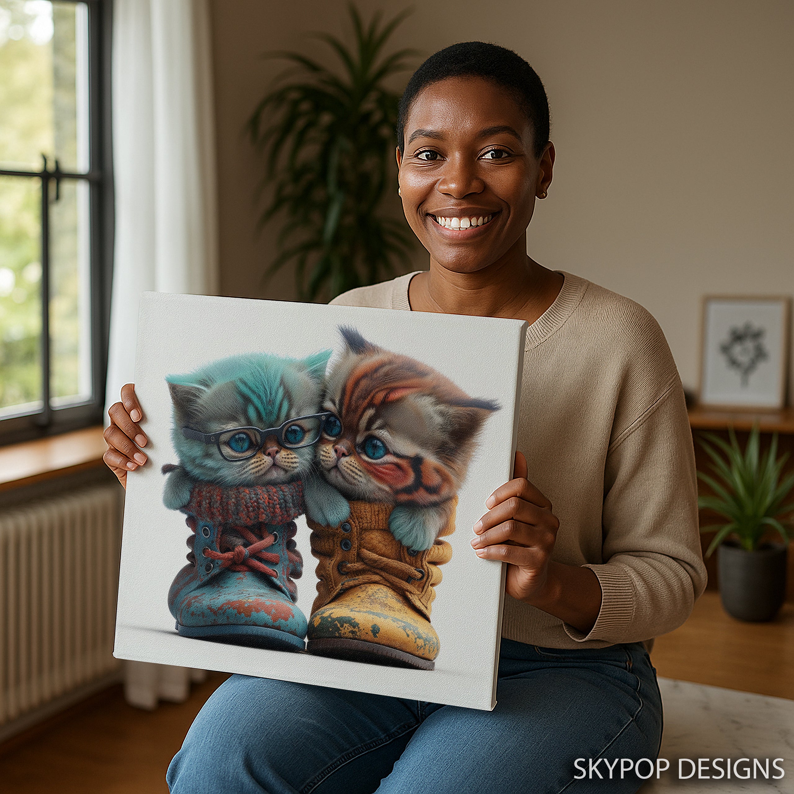 Transform your living space with this incredibly charming canvas wall art featuring two adorable kittens peeking out from whimsical boots. This captivating poster showcases a playful blend of animal art and contemporary pop art, perfect for injecting personality into any room. The vibrant multicolor palette, with prominent blues and oranges, creates a visually striking piece that immediately draws the eye. This delightful artwork is ideal for a child's room or nursery, bringing a touch of joy and wonder. It also makes a fantastic addition to a modern or bohemian living room, adding a fun and unique accent. The striking blue kitten with its cool teal accents and thoughtful glasses contrasts beautifully with the warm, earthy tones of the other kitten and their boots. This canvas wall art is a perfect gift for any cat lover, housewarming celebration, or birthday, bringing smiles and warmth. The intricate details and high-quality print on this poster ensure it will be a cherished addition to your wall decor. Elevate your home’s atmosphere with this incredibly cute and conversation-starting piece that celebrates the charm of kittens in an unforgettable way. Make this unique kitten boot artwork the highlight of your wall art collection today and add a splash of playful creativity to your home. This poster offers exceptional detail and will transform your room.