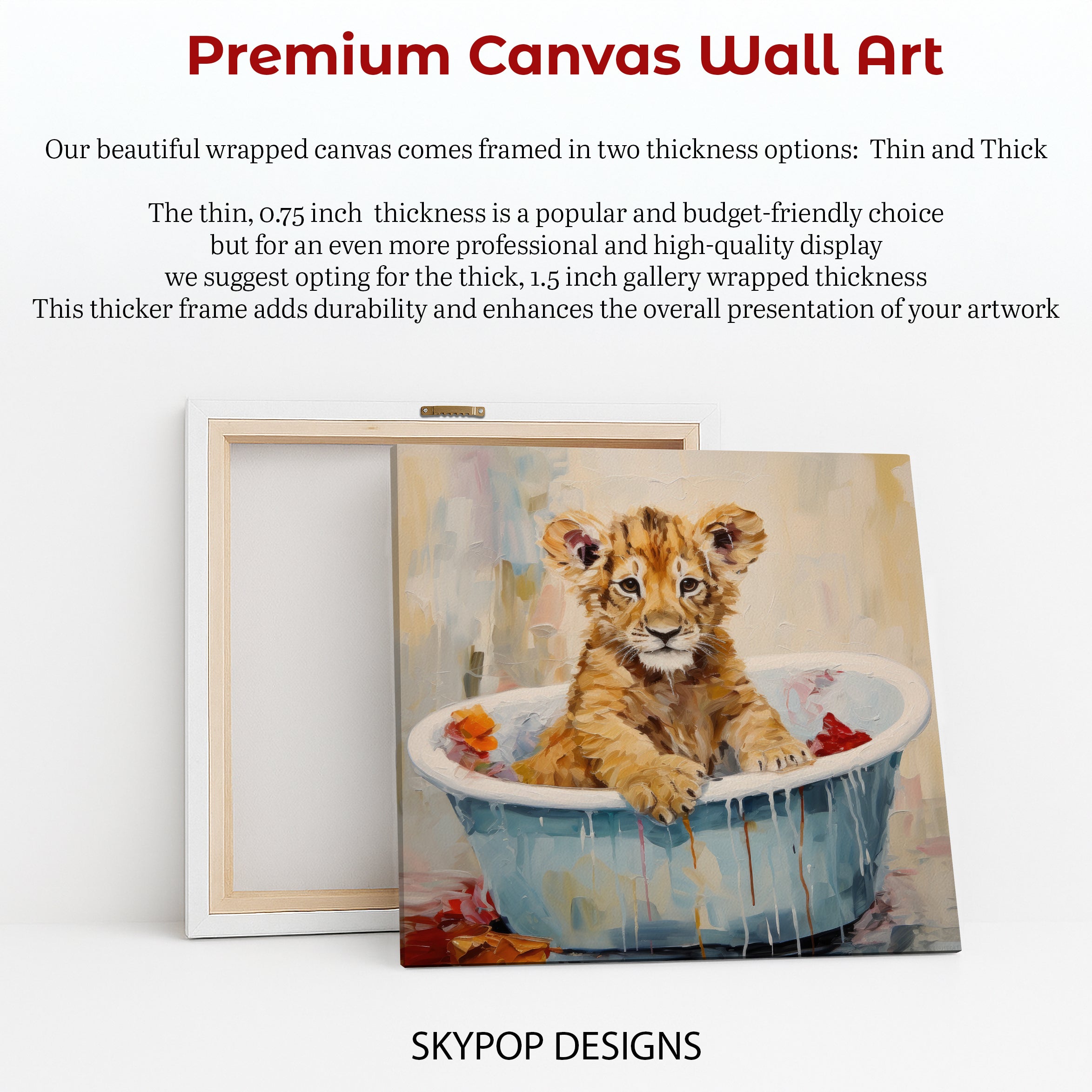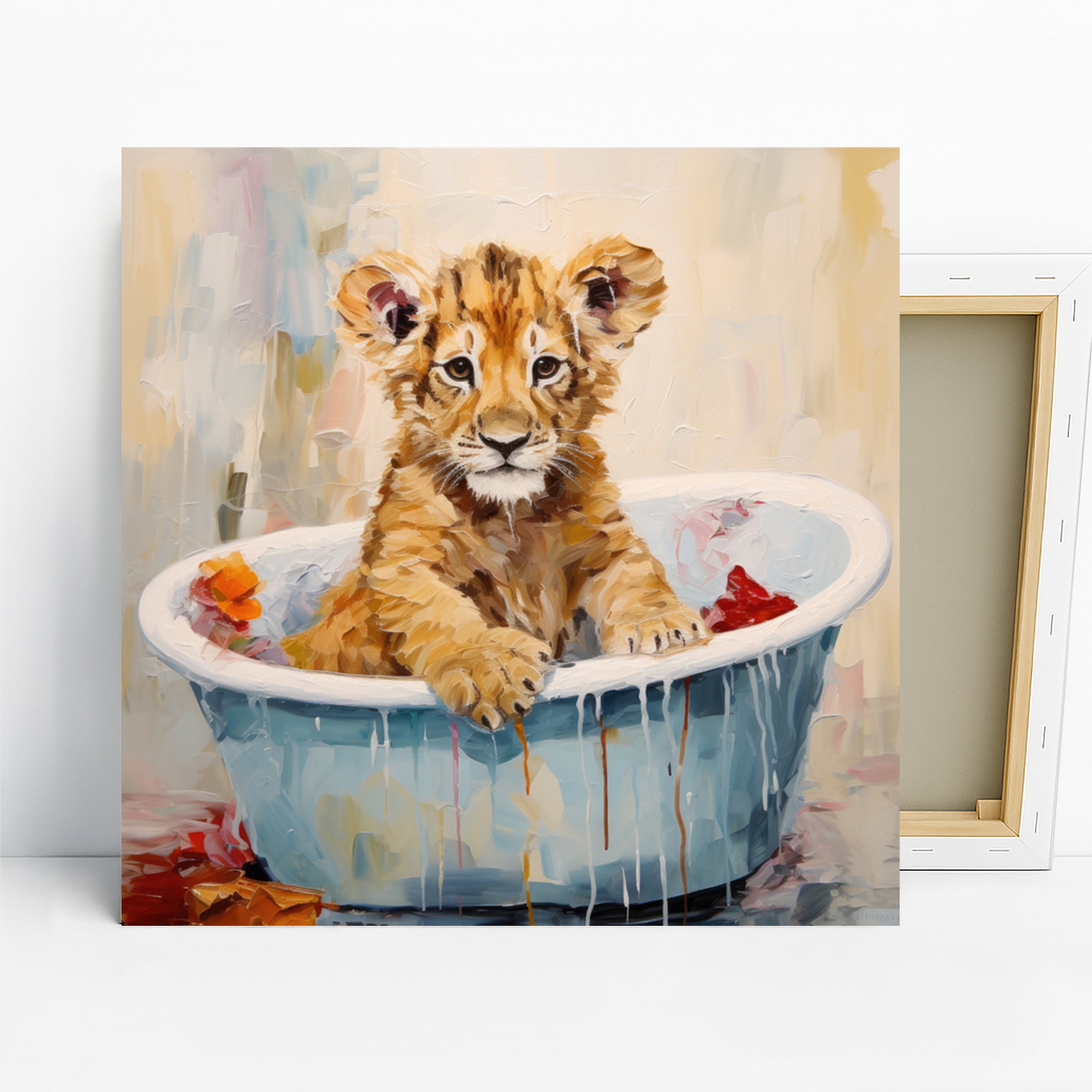 Keywords: Lion cub art, Bathtime canvas, Wall art, Animal art, Contemporary art, Whimsical art, Modern decor, Minimalist decor, Bohemian decor, Living room art, Children's room decor, Nursery art, Bedroom decor, Beige wall art, Multicolor art, White lion cub, Orange accents, Adorable art, Canvas poster, Home decor, Playful oasis, Heartwarming art, Impressionistic style, Lion cub poster, Unique wall art, Housewarming gift, Birthday gift, Holiday gift, Joyful art, Nature inspired art