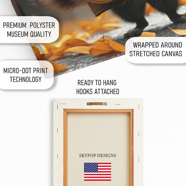 Keywords: Raccoon art, Guitar serenade, Whimsical wall art, Animal canvas print, Retro decor, Bohemian style, Contemporary art, Farmhouse decor, Living room art, Children's room decor, Bedroom art, Entryway art, Brown art, Yellow art, Multicolor artwork, Orange accents, Music lover gift, Nature enthusiast art, Autumn leaves print, Canvas wall art, Wall decor, Home accents, Cozy atmosphere, Cheerful vibe, Playful art, Trendy art, Unique wall art, High-quality canvas, Raccoon poster