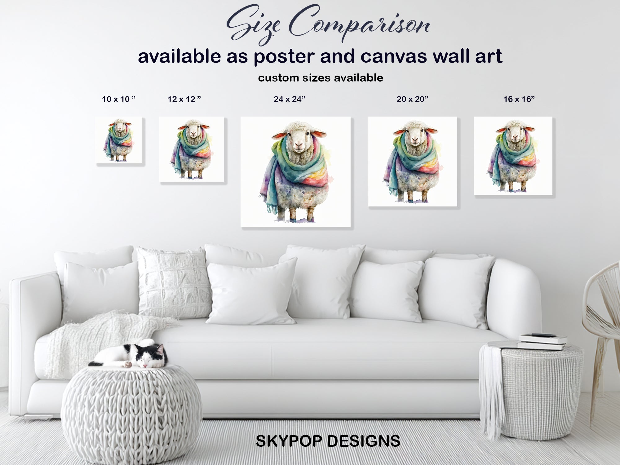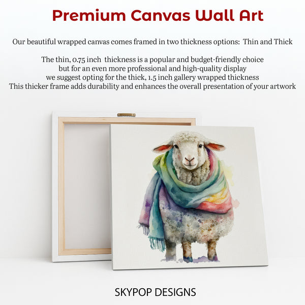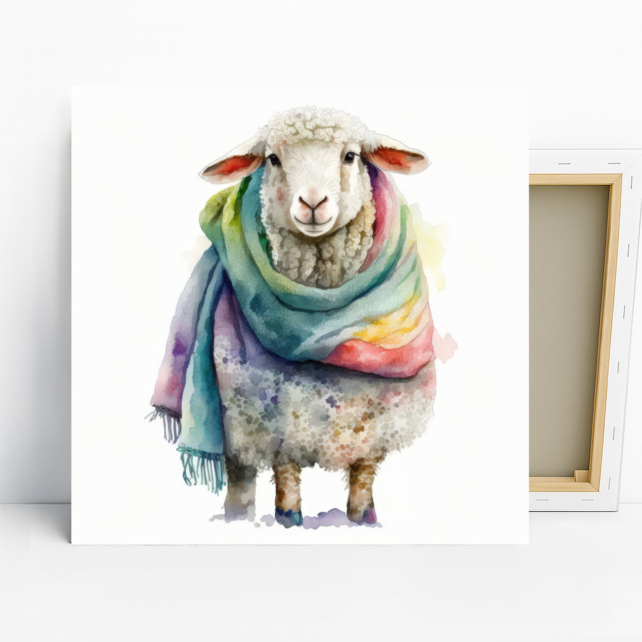 Bring charm and color into your home with this delightful Sheep canvas wall art, featuring a fluffy sheep wrapped in a vibrant rainbow scarf. The watercolor-inspired style and soft lines create a captivating and heartwarming piece of animal art, perfect for transforming any living room or bedroom. This whimsical wall art adds a touch of cozy comfort and cheerful personality, making it an ideal choice for bohemian, farmhouse, or Scandinavian decor styles. The stunning multicolor scarf pops against the sheep's white fleece, symbolizing warmth, positivity, and gentle joy. This versatile poster or canvas wall art is perfect for creating a cozy atmosphere in a child's room or nursery. It serves as a wonderful housewarming gift or a cheerful addition to your seasonal decor. The high-quality printing ensures the vibrant colors and intricate details of the watercolor effect are beautifully preserved, making this sheep artwork a standout piece. Elevate your space with this unique blend of animal art and inviting colors. Showcase your love for charming farm animals and bring a smile to your face every day with this unique sheep canvas print.