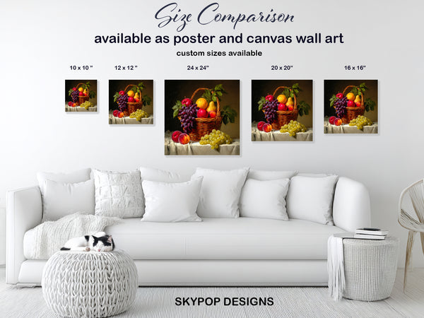 Bring the rich bounty of nature into your home with this stunning fruit basket canvas wall art. Featuring a classic still life composition, this piece showcases a beautifully woven basket overflowing with vibrant red apples, golden pears, and lush purple and green grapes. The Impressionist style, with its visible brushstrokes, adds a timeless and artistic quality perfect for traditional or farmhouse decor. This captivating poster art will transform your kitchen or dining room into a warm and inviting space, while also enhancing your living room or entryway. The rich colors evoke feelings of abundance and contentment, making this canvas art a delightful addition to any home. It’s an ideal gift for housewarmings, birthdays, or holidays, bringing a touch of rustic charm and elegance. Showcase your appreciation for nature’s finest with this striking piece of wall art that complements rustic and country decor styles beautifully. Elevate your space with this timeless fruit still life, a perfect blend of artistry and natural beauty. This versatile artwork is available in various sizes to fit any wall, ensuring a perfect fit for your home. Add a touch of classic beauty to your everyday life with this exquisite fruit basket canvas. Shop this delightful piece today and let it inspire your home’s aesthetic.