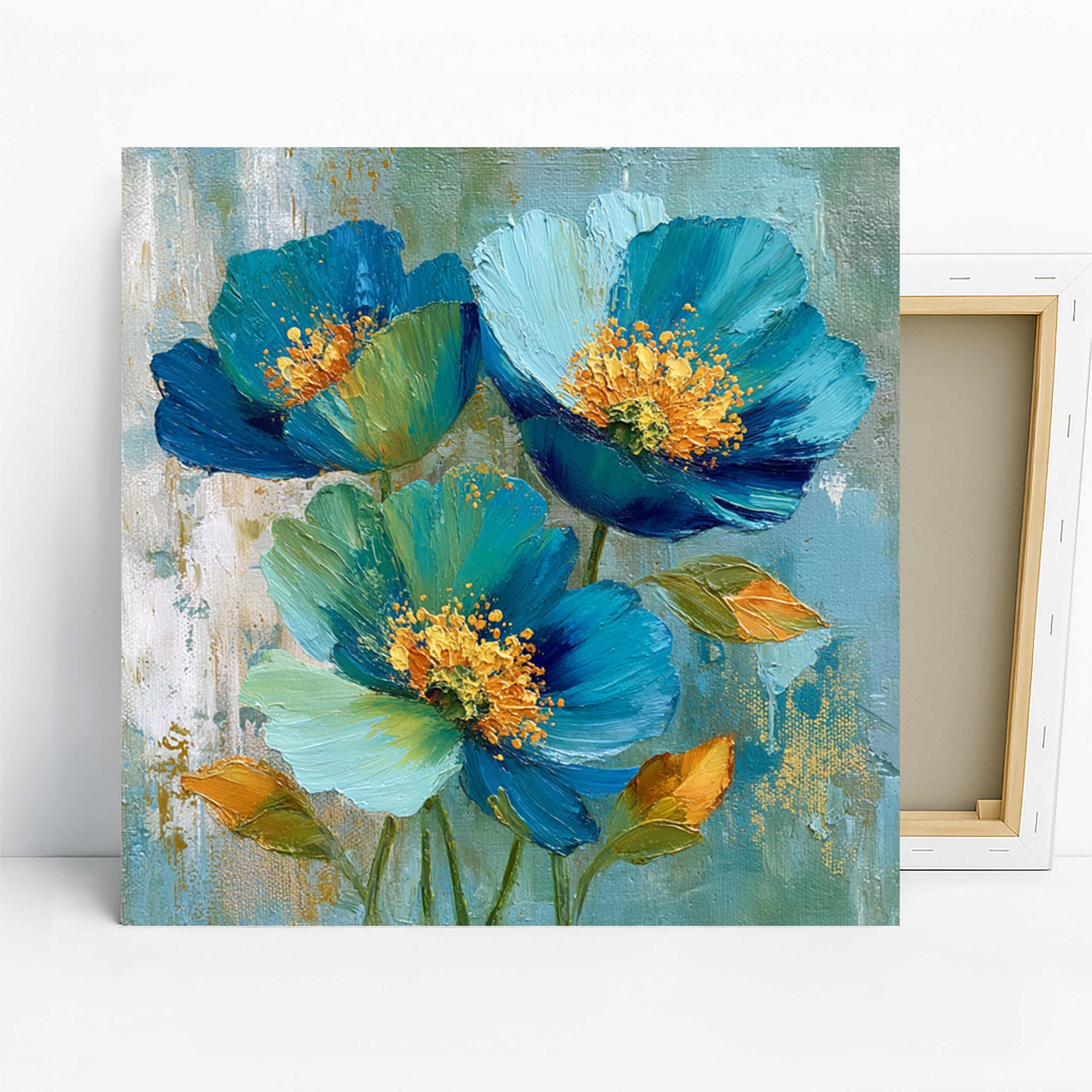 Elevate your living space with this stunning floral canvas wall art, featuring vibrant blue and teal blooms with striking gold accents. This captivating poster artwork transforms any room with its textured, Impressionistic style, bringing the beauty of nature indoors. The rich blue and green tones evoke a sense of calm and serenity, while the pops of gold add a touch of luxury. Perfect for contemporary and coastal decor styles, this canvas wall art enhances living rooms, bedrooms, and entryways. Its striking visual appeal makes it an ideal focal point, adding a splash of vibrant color and artistic flair. Showcasing the beauty of floral arrangements with a tactile, painterly finish, this piece is sure to inspire and impress. The detailed brushstrokes create a sense of depth and movement on this beautiful canvas wall art. Whether you're looking to refresh your home decor or find a thoughtful gift for a housewarming or birthday, this versatile artwork complements various interior designs. High-quality printing ensures the rich colors and textures of this poster are beautifully preserved. Bring the outdoors in and create a peaceful, inviting atmosphere with this exquisite floral artwork. Transform your home with this breathtaking blue floral canvas art today.