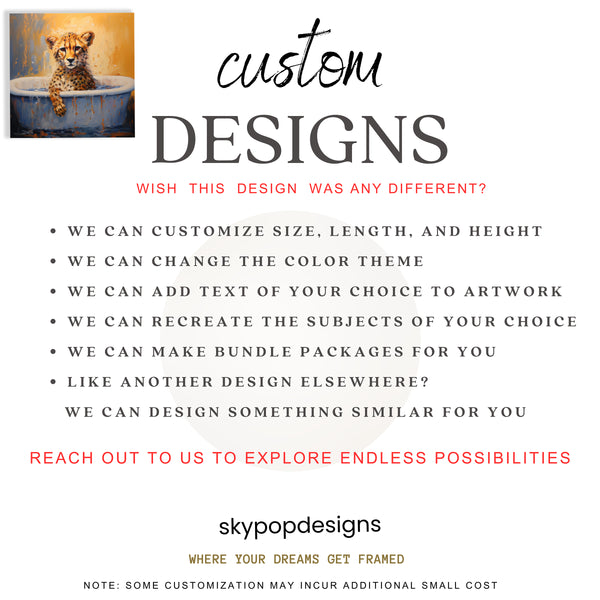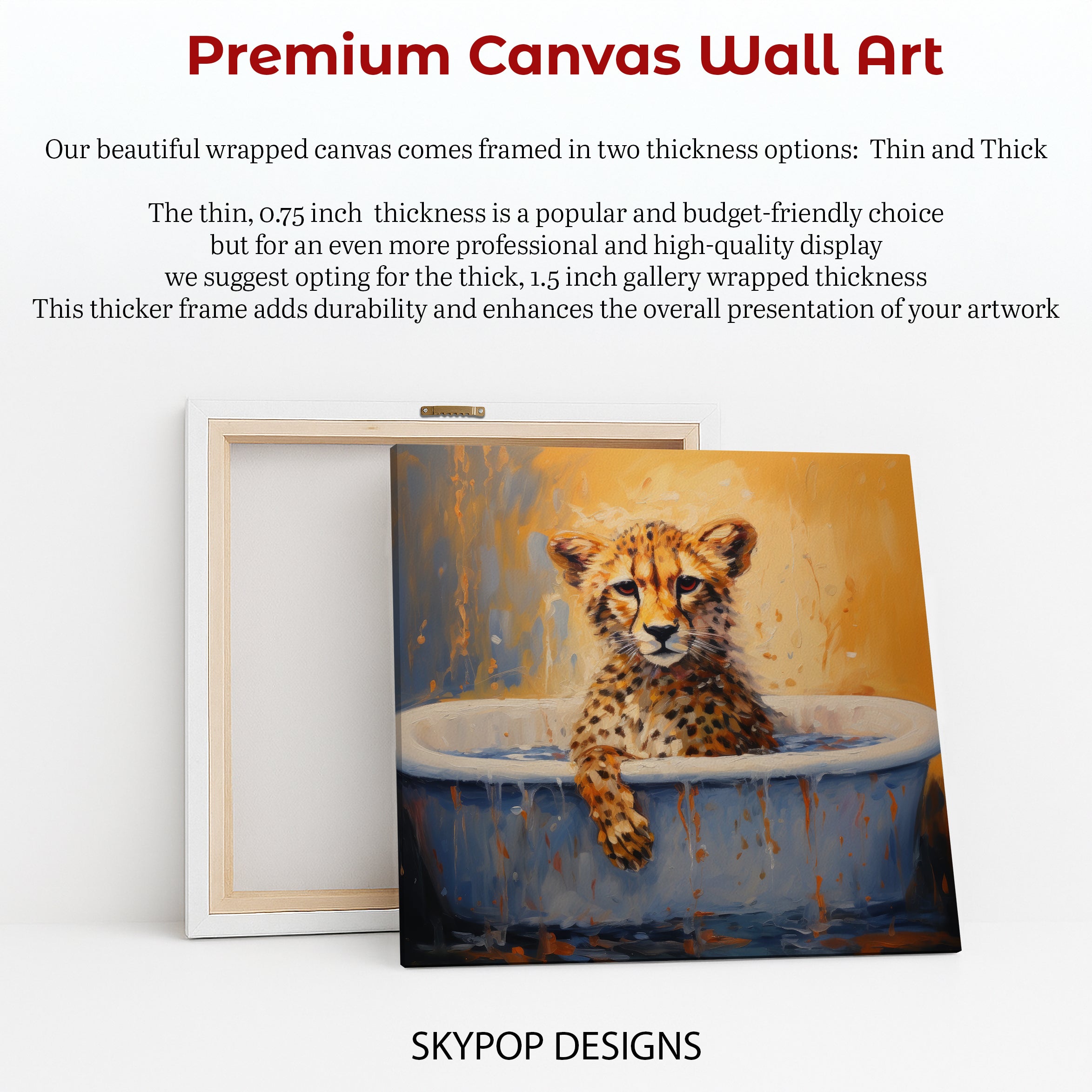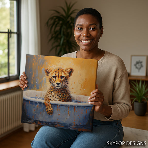 Transform your space with this adorable baby cheetah canvas wall art, showcasing the wild cat enjoying a bubbly bath. The striking blend of orange, blue, and white hues creates a captivating and heartwarming scene that will elevate any room. This unique poster or canvas wall art is perfect for anyone looking to add a touch of playful charm and contemporary flair to their home decor. Ideal for a modern bathroom, a cozy children's room, or even a bohemian-inspired living area, this piece brings a unique personality to your walls. The vibrant colors and expressive brushstrokes on this canvas wall art evoke a sense of joy and lightheartedness, enhancing the ambiance of your chosen space. This piece serves as a wonderful conversation starter and a delightful gift for housewarmings, birthdays, or holidays for any animal lover. Available in various sizes, this high-quality canvas print ensures the charming details of the baby cheetah and its bathwater are vividly represented. Elevate your home decor with this eye-catching cheetah poster that celebrates the unexpected moments of wild creatures. Make this whimsical animal art the centerpiece of your wall decor and infuse your living space with a splash of color and a touch of endearing charm. Add this delightful cheetah canvas art to your collection and transform your room into a sanctuary of joy and style today.