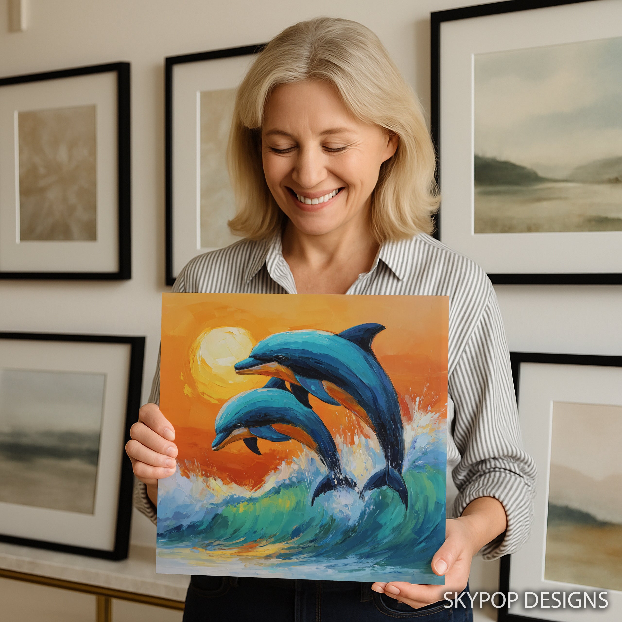 Keywords: Dolphin Canvas Art, Ocean Wall Art, Coastal Decor, Modern Art, Bohemian Style, Living Room Art, Bedroom Art, Bathroom Art, Entryway Art, Blue Wall Art, Orange Wall Art, Multicolor Art, Yellow Accents, Dolphin Artwork, Nature Art, Animal Wall Art, Waves Canvas, Contemporary Art, Beach Decor, Nautical Decor, Ocean Photography, Marine Life Art, Impressionistic Art, Wall Decor, Home Decor, Gift for Ocean Lovers, Housewarming Gift, Birthday Gift, Vibrant Art, Seascape Art