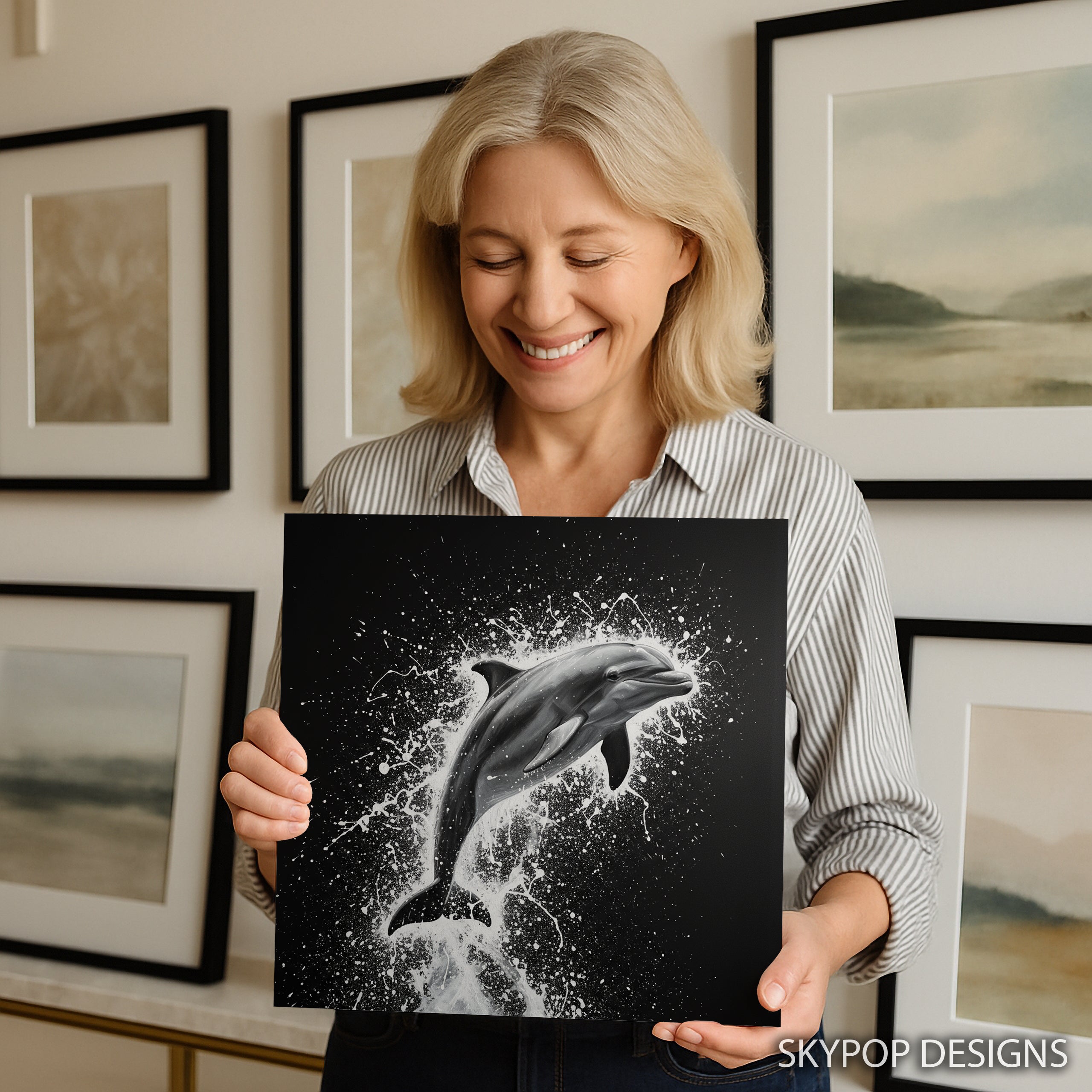 Transform your space with this striking dolphin canvas wall art featuring a dynamic dolphin leaping through a splash of water. The dramatic black and white palette and contemporary style create a captivating focal point that instantly elevates any room. This stunning poster or canvas wall art is perfect for modern living rooms, serene bathrooms, or inspiring offices. The bold contrast of the dolphin against the black background, with the explosive white water, conveys a sense of energy and freedom, making this artwork a true conversation starter. Ideal for coastal decor enthusiasts, this piece adds a touch of the ocean's majesty to minimalist spaces while maintaining sophisticated appeal. The high-quality printing captures every detail of the splashing water and the dolphin's sleek form, ensuring this canvas wall art is a statement piece. Whether you're looking to enhance your home decor or find a unique gift for ocean lovers, this versatile artwork fits seamlessly into various interior styles. Celebrate the beauty of marine life with this breathtaking dolphin print that brings a sense of movement and purity to your walls. Elevate your home's atmosphere with this unique blend of animal art and modern design that captures the wild spirit of the sea. Make this powerful dolphin artwork the highlight of your wall art collection today.