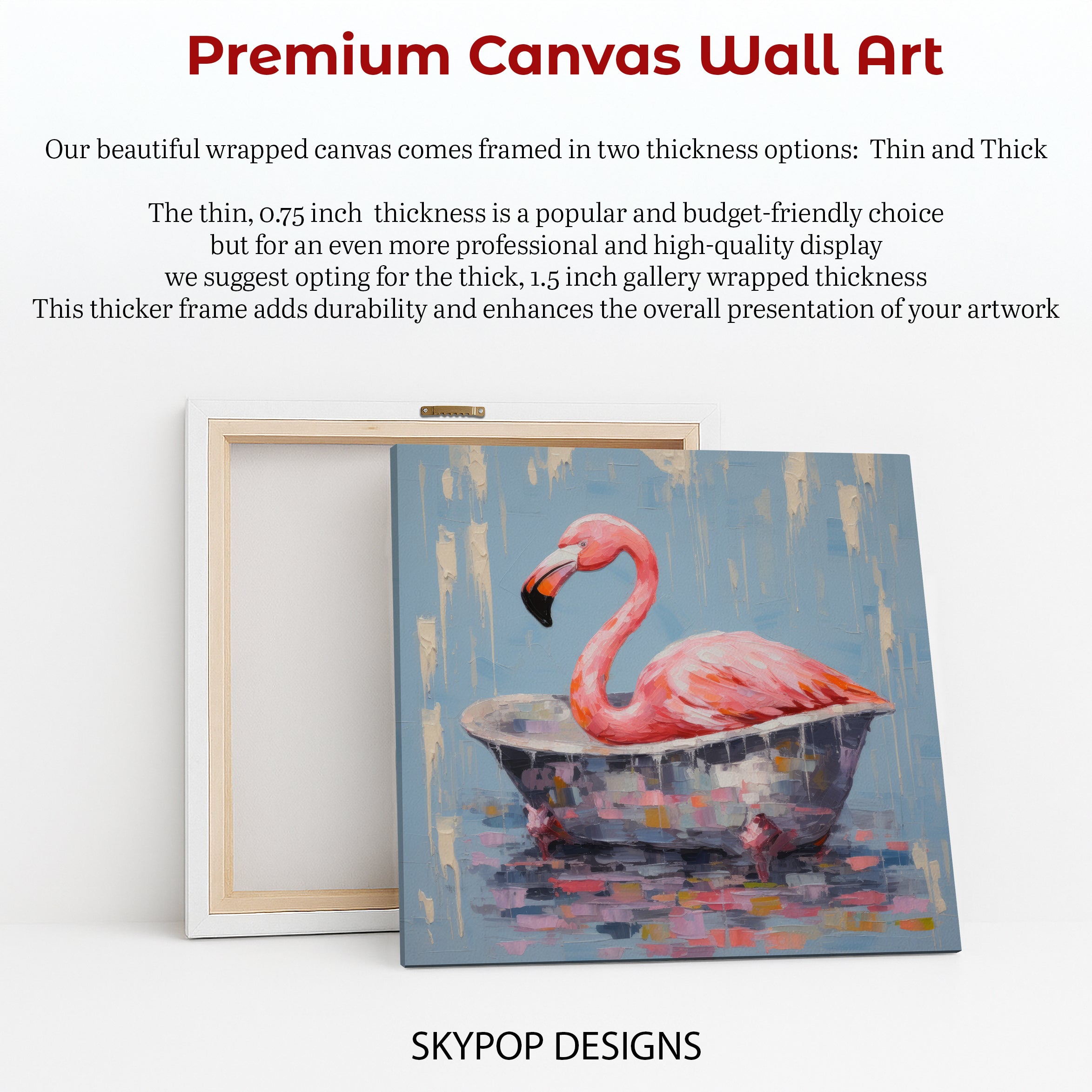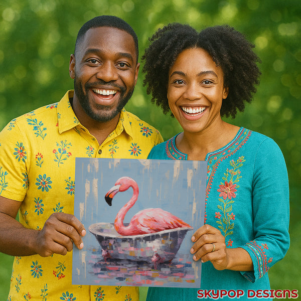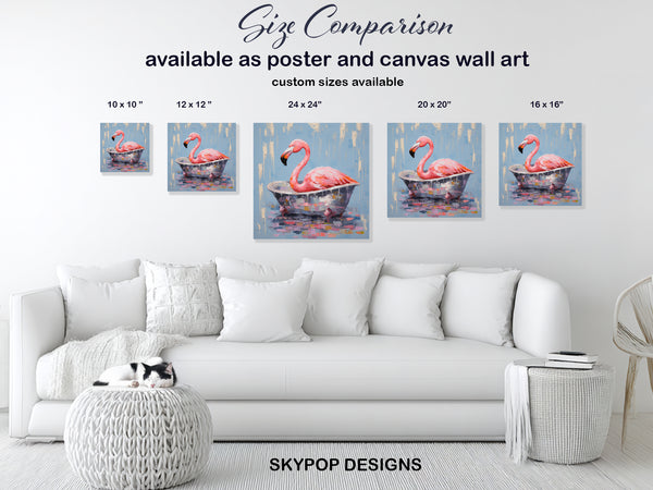 Keywords: Flamingo Art, Canvas Wall Art, Living Room Decor, Bathroom Art, Bedroom Wall Art, Sunroom Decor, Bohemian Decor, Modern Home Decor, Coastal Vibe, Abstract Art, Animal Art, Contemporary Art, Pink Flamingo, Blue Background, Multicolor Art, White Accents, Bathtime Bliss, Textured Brushstrokes, Whimsical Art, Playful Decor, Vibrant Wall Art, Joyful Atmosphere, Relaxing Decor, Eclectic Decor, Statement Piece, Home Decor Gift, Housewarming Gift, Birthday Gift, Animal Lover Gift, Unique Wall Art