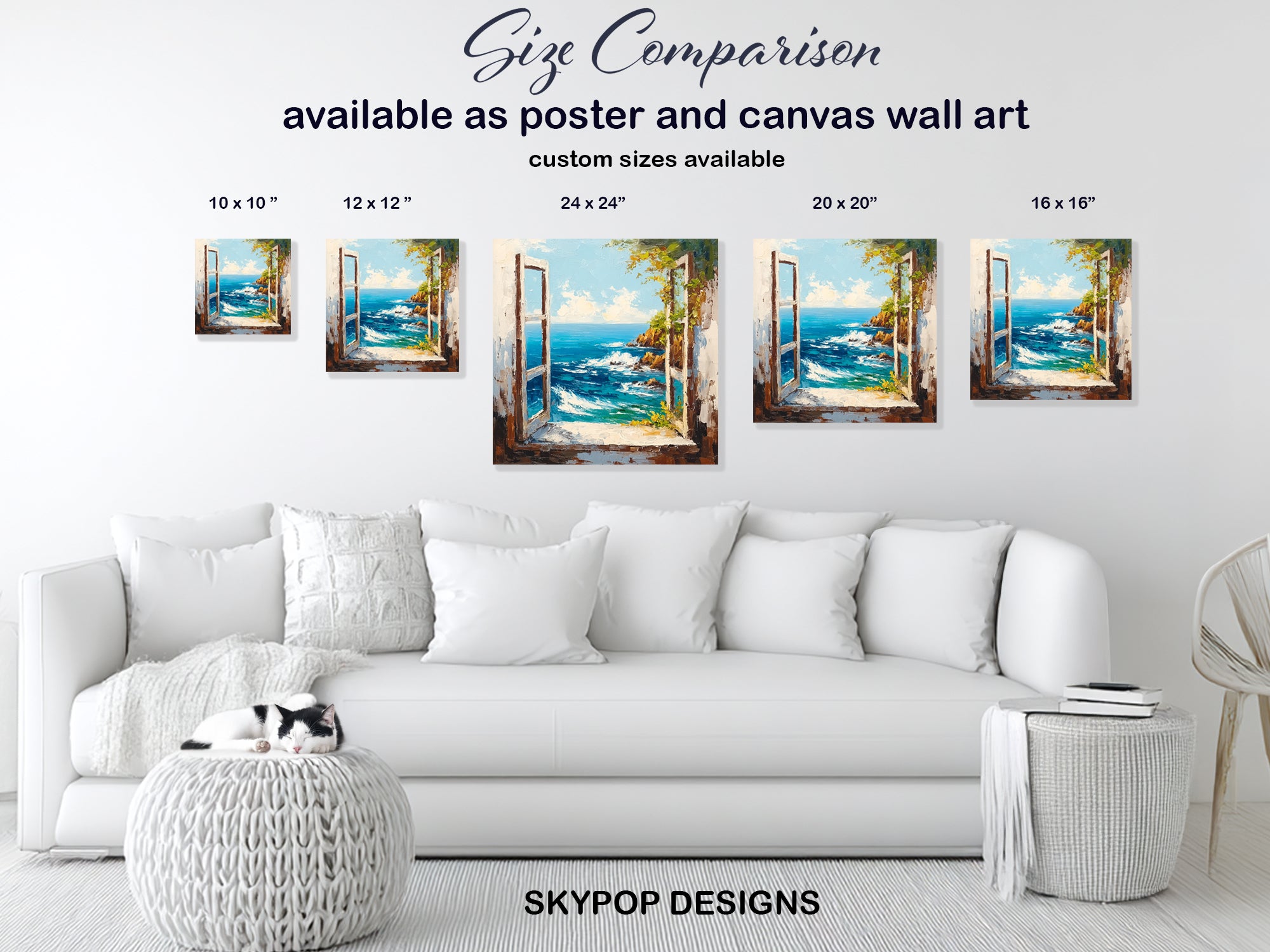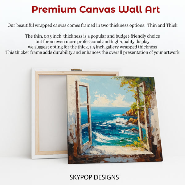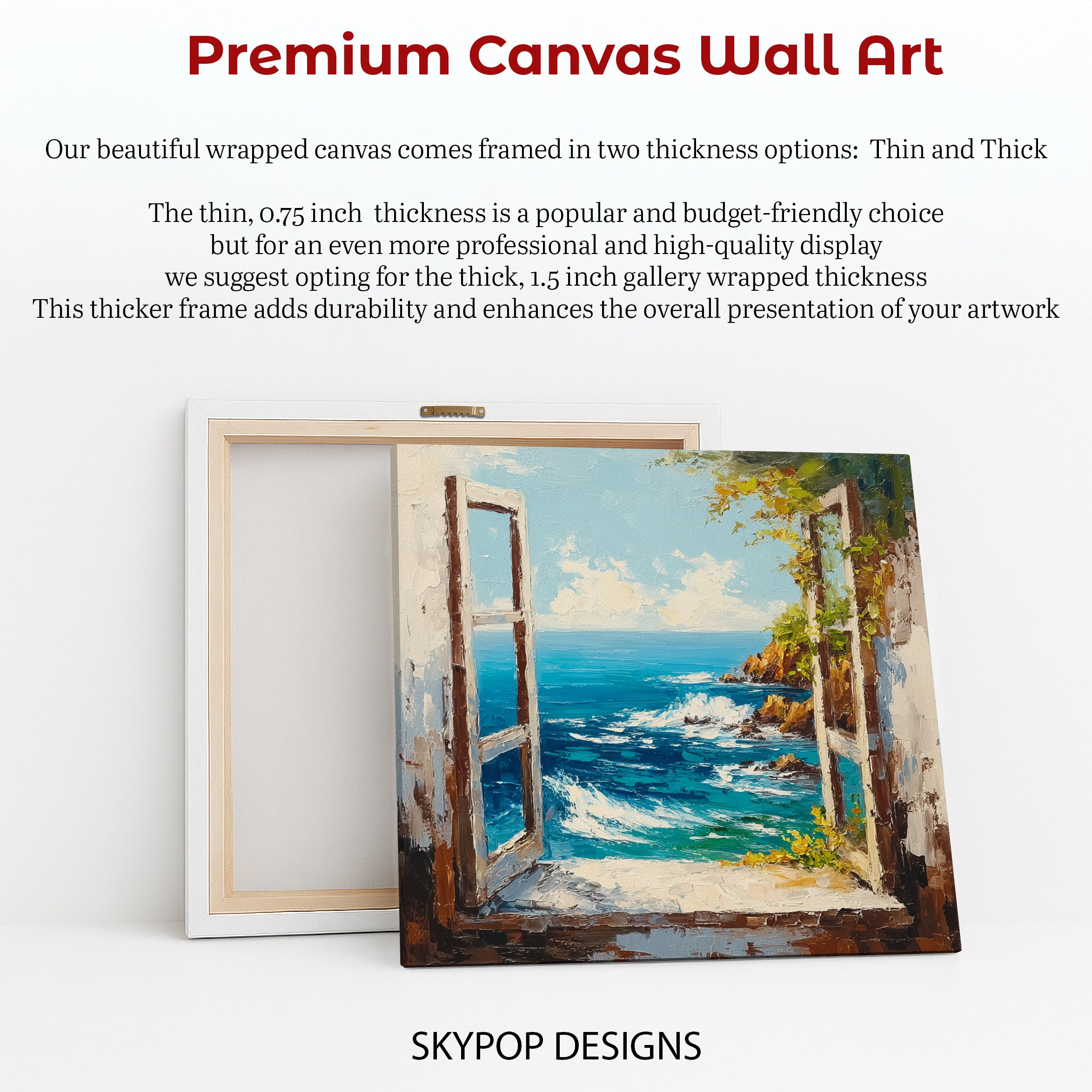 Bring the beauty of the coast into your home with this stunning Mediterranean Ocean View canvas wall art. This captivating seascape painting, rendered in a vibrant Impressionist style, showcases the raw power of the ocean crashing against rocky shorelines, framed by an inviting open window. The rich blues and greens of the water combined with the earthy tones of the cliffs and the classic white windowsill create a serene yet dynamic focal point. This impressive canvas wall art is ideal for transforming any living room or bedroom into a tranquil oasis. It makes a perfect addition to coastal or Tuscan decor themes, providing a timeless elegance that complements traditional settings. The textured brushwork of this poster adds depth and dimension, mimicking the tactile quality of a classic oil painting. Enhance your entryway or dining room with this breathtaking piece that evokes feelings of peace and wanderlust. It's an excellent gift for housewarmings, birthdays, or holidays, offering a unique window to a beautiful world. Elevate your home decor with this high-quality canvas print that brings the refreshing ocean air and sunlight right into your space. This versatile artwork also functions beautifully as a poster, offering accessible art for any budget. Celebrate the beauty of nature and inspire a sense of calm with this exquisite ocean-themed wall art. Transform your living space today with this piece of coastal art that captures the essence of a Mediterranean escape.
